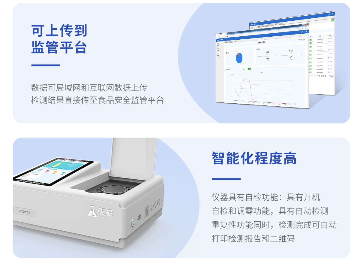 | 儀器采用臺式一體化系統(tǒng)檢測技術(shù),將分光光度模塊、新型農(nóng)殘檢測模塊、數(shù)字化管理模塊、無線通訊模塊高度集成于一體,支持檢測200種食品安全檢測項(xiàng)目,同時預(yù)留升級檢測方法。 | 儀器檢測模塊標(biāo)準(zhǔn)化、智能化,可隨意自由組合。檢測箱體內(nèi)置多個標(biāo)準(zhǔn)檢測單元,檢測模塊可以調(diào)整配置。 | 儀器采用全新安卓智能系統(tǒng),主控芯片采用 ARM Cortex-A7,RK3288/4核處理器,10.1寸高清液晶觸摸豎屏,更加**的UI交互界面,運(yùn)轉(zhuǎn)快捷;儀器配備無線通信模塊: 4G(APN)通訊模塊、Wifi模塊,藍(lán)牙傳輸,同時具有雙USB接口以及RJ45接口能以多種方式實(shí)現(xiàn)數(shù)據(jù)保存和數(shù)據(jù)傳輸功能。 | 創(chuàng)新檢測模式: | ★檢測通道:≥12通道;采用精密旋轉(zhuǎn)比色池設(shè)計,使用同芯片同光源校準(zhǔn)精度,解決不同光源之間的誤差值。1-12通道間誤差0.1%。(**號:ZL202022821055.2) | ★儀器具有自動識別比色皿檢測功能,即:將樣品比色皿放入儀器后,點(diǎn)擊樣品檢測,儀器自動識別比色皿進(jìn)行通道檢測。 | 進(jìn)口高精光源: | 高精度進(jìn)口四波長冷光源,通道配置 410、520、590、630nm 波長光源,一個光源芯片驅(qū)動一個光源,誤差極小,每臺設(shè)備單獨(dú)**校準(zhǔn)光源,**比對,同時參照四種不同波段光源全方位覆蓋市面上99%的農(nóng)殘食品項(xiàng)目檢測。 | 智能化操作系統(tǒng): | 便捷操作系統(tǒng):設(shè)備檢測時可在同一檢測界面自動對應(yīng)相關(guān)檢測通道一次性選擇1-12個樣品名稱,無須退出界面,節(jié)省操作時間。 | 數(shù)據(jù)集成系統(tǒng):設(shè)備首頁自動統(tǒng)計檢測數(shù)據(jù)包含:周檢測數(shù)據(jù)、月檢測數(shù)據(jù),全部檢測總數(shù)量,均包含檢測總數(shù),合格數(shù),不合格數(shù),以及相關(guān)柱形分析圖,對各項(xiàng)檢測數(shù)據(jù)清晰掌握,無需電腦查詢,更加快捷直觀。 | 項(xiàng)目預(yù)設(shè)系統(tǒng):支持添加單個及多個相同或不相同的任務(wù)預(yù)設(shè),一鍵快速調(diào)取,每一個任務(wù)分別可以設(shè)置不同的樣品、批次、編號、來源、備注、抽樣信息、檢測信息、受檢信息、復(fù)核信息等更多信息。無縫鏈接平臺和APP實(shí)時查看下發(fā)任務(wù)。 | 數(shù)據(jù)監(jiān)管系統(tǒng):同步對接監(jiān)管平臺,數(shù)據(jù)可局域網(wǎng)和互聯(lián)網(wǎng)數(shù)據(jù)上傳,檢測結(jié)果可選擇直接傳至食品安全監(jiān)管平臺。集成OSS輸出存儲服務(wù)、區(qū)分設(shè)備定向管理應(yīng)用,進(jìn)行區(qū)域食品安全監(jiān)管及大數(shù)據(jù)分析處理與數(shù)據(jù)統(tǒng)計,檢測區(qū)域食品安全長短期動態(tài),達(dá)到食品安全問題預(yù)估、預(yù)警。 | 自定義打印系統(tǒng):內(nèi)置全新打印系統(tǒng),新創(chuàng)自定義打印方式,可按需靈活設(shè)置開啟或關(guān)閉:產(chǎn)品合格證(國家農(nóng)業(yè)部標(biāo)準(zhǔn)要求),二維碼,抽樣信息、檢測信息,受檢信息、復(fù)核信息、抽樣日期、檢測日期等信息的打印。 | 系統(tǒng)遠(yuǎn)程更新功能:可定向分客戶分儀器更新系統(tǒng),按照不同客戶后期實(shí)際需求添加項(xiàng)目,無需機(jī)器返廠,即可遠(yuǎn)程實(shí)時升級全新系統(tǒng),節(jié)省時間成本及避免運(yùn)輸造成設(shè)備損壞。 | 儀器主機(jī)采用一體化防水、抗壓、防撞擊、防腐蝕箱體設(shè)計,同時配備交直流供電,可連接車載電源,可選配大容量充電鋰電池,滿足現(xiàn)場野外檢測需求。 | 安全證書,放心保障:儀器具有中國計量科學(xué)研究院校準(zhǔn)證書,**認(rèn)證。 |
