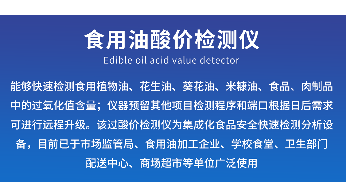 廣泛應(yīng)用于質(zhì)量監(jiān)督檢驗(yàn)、工商管理、油炸食品生產(chǎn)基地、食藥監(jiān)局、衛(wèi)生部門、肉制品食品深加工企業(yè)、商場超市、各大食品安全監(jiān)測系統(tǒng)等單位使用。