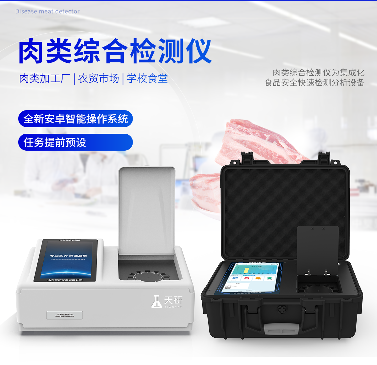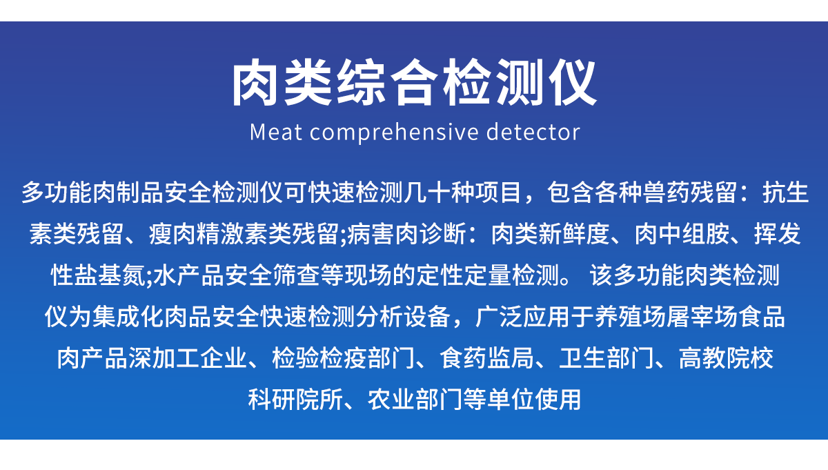 產(chǎn)品介紹: 肉類(lèi)綜合檢測(cè)儀可快速檢測(cè)幾十種項(xiàng)目,包含各種獸藥殘留:抗生素類(lèi)殘留、瘦肉精激素類(lèi)殘留;病害肉診斷:肉類(lèi)新鮮度、肉中組胺、揮發(fā)性鹽基氮;水產(chǎn)品安全篩查等現(xiàn)場(chǎng)的定性定量檢測(cè)。 該肉類(lèi)綜合檢測(cè)儀為集成化肉品安全快速檢測(cè)分析設(shè)備,廣泛應(yīng)用于養(yǎng)殖場(chǎng)、屠宰場(chǎng)、食品肉產(chǎn)品深加工企業(yè)