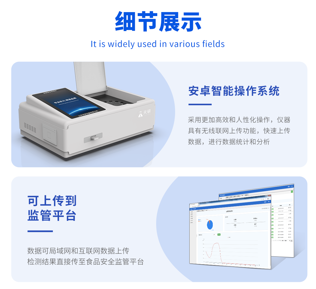| 儀器采用臺(tái)式一體化系統(tǒng)檢測(cè)技術(shù),將分光光度模塊、膠體金檢測(cè)模塊、新型農(nóng)殘檢測(cè)模塊、數(shù)字化管理模塊、無(wú)線通訊模塊高度集成于一體,支持檢測(cè)200種食品安全檢測(cè)項(xiàng)目,同時(shí)預(yù)留升級(jí)檢測(cè)方法。 | 儀器檢測(cè)模塊標(biāo)準(zhǔn)化、智能化,可隨意自由組合。檢測(cè)箱體內(nèi)置多個(gè)標(biāo)準(zhǔn)檢測(cè)單元,檢測(cè)模塊可以調(diào)整配置。 | 儀器采用全新安卓智能系統(tǒng),主控芯片采用 ARM Cortex-A7,RK3288/4核處理器,10.1寸高清液晶觸摸豎屏,更加**的UI交互界面,運(yùn)轉(zhuǎn)快捷;儀器配備無(wú)線通信模塊: 4G(APN)通訊模塊、Wifi模塊,藍(lán)牙傳輸,同時(shí)具有雙USB接口以及RJ45接口能以多種方式實(shí)現(xiàn)數(shù)據(jù)保存和數(shù)據(jù)傳輸功能。 | 創(chuàng)新檢測(cè)模式: | ★檢測(cè)通道:≥12通道;采用精密旋轉(zhuǎn)比色池設(shè)計(jì),使用同芯片同光源校準(zhǔn)精度,解決不同光源之間的誤差值。1-12通道間誤差0.1%。(**號(hào):ZL202022821055.2) | ★儀器具有自動(dòng)識(shí)別比色皿檢測(cè)功能,即:將樣品比色皿放入儀器后,點(diǎn)擊樣品檢測(cè),儀器自動(dòng)識(shí)別比色皿進(jìn)行通道檢測(cè)。 | 進(jìn)口高精光源: | 高精度進(jìn)口四波長(zhǎng)冷光源,通道配置 410、520、590、630nm 波長(zhǎng)光源,一個(gè)光源芯片驅(qū)動(dòng)一個(gè)光源,誤差極小,每臺(tái)設(shè)備單獨(dú)**校準(zhǔn)光源,**比對(duì),同時(shí)參照四種不同波段光源全方位覆蓋市面上99%的農(nóng)殘食品項(xiàng)目檢測(cè)。 | 膠體金模塊檢測(cè)方式: | 采用COMS實(shí)時(shí)成像技術(shù),可采集多個(gè)畫(huà)面,支持3個(gè)金標(biāo)同時(shí)讀卡,通過(guò)不同顏色的灰度變化,一秒精準(zhǔn)得出結(jié)果。 | 智能化操作系統(tǒng): | 便捷操作系統(tǒng):設(shè)備檢測(cè)時(shí)可在同一檢測(cè)界面自動(dòng)對(duì)應(yīng)相關(guān)檢測(cè)通道一次性選擇1-12個(gè)樣品名稱(chēng),無(wú)須退出界面,節(jié)省操作時(shí)間。 | 數(shù)據(jù)集成系統(tǒng):設(shè)備首頁(yè)自動(dòng)統(tǒng)計(jì)檢測(cè)數(shù)據(jù)包含:周檢測(cè)數(shù)據(jù)、月檢測(cè)數(shù)據(jù),全部檢測(cè)總數(shù)量,均包含檢測(cè)總數(shù),合格數(shù),不合格數(shù),以及相關(guān)柱形分析圖,對(duì)各項(xiàng)檢測(cè)數(shù)據(jù)清晰掌握,無(wú)需電腦查詢,更加快捷直觀。 | 項(xiàng)目預(yù)設(shè)系統(tǒng):支持添加單個(gè)及多個(gè)相同或不相同的任務(wù)預(yù)設(shè),一鍵快速調(diào)取,每一個(gè)任務(wù)分別可以設(shè)置不同的樣品、批次、編號(hào)、來(lái)源、備注、抽樣信息、檢測(cè)信息、受檢信息、復(fù)核信息等更多信息。無(wú)縫鏈接平臺(tái)和APP實(shí)時(shí)查看下發(fā)任務(wù)。 | 數(shù)據(jù)監(jiān)管系統(tǒng):同步對(duì)接監(jiān)管平臺(tái),數(shù)據(jù)可局域網(wǎng)和互聯(lián)網(wǎng)數(shù)據(jù)上傳,檢測(cè)結(jié)果可選擇直接傳至食品安全監(jiān)管平臺(tái)。集成OSS輸出存儲(chǔ)服務(wù)、區(qū)分設(shè)備定向管理應(yīng)用,進(jìn)行區(qū)域食品安全監(jiān)管及大數(shù)據(jù)分析處理與數(shù)據(jù)統(tǒng)計(jì),檢測(cè)區(qū)域食品安全長(zhǎng)短期動(dòng)態(tài),達(dá)到食品安全問(wèn)題預(yù)估、預(yù)警。 | 自定義打印系統(tǒng):內(nèi)置全新打印系統(tǒng),新創(chuàng)自定義打印方式,可按需靈活設(shè)置開(kāi)啟或關(guān)閉:產(chǎn)品合格證(國(guó)家農(nóng)業(yè)部標(biāo)準(zhǔn)要求),二維碼,抽樣信息、檢測(cè)信息,受檢信息、復(fù)核信息、抽樣日期、檢測(cè)日期等信息的打印。 | 系統(tǒng)遠(yuǎn)程更新功能:可定向分客戶分儀器更新系統(tǒng),按照不同客戶后期實(shí)際需求添加項(xiàng)目,無(wú)需機(jī)器返廠,即可遠(yuǎn)程實(shí)時(shí)升級(jí)全新系統(tǒng),節(jié)省時(shí)間成本及避免運(yùn)輸造成設(shè)備損壞。 | 儀器主機(jī)采用一體化防水、抗壓、防撞擊、防腐蝕箱體設(shè)計(jì),同時(shí)配備交直流供電,可連接車(chē)載電源,可選配大容量充電鋰電池,滿足現(xiàn)場(chǎng)野外檢測(cè)需求。 | 安全證書(shū),放心保障:儀器具有中國(guó)計(jì)量科學(xué)研究院校準(zhǔn)證書(shū),**認(rèn)證。 |