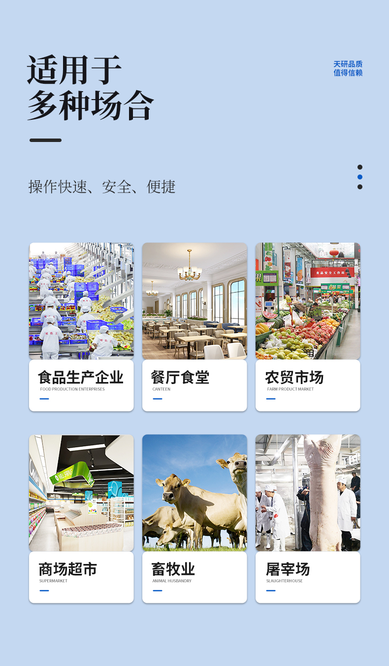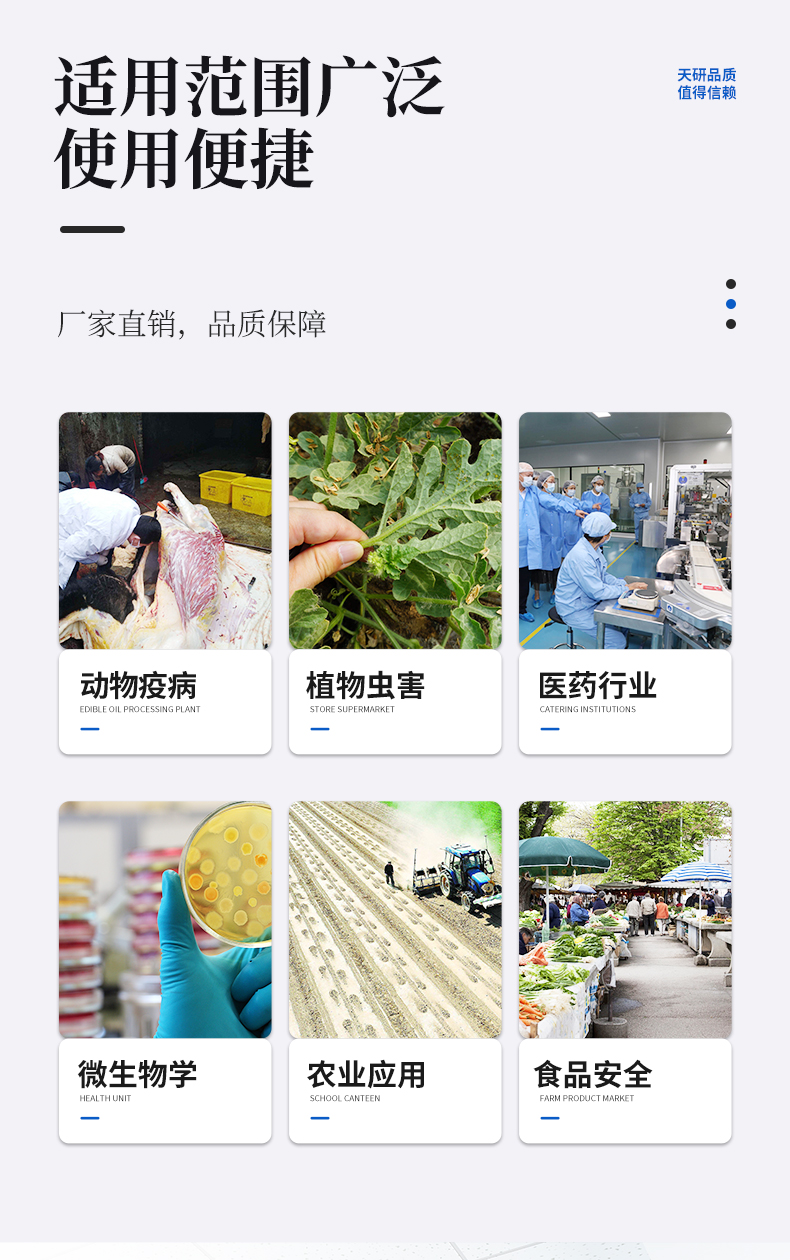 | 瘦肉精激素類(獸藥):鹽酸克倫特羅、沙丁胺醇、萊克多巴胺、己烯雌酚、喹乙醇等 | 抗生素殘留類(獸藥):四環(huán)素類、硝基呋喃類、磺胺類、沙星類、喹諾酮類、慶大霉素、鏈霉素、阿莫西林、紅霉素等 | 水產(chǎn)品安全類:孔雀石綠、氯霉素、呋喃妥因代謝、呋喃西林代謝、呋喃它酮代謝、呋喃唑酮代謝等 | 以及病害肉及肉類新鮮度的擴展檢測。 |