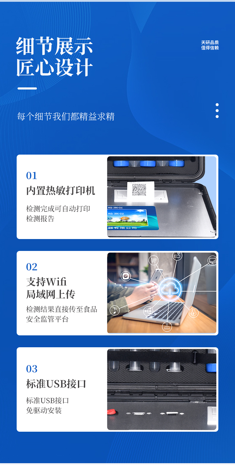 | 安卓智能操作系統(tǒng),采用更加**UI交互界面,儀器具有wifi聯(lián)網(wǎng)上傳、4G聯(lián)網(wǎng)傳輸、GPRS無線遠傳、網(wǎng)線連接功能,快速批量上傳數(shù)據(jù)。 | 智能化程度高,儀器具有自檢功能:具有開機自檢和調(diào)零功能,具有自動檢測重復性功能。 | 新一代高速熱敏打印機,檢測完成可自動打印檢測報告和二維碼。 | 儀器帶有監(jiān)管平臺,數(shù)據(jù)可局域網(wǎng)和互聯(lián)網(wǎng)數(shù)據(jù)上傳,檢測結(jié)果直接傳至食品安全監(jiān)管平臺。進行區(qū)域食品安全監(jiān)管及大數(shù)據(jù)分析處理與數(shù)據(jù)統(tǒng)計,檢測區(qū)域食品安全長短期動態(tài),達到食品安全問題預估、預警 | 一體化便攜式快檢設備,滿足現(xiàn)場及流動檢測使用需求,能夠在同一軟件下實現(xiàn)所有檢測項目的檢測,并可通過同一窗口直觀顯示檢測結(jié)果。 | 膠體金模塊檢測方式:軌道式自動傳輸掃描,檢測完成后自動退出檢測卡。 | 一體化主機,包含食品安全檢測模塊、多通道農(nóng)藥殘留檢測模塊、膠體金免疫層析檢測模塊。 | CT線自動識別,無需手動調(diào)整。 | 儀器具有品類多種類樣品菜單庫,可靈活選擇檢測樣品,不同的檢測通道可同時檢測不同的樣品項目。。 | 樣品處理簡單省力,整體操作快速、安全、便捷。 | 儀器具有自身保護功能,可設置用戶名及密碼,防止非工作人員操作等。 | 高靈敏度,高檢測精度,高重復性精度,掃描式高精度光學傳感器。 | 儀器具有重新校準、鎖定、恢復出廠設置功能。 | 內(nèi)置強大的數(shù)據(jù)庫,可在儀器上直接選擇樣品名稱、檢測指標、送檢單位等信息,也可在儀器上直接編輯錄入樣品名稱、檢測指標、送檢單位等信息并保存進樣品數(shù)據(jù)庫。 | 儀器具有重新校準、鎖定、恢復出廠設置功能。 | 結(jié)果判定線可修改,對照值標定值可保存,斷電不丟失數(shù)據(jù)。 | 兼容市場上所有的膠體金卡,使用耗材不受限制,極大增強用戶使用體驗。 |