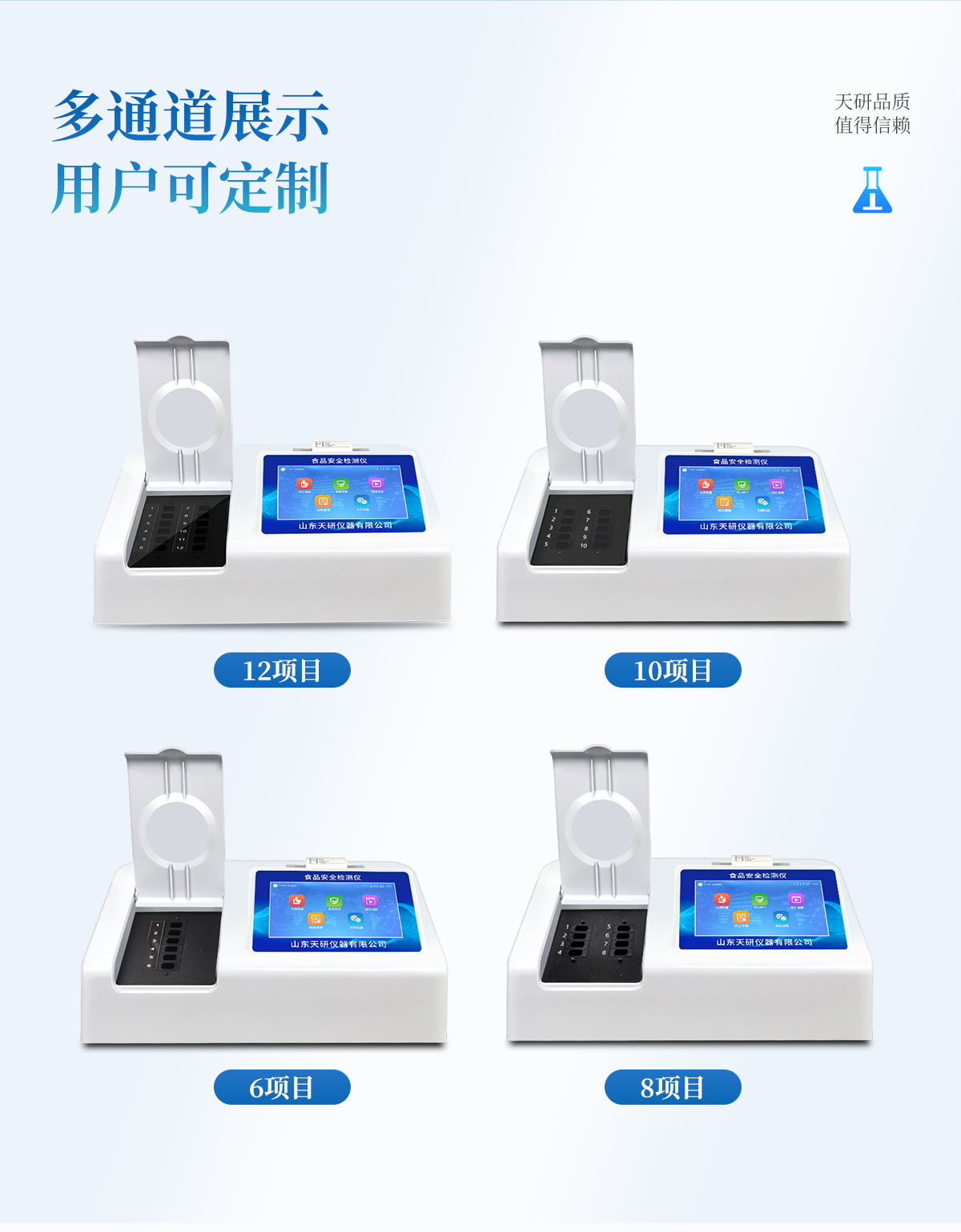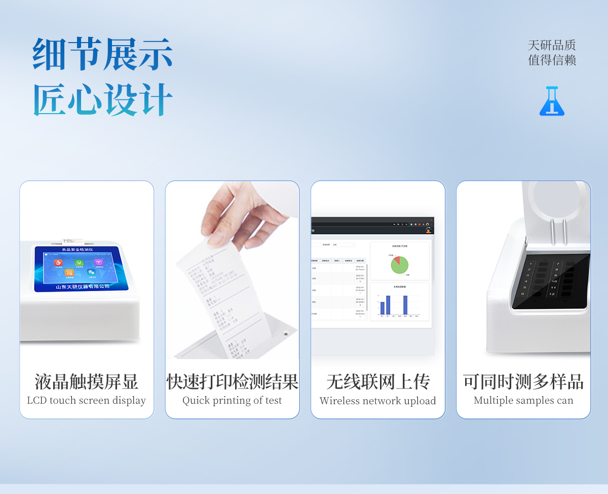 | 安卓智能操作系統(tǒng),采用更加**和人性化操作,儀器具有網(wǎng)線連接、wifi聯(lián)網(wǎng)上傳、GPRS無線遠傳功能,快速上傳數(shù)據(jù)。 | 智能化程度高,儀器具有自檢功能:具有開機自檢和調零功能,具有自動檢測重復性功能。 | 檢測通道:≥12個檢測通道,可以同時測試多個樣品,每個樣品由程序控制分別獨立工作,不會互相干擾。 | 顯示方式:≥8英寸液晶觸摸屏顯示,人性化中文操作界面,讀數(shù)直觀、簡單。 | 配備新一代嵌入式熱敏打印機,可選擇手動打印或者自動打印,檢測完成可自動打印檢測報告和二維碼。 | 光源采用進口超高亮發(fā)光二極管,高精度、穩(wěn)定性強、光源可控、可以關掉不使用的光源,功耗更低。 | 采用USB2.0接口設計,方便數(shù)據(jù)的存貯和移動,并可隨時與計算機直接相連,并且可用計算機控制儀器。實現(xiàn)數(shù)據(jù)查詢、瀏覽、分析、統(tǒng)計、打印等。 | 儀器帶有監(jiān)管平臺。數(shù)據(jù)可局域網(wǎng)和互聯(lián)網(wǎng)數(shù)據(jù)上傳,檢測結果直接傳至食品安全監(jiān)管平臺。進行區(qū)域食品安全監(jiān)管及大數(shù)據(jù)分析處理,檢測區(qū)域食品安全長短期動態(tài),達到食品安全問題預估、預警 | 一體化便攜式快檢設備,滿足現(xiàn)場及流動檢測使用需求,能夠在同一軟件下實現(xiàn)所有檢測項目的檢測,并可通過同一窗口直觀顯示檢測結果。 | 儀器具有多品類多種類樣品菜單庫,可靈活選擇檢測樣品,不同的檢測通道可同時檢測不同的樣品項目。也可在儀器上直接編輯錄入樣品名稱、檢測指標、送檢單位等信息并保存進樣品數(shù)據(jù)庫。 | 樣品處理簡單省力,整體操作快速、安全、便捷。 | 儀器具有自身保護功能,可設置用戶名及密碼,防止非工作人員操作等。 | 高靈敏度,高檢測精度,高重復性精度,掃描式高精度光學傳感器。 | 儀器具有重新校準、鎖定、恢復出廠設置功能。 | 支持U盤存儲。 結果判定線可修改,對照值標定值可保存,斷電不丟失數(shù)據(jù)。 |