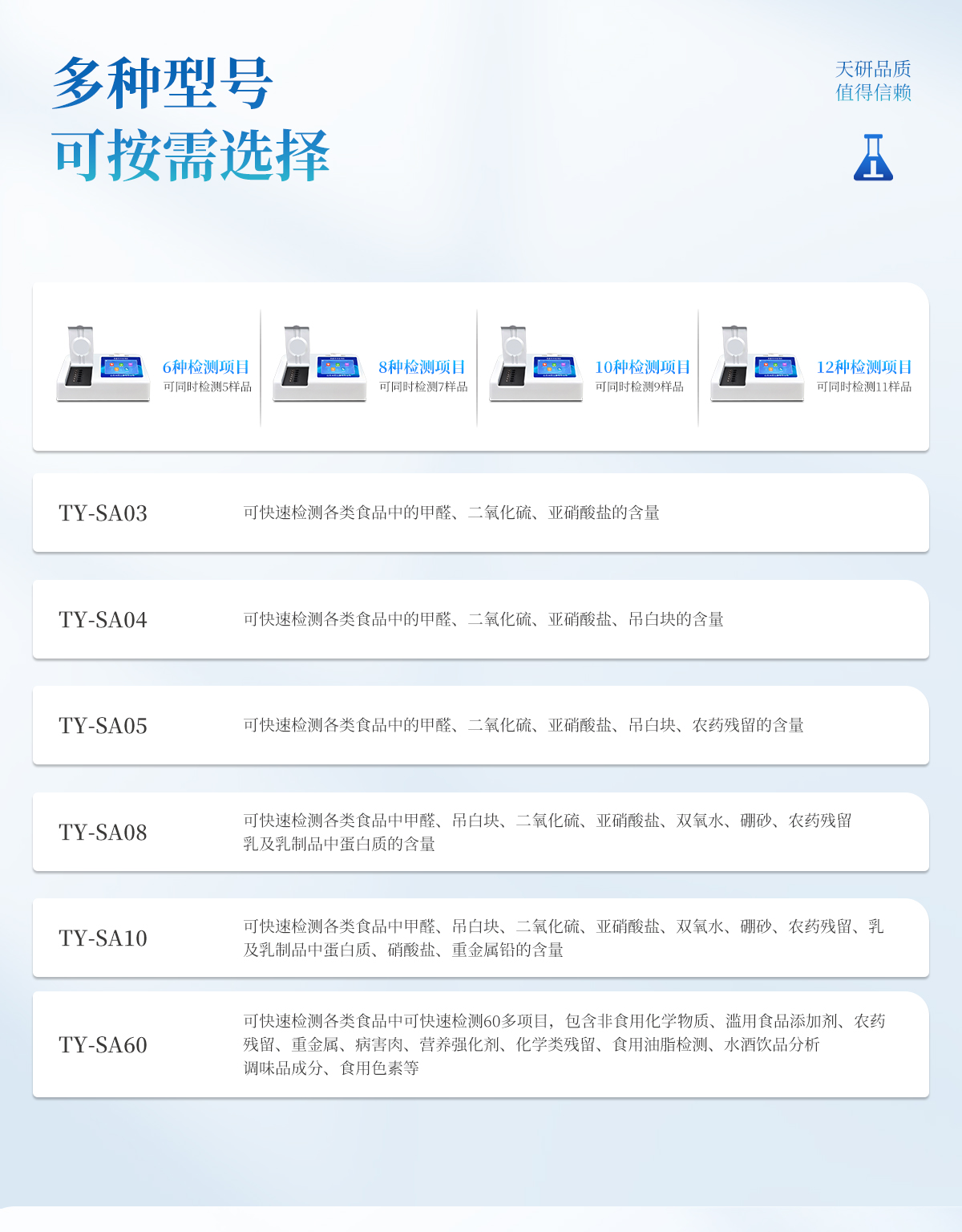 產(chǎn)品介紹: 多功能食品安全檢測(cè)儀可快速檢測(cè)200多項(xiàng)目,包含非食用化學(xué)物質(zhì)、濫用食品添加劑、農(nóng)藥殘留、獸藥殘留、重金屬、病害肉、營(yíng)養(yǎng)強(qiáng)化劑、抗生素類殘留、激素類殘留、真菌毒素類殘留、化學(xué)類殘留等現(xiàn)場(chǎng)的定性定量檢測(cè)。該多功能食品安全檢測(cè)儀為集成化食品安全快速檢測(cè)分析設(shè)備,廣泛應(yīng)用于市場(chǎng)