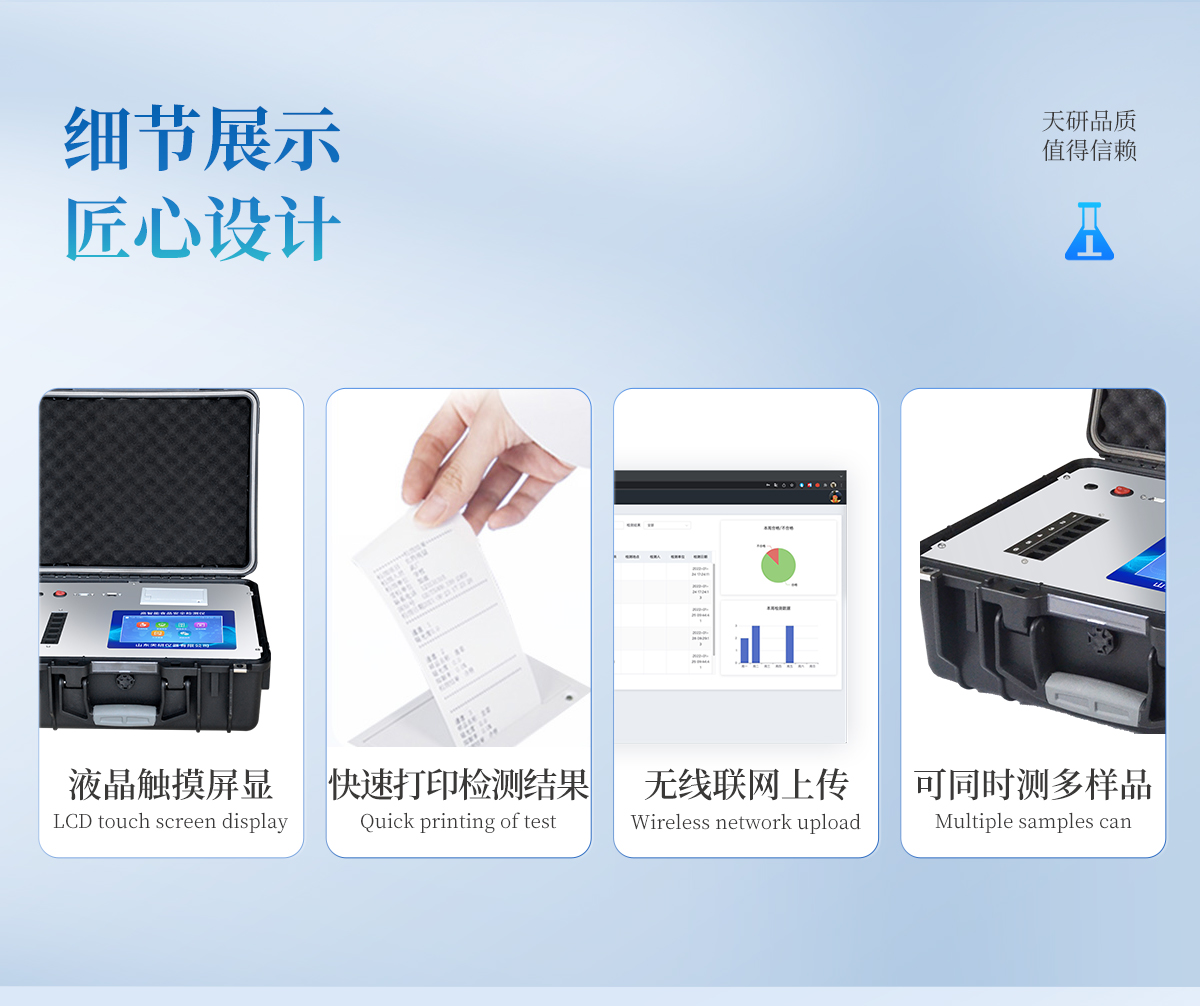 | 安卓智能操作系統(tǒng),采用更加**的UI交互界面,儀器具有wifi聯(lián)網(wǎng)上傳、4G聯(lián)網(wǎng)傳輸、GPRS無(wú)線遠(yuǎn)傳、網(wǎng)線連接功能,快速批量上傳數(shù)據(jù)。 | 智能化程度高,儀器具有自檢功能:具有開(kāi)機(jī)自檢和調(diào)零功能,具有自動(dòng)檢測(cè)重復(fù)性功能。 | 新一代高速熱敏打印機(jī),檢測(cè)完成可自動(dòng)打印或批量打印檢測(cè)報(bào)告和二維碼。 | 儀器帶有監(jiān)管平臺(tái),數(shù)據(jù)可局域網(wǎng)和互聯(lián)網(wǎng)數(shù)據(jù)上傳,檢測(cè)結(jié)果直接傳至食品安全監(jiān)管平臺(tái)。進(jìn)行區(qū)域食品安全監(jiān)管及大數(shù)據(jù)分析處理與數(shù)據(jù)統(tǒng)計(jì),檢測(cè)區(qū)域食品安全長(zhǎng)短期動(dòng)態(tài),達(dá)到食品安全問(wèn)題預(yù)估、預(yù)警 | 一體化主機(jī),包含食品安全檢測(cè)模塊、多通道農(nóng)藥殘留檢測(cè)模塊、膠體金免疫層析檢測(cè)模塊。 | 一體化便攜式快檢設(shè)備,滿(mǎn)足現(xiàn)場(chǎng)及流動(dòng)檢測(cè)使用需求,能夠在同一軟件下實(shí)現(xiàn)所有檢測(cè)項(xiàng)目的檢測(cè),并可通過(guò)同一窗口直觀顯示檢測(cè)結(jié)果。 | 膠體金模塊檢測(cè)方式:軌道式自動(dòng)傳輸掃描,檢測(cè)完成后自動(dòng)退出檢測(cè)卡。 | CT線自動(dòng)識(shí)別,無(wú)需手動(dòng)調(diào)整。 | 內(nèi)置強(qiáng)大的數(shù)據(jù)庫(kù),具有多品類(lèi)多種類(lèi)樣品菜單功能,可靈活選擇檢測(cè)樣品,不同的檢測(cè)通道可同時(shí)檢測(cè)不同的樣品項(xiàng)目。也可在儀器上直接編輯錄入樣品名稱(chēng)、檢測(cè)指標(biāo)、送檢單位等信息并保存進(jìn)樣品數(shù)據(jù)庫(kù)。 | 產(chǎn)品內(nèi)置操作演示視頻,是您身邊的化驗(yàn)指導(dǎo)專(zhuān)家。 | 樣品處理簡(jiǎn)單省力,整體操作快速、安全、便捷。 | 儀器具有自身保護(hù)功能,可設(shè)置用戶(hù)名及密碼,防止非工作人員操作等。 | 高靈敏度,高檢測(cè)精度,高重復(fù)性精度,掃描式高精度光學(xué)傳感器。 | 結(jié)果判定線可修改,對(duì)照值標(biāo)定值可保存,斷電不丟失數(shù)據(jù)。 | 兼容市場(chǎng)上所有的膠體金卡,使用耗材不受限制,極大增強(qiáng)用戶(hù)使用體驗(yàn)。 | 儀器具有重新校準(zhǔn)、鎖定、恢復(fù)出廠設(shè)置功能。 |