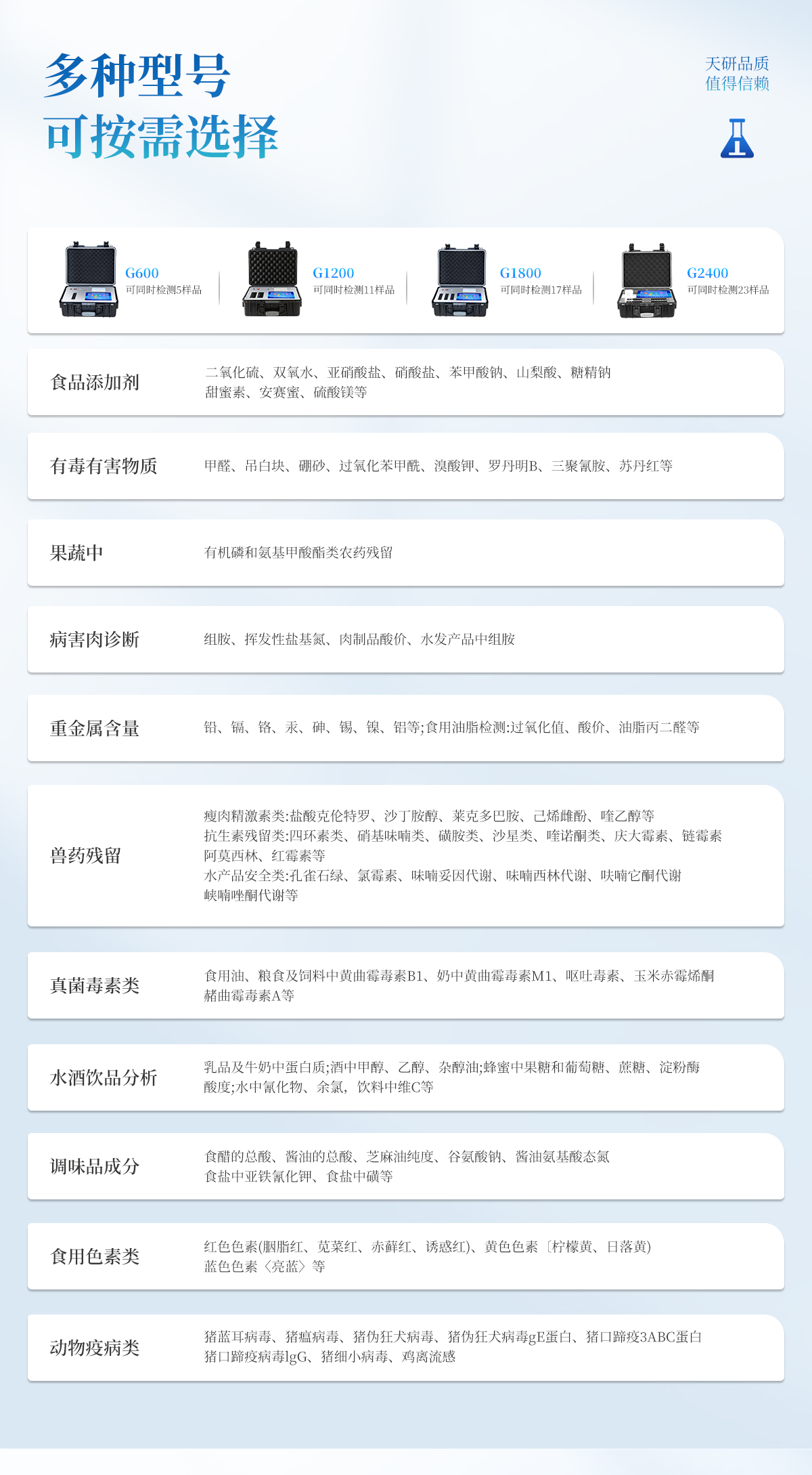 | 食品添加劑:二氧化硫、雙氧水、亞硝酸鹽、硝酸鹽、苯甲酸鈉、山梨酸、糖精鈉、甜蜜素、安賽蜜、硫酸鎂等 | 有毒有害物質(zhì):甲醛、吊白塊、硼砂、過(guò)氧化苯甲酰、溴酸鉀、羅丹明B、三聚氰胺、蘇丹紅等 | 果蔬中:有機(jī)磷和氨基甲酸酯類(lèi)農(nóng)藥殘留; | 病害肉診斷:組胺、揮發(fā)性鹽基氮、肉制品酸價(jià)、水發(fā)產(chǎn)品中組胺 | 重金屬含量:鉛、鎘、鉻、汞、砷、錫、鎳、鋁等;食用油脂檢測(cè):過(guò)氧化值、酸價(jià)、油脂丙二醛等。 | 瘦肉精激素類(lèi)(獸藥):鹽酸克倫特羅、沙丁胺醇、萊克多巴胺、己烯雌酚、喹乙醇等 | 抗生素殘留類(lèi)(獸藥):四環(huán)素類(lèi)、硝基呋喃類(lèi)、磺胺類(lèi)、沙星類(lèi)、喹諾酮類(lèi)、慶大霉素、鏈霉素、阿莫西林、紅霉素等 | 水產(chǎn)品安全類(lèi):孔雀石綠、氯霉素、呋喃妥因代謝、呋喃西林代謝、呋喃它酮代謝、呋喃唑酮代謝等 | 真菌毒素類(lèi):食用油、糧食及飼料中黃曲霉毒素B1、奶中黃曲霉毒素M1、嘔吐毒素、玉米赤霉烯酮、赭曲霉毒素A等 | 水酒飲品分析:乳品及牛奶中蛋白質(zhì);酒中甲醇、乙醇、雜醇油;蜂蜜中果糖和葡萄糖、蔗糖、淀粉酶、酸度;水中氰化物、余氯,飲料中維C等 | 調(diào)味品成分:食醋的總酸、醬油的總酸、芝麻油純度、谷氨酸鈉、醬油氨基酸態(tài)氮、食鹽中亞鐵氰化鉀、食鹽中碘等 | 食用色素類(lèi):紅色色素(胭脂紅、莧菜紅、赤蘚紅、誘惑紅)、黃色色素(檸檬黃、日落黃)、藍(lán)色色素(亮藍(lán))等 | 動(dòng)物疫病類(lèi):豬藍(lán)耳病毒、豬瘟病毒、豬偽狂犬病毒、豬偽狂犬病毒gE蛋白、豬口蹄疫3ABC蛋白、豬口蹄疫病毒IgG、豬細(xì)小病毒、雞禽流感等 |