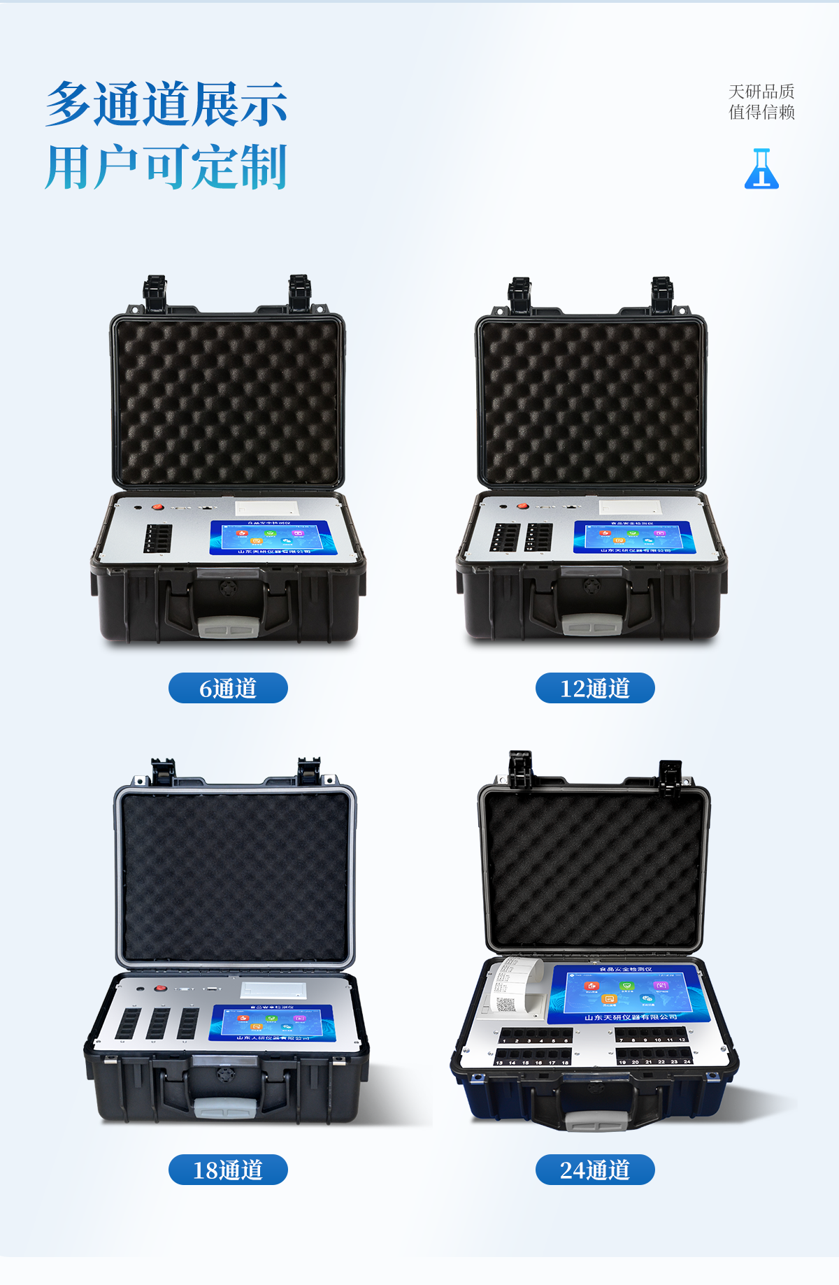 | 主控芯片采用ARM Cortex-A7,RK3288/4核處理器,主頻1.88Ghz,運(yùn)轉(zhuǎn)速度更快速,穩(wěn)定性更強(qiáng)。 | 顯示方式:7英寸液晶觸摸屏顯示,人性化中文操作界面,讀數(shù)直觀、簡(jiǎn)單。 | 交直流兩用,直流12V供電,可連接車(chē)載電源,可配6ah大容量充電鋰電池,方便戶(hù)外流動(dòng)測(cè)試。 | 四波長(zhǎng)冷光源,6個(gè)檢測(cè)通道,每個(gè)通道均配置410、520、590、630nm波長(zhǎng)光源,標(biāo)配**的光路切換裝置,專(zhuān)業(yè)光路切換功能可實(shí)現(xiàn)*多64波長(zhǎng),并且所有檢測(cè)項(xiàng)目可實(shí)現(xiàn)所有通道同時(shí)檢測(cè)。 | 智能恒流穩(wěn)壓,光強(qiáng)自動(dòng)調(diào)節(jié)與校準(zhǔn),長(zhǎng)時(shí)間連續(xù)工作光源無(wú)溫漂現(xiàn)象。 | 內(nèi)置新國(guó)家限量標(biāo)準(zhǔn),與所測(cè)結(jié)果進(jìn)行現(xiàn)場(chǎng)比對(duì),并持續(xù)更新標(biāo)準(zhǔn)。 | 不間斷進(jìn)樣,連續(xù)檢測(cè) | 樣本編號(hào)自動(dòng)累加。 | 數(shù)據(jù)無(wú)線上傳平臺(tái),并可從平臺(tái)導(dǎo)出為Excel表格。 | 檢測(cè)結(jié)果存儲(chǔ)容量20萬(wàn)條 | 同時(shí)支持U盤(pán)拷貝,標(biāo)準(zhǔn)USB接口,免驅(qū)動(dòng)插拔。 | 檢測(cè)項(xiàng)目可擴(kuò)充,固件可升級(jí) | 儀器尺寸:43×35×19cm, 主機(jī)凈重:5.1kg |