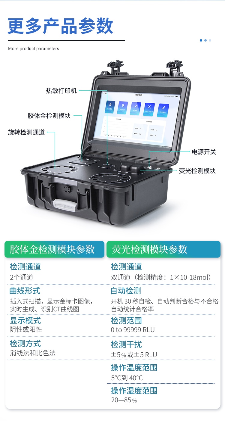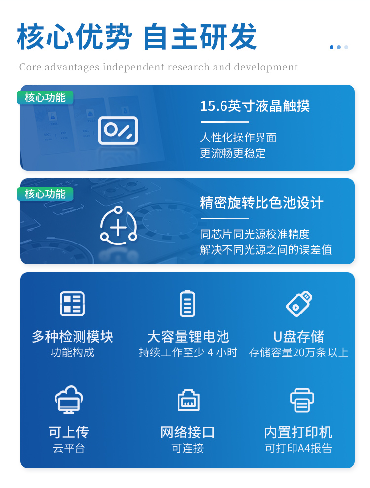 | 儀器采用手提一體化系統(tǒng)檢測技術(shù),將分光光度模塊、膠體金檢測模塊、新型農(nóng)殘檢測模塊、數(shù)字化管理模塊、無線通訊模塊高度集成于一體,支持檢測200種食品安全檢測項(xiàng)目,同時(shí)預(yù)留升級(jí)檢測方法。 | 儀器檢測模塊標(biāo)準(zhǔn)化、智能化,檢測項(xiàng)目可隨意自由組合。檢測箱體內(nèi)置多個(gè)標(biāo)準(zhǔn)檢測單元,檢測模塊可以調(diào)整配置。 | 顯示屏幕:儀器采用10.1英寸豎向液晶觸摸屏顯,搭配運(yùn)行安卓智能操作系統(tǒng),主控芯片采用ARM Cortex-A7,RK3288/4核處理器,主頻1.88Ghz,操作方便,性能更強(qiáng)。 | 檢測通道:≥12通道;采用精密旋轉(zhuǎn)比色池設(shè)計(jì),使用同芯片同光源校準(zhǔn)精度,解決不同光源之間的誤差值,更加準(zhǔn)確**。(1-12通道間誤差0.1%,**號(hào):ZL202022821055.2) | 儀器光源:高精度進(jìn)口四波長冷光源,每個(gè)通道均配置 410、520、590、630nm 波長光源,標(biāo)配**的光路切換裝置,**光路切換功能可實(shí)現(xiàn)64波長,并且所有檢測項(xiàng)目可實(shí)現(xiàn)所有通道同時(shí)檢測。 | 設(shè)備可一鍵校準(zhǔn),自動(dòng)保存校準(zhǔn)數(shù)據(jù),自動(dòng)對(duì)比校驗(yàn),得到精準(zhǔn)光源,采用Android SP存儲(chǔ)數(shù)據(jù),光源數(shù)據(jù)永不丟失,方便每一次使用。 | 通訊接口:配備無線通信模塊、4G(APN)通訊模塊、藍(lán)牙傳輸,同時(shí)具有雙USB接口以及RJ45網(wǎng)線接口,可以多方式實(shí)現(xiàn)數(shù)據(jù)保存及數(shù)據(jù)傳輸。 | 存儲(chǔ)方式:支持U盤存儲(chǔ),標(biāo)準(zhǔn)USB接口,免驅(qū)動(dòng)安裝。檢測結(jié)果存儲(chǔ)容量20萬條以上,可生成Excel表格進(jìn)行拷貝,并具有登錄保護(hù)功能。 | 智能化操作系統(tǒng):: ★操作系統(tǒng):儀器可在同一檢測界面自動(dòng)對(duì)應(yīng)相關(guān)檢測通道,一次性選擇1-12個(gè)樣品名稱,無需退出界面,節(jié)省操作時(shí)間。并可以對(duì)每個(gè)通道屬性和樣品信息單獨(dú)進(jìn)行編輯,例如送檢單位、人員,檢測人員等,打印時(shí)勾選打印顯示。 | ★數(shù)據(jù)集成系統(tǒng):設(shè)備首頁自動(dòng)匯總分析檢測數(shù)據(jù),包含:周檢測數(shù)據(jù)、月檢測數(shù)據(jù),全部檢測總數(shù)量,均包含檢測總數(shù),合格數(shù),不合格數(shù),以及相關(guān)柱形分析圖,各項(xiàng)檢測數(shù)據(jù)一目了然,無需電腦查詢,更加快捷直觀。 | ★數(shù)據(jù)庫系統(tǒng):十幾項(xiàng)數(shù)據(jù)庫分類管理儀器:包含項(xiàng)目類型、項(xiàng)目數(shù)據(jù)、檢測數(shù)據(jù)、歷史記錄、國標(biāo)信息、曲線信息、采樣信息、檢測信息、受檢信息、復(fù)核信息、圖表信息、光源校準(zhǔn)信息、打印樣式信息、樣品庫信息等等,數(shù)據(jù)庫之間互相協(xié)調(diào)聯(lián)動(dòng)保證數(shù)據(jù)的真實(shí)完整性。同時(shí)產(chǎn)品數(shù)據(jù)庫以及歷史檢測記錄支持一鍵檢索功能。 | ★限量規(guī)判系統(tǒng):具有限量查詢、添加物質(zhì)合規(guī)判定系統(tǒng)。檢測出結(jié)果后,系統(tǒng)自動(dòng)調(diào)用系統(tǒng)數(shù)據(jù)庫中相關(guān)國標(biāo)進(jìn)行比對(duì)判定,客觀顯示判定結(jié)果是否合格 | ★項(xiàng)目預(yù)設(shè)系統(tǒng):儀器具有任務(wù)預(yù)設(shè)模塊,一鍵提前預(yù)設(shè),給出方便快捷的新檢測方案,每一個(gè)任務(wù)分別可以設(shè)置不同的樣品、批次、編號(hào)、來源、備注、抽樣信息、檢測信息、受檢信息、復(fù)核信息等更多信息。樣品送檢時(shí)一鍵調(diào)取保存信息,并可多次調(diào)取,大大提高檢測效率。 | ★數(shù)據(jù)監(jiān)管系統(tǒng):同步對(duì)接監(jiān)管平臺(tái),數(shù)據(jù)可局域網(wǎng)和互聯(lián)網(wǎng)數(shù)據(jù)上傳,檢測結(jié)果可選擇直接傳至食品安全監(jiān)管平臺(tái)。進(jìn)行區(qū)域食品安全監(jiān)管及大數(shù)據(jù)分析處理與數(shù)據(jù)統(tǒng)計(jì),檢測區(qū)域食品安全長短期動(dòng)態(tài),達(dá)到食品安全問題預(yù)估、預(yù)警。 | ★打印系統(tǒng):內(nèi)置全新打印機(jī),新創(chuàng)自定義打印方式,可按需靈活勾選控制:產(chǎn)品合格證(國家農(nóng)業(yè)部標(biāo)準(zhǔn)要求),二維碼,抽樣信息、檢測信息,受檢信息、復(fù)核信息、抽樣日期、檢測日期等信息的打印。 | 供電模式:儀器交直流兩用,直流12V供電,可連接車載電源,可配6ah大容量充電鋰電池,電量可實(shí)時(shí)顯示,方便戶外流動(dòng)測試。 | 膠體金檢測模塊:采用雙通道CMOS成像處理技術(shù)及膠體金免疫層析技術(shù),可同時(shí)讀取雙膠體金卡數(shù)據(jù),自動(dòng)采集、處理分析,將檢測結(jié)果顯示,并可根據(jù)參考限值自動(dòng)判斷檢測結(jié)果,可檢測常見的獸藥殘留、生物毒素、抗生素、違禁添加物等。 | ★探測技術(shù):CMOS成像探測; | ★檢測通道:1個(gè)通道; | ★檢測方式:消線法和比色法; | ★顯示模式:陰性或陽性; | 曲線形式:軌道式掃描方式,顯示金標(biāo)卡圖像,實(shí)時(shí)生成、識(shí)別CT曲線圖,無需手動(dòng)調(diào)整,完成檢測后自動(dòng)退出檢測卡。兼容市場上其他金標(biāo)卡,使用耗材不受限制。 | 儀器具備遠(yuǎn)程升級(jí)功能,可定向分