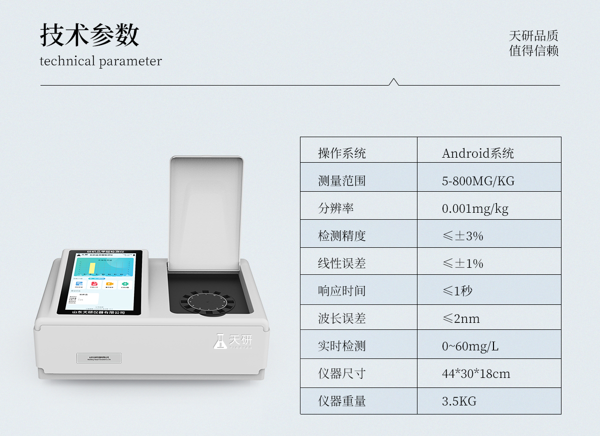 | 1、智能**且方便 | ①智能芯片:主控芯片采用ARM Cortex-A7,RK3288/4核處理器,搭配安卓智能操作系統(tǒng),集實(shí)驗(yàn)操作,分析結(jié)果,打印報(bào)告等功能于一體,使用方便,性能更強(qiáng)。 | ②大屏顯示:采用10.1英寸液晶觸摸屏,單機(jī)即可操作,無(wú)需連接外部顯示或控制器。 | ③多樣同檢:儀器具有12個(gè)檢測(cè)通道,可同時(shí)一次性檢測(cè)11個(gè)樣品,效率更高。 | ④工作預(yù)設(shè):具有任務(wù)預(yù)設(shè)模塊,一鍵提前預(yù)設(shè)樣品所有信息內(nèi)容。來(lái)樣時(shí)可直接檢測(cè),同時(shí)可多次調(diào)取。 | ⑤數(shù)據(jù)分析:設(shè)備首頁(yè)自動(dòng)匯總分析數(shù)據(jù),并繪制柱形分析圖,各項(xiàng)檢測(cè)數(shù)據(jù)一目了然,快捷直觀。 | ⑥高度集成:模塊高度集合,將分光光度模塊、數(shù)字化管理模塊、無(wú)線通訊模塊集成于一體??蓪z測(cè)結(jié)果進(jìn)行分析,直接上傳至數(shù)據(jù)平臺(tái),實(shí)現(xiàn)數(shù)據(jù)共享,方便后期進(jìn)行數(shù)據(jù)分析與統(tǒng)計(jì)。 | ⑦遠(yuǎn)程升級(jí):儀器具備遠(yuǎn)程升級(jí)功能,可遠(yuǎn)程升級(jí)程序,無(wú)需返廠,并可持續(xù)性免費(fèi)更新系統(tǒng)版本,降低成本及運(yùn)輸損耗風(fēng)險(xiǎn)。 | 2、檢測(cè)精準(zhǔn)且直觀 | ①**技術(shù):精密旋轉(zhuǎn)比色池,使用同芯片同光源校準(zhǔn)精度,解決不同光源之間存在波長(zhǎng)誤差的問(wèn)題,更加準(zhǔn)確**。 | ②結(jié)果直觀:儀器自動(dòng)對(duì)檢測(cè)結(jié)果與國(guó)標(biāo)限量值進(jìn)行對(duì)比,自動(dòng)判定結(jié)果是否合格,結(jié)果更直觀。 | 3、功能強(qiáng)大且實(shí)用 | ①存儲(chǔ)功能:設(shè)備可以存儲(chǔ)數(shù)據(jù)100000組,可在屏幕上直觀查看歷史數(shù)據(jù),可導(dǎo)出數(shù)據(jù)。 | ②打印功能:設(shè)備自帶打印功能,可對(duì)樣品信息及檢測(cè)結(jié)果無(wú)限次隨意打印。 | ③全新方式:新創(chuàng)自定義打印方式,可按需靈活勾選控制:二維碼,抽樣信息、檢測(cè)信息,受檢信息、復(fù)核信息、抽樣日期、檢測(cè)日期等信息的打印 | ④多重編輯:樣品信息可多重編輯,可以對(duì)每個(gè)通道屬性和樣品信息單獨(dú)進(jìn)行編輯,例如樣品信息、抽樣信息、檢測(cè)信息,受檢信息、復(fù)核信息、抽樣日期、檢測(cè)日期等信息等。 | ⑤雙語(yǔ)設(shè)計(jì):全中文/英文操作菜單,簡(jiǎn)單實(shí)用,適用于不同用戶的需求。 |