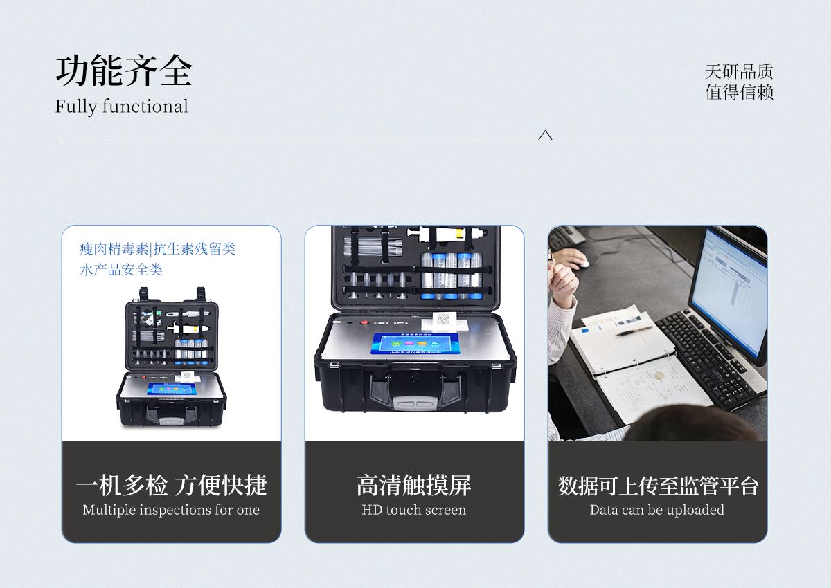 | 用途:可用于糧食谷物及其制品、飼料、植物油中真菌毒素快速定量測定; | 檢測方法:采用發(fā)光定量免疫層析技術(shù),激光激發(fā),掃描方式收集發(fā)光熒光信號。 | 定量參數(shù)設(shè)定:RFID芯片記錄檢測目標(biāo)的標(biāo)準(zhǔn)曲線,根據(jù)不同樣本類型配備多參數(shù)卡; | 識別功能:試劑插卡后儀器自動識別檢測項目; | 靈敏性和特異性:不受外界的背景干擾, 檢測限為0.4-4500ug/kg;對其它毒素?zé)o非特異反應(yīng); | 穩(wěn)定性:無淬滅和光漂白現(xiàn)象; | 檢測時間快,實時顯示檢測曲線 | 無需孵育器,室溫(15-30℃)下進行測試 | 數(shù)據(jù)獲取和處理:檢測結(jié)果自動獲?。o需目測),可實時打印檢測報告;數(shù)據(jù)可儲存,可導(dǎo)出。 | 儀器可靠:有開機系統(tǒng)自檢功能;儀器配有質(zhì)控卡,確保檢測系統(tǒng)自身的準(zhǔn)確性; | 檢測數(shù)據(jù)精準(zhǔn)可靠:HPLC/LC-MS結(jié)果接近 | 檢測儀器獲得國家認證 | 聯(lián)網(wǎng):網(wǎng)絡(luò)接口 | 升級:可以通過U盤進行軟件升級 | 存儲空間:≥32G,**擴展至64G | 工作功率:40W | 操作系統(tǒng):windows 7 | 顯示屏:可觸摸顯示屏,屏幕尺寸≥8寸 | 定量檢測項目:包括黃曲霉毒素B1、嘔吐毒素、玉米赤霉烯酮、T-2毒素、伏馬毒素 |
