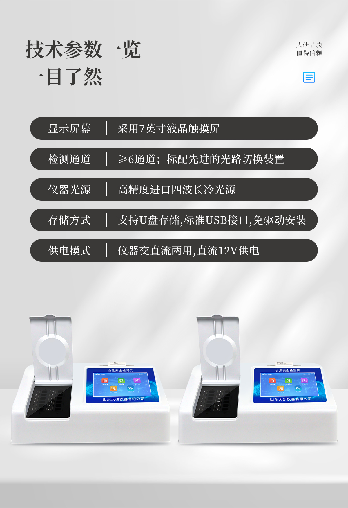 | 儀器采用臺式一體化系統(tǒng)檢測技術(shù),將分光光度模塊、新型農(nóng)殘檢測模塊、數(shù)字化管理模塊、無線通訊模塊高度集成于一體,支持檢測200種食品安全檢測項目,同時預留升級檢測方法。 | 儀器檢測模塊標準化、智能化,可隨意自由組合。檢測箱體內(nèi)置多個標準檢測單元,檢測模塊可以調(diào)整配置。 | 儀器采用全新安卓智能系統(tǒng),主控芯片采用 ARM Cortex-A7,RK3288/4核處理器,10.1寸高清液晶觸摸豎屏,更加**的UI交互界面,運轉(zhuǎn)快捷;儀器配備無線通信模塊: 4G(APN)通訊模塊、Wifi模塊,藍牙傳輸,同時具有雙USB接口以及RJ45接口能以多種方式實現(xiàn)數(shù)據(jù)保存和數(shù)據(jù)傳輸功能。 | 創(chuàng)新檢測模式: | ★檢測通道:≥12通道;采用精密旋轉(zhuǎn)比色池設計,使用同芯片同光源校準精度,解決不同光源之間的誤差值。1-12通道間誤差0.1%。(**號:ZL202022821055.2) | ★儀器具有自動識別比色皿檢測功能,即:將樣品比色皿放入儀器后,點擊樣品檢測,儀器自動識別比色皿進行通道檢測。 | 進口高精光源: | 高精度進口四波長冷光源,通道配置 410、520、590、630nm 波長光源,一個光源芯片驅(qū)動一個光源,誤差極小,每臺設備單獨**校準光源,**比對,同時參照四種不同波段光源全方位覆蓋市面上99%的農(nóng)殘食品項目檢測。 | 智能化操作系統(tǒng): | 便捷操作系統(tǒng):設備檢測時可在同一檢測界面自動對應相關(guān)檢測通道一次性選擇1-12個樣品名稱,無須退出界面,節(jié)省操作時間。 | 數(shù)據(jù)集成系統(tǒng):設備首頁自動統(tǒng)計檢測數(shù)據(jù)包含:周檢測數(shù)據(jù)、月檢測數(shù)據(jù),全部檢測總數(shù)量,均包含檢測總數(shù),合格數(shù),不合格數(shù),以及相關(guān)柱形分析圖,對各項檢測數(shù)據(jù)清晰掌握,無需電腦查詢,更加快捷直觀。 | 項目預設系統(tǒng):支持添加單個及多個相同或不相同的任務預設,一鍵快速調(diào)取,每一個任務分別可以設置不同的樣品、批次、編號、來源、備注、抽樣信息、檢測信息、受檢信息、復核信息等更多信息。無縫鏈接平臺和APP實時查看下發(fā)任務。 | 數(shù)據(jù)監(jiān)管系統(tǒng):同步對接監(jiān)管平臺,數(shù)據(jù)可局域網(wǎng)和互聯(lián)網(wǎng)數(shù)據(jù)上傳,檢測結(jié)果可選擇直接傳至食品安全監(jiān)管平臺。集成OSS輸出存儲服務、區(qū)分設備定向管理應用,進行區(qū)域食品安全監(jiān)管及大數(shù)據(jù)分析處理與數(shù)據(jù)統(tǒng)計,檢測區(qū)域食品安全長短期動態(tài),達到食品安全問題預估、預警。 | 自定義打印系統(tǒng):內(nèi)置全新打印系統(tǒng),新創(chuàng)自定義打印方式,可按需靈活設置開啟或關(guān)閉:產(chǎn)品合格證(國家農(nóng)業(yè)部標準要求),二維碼,抽樣信息、檢測信息,受檢信息、復核信息、抽樣日期、檢測日期等信息的打印。 | 系統(tǒng)遠程更新功能:可定向分客戶分儀器更新系統(tǒng),按照不同客戶后期實際需求添加項目,無需機器返廠,即可遠程實時升級全新系統(tǒng),節(jié)省時間成本及避免運輸造成設備損壞。 | 儀器主機采用一體化防水、抗壓、防撞擊、防腐蝕箱體設計,同時配備交直流供電,可連接車載電源,可選配大容量充電鋰電池,滿足現(xiàn)場野外檢測需求。 | 安全證書,放心保障:儀器具有中國計量科學研究院校準證書,**認證。 |