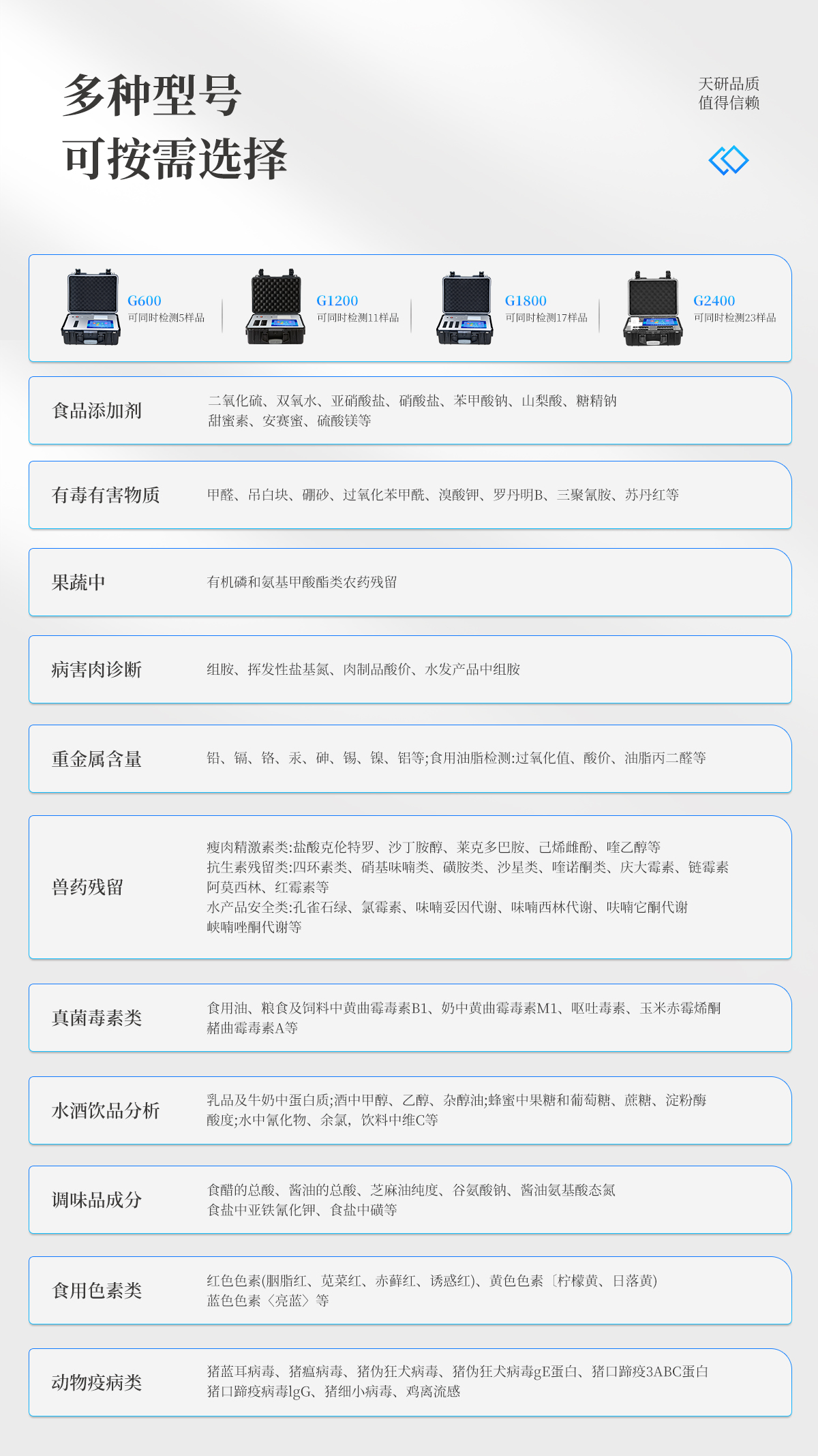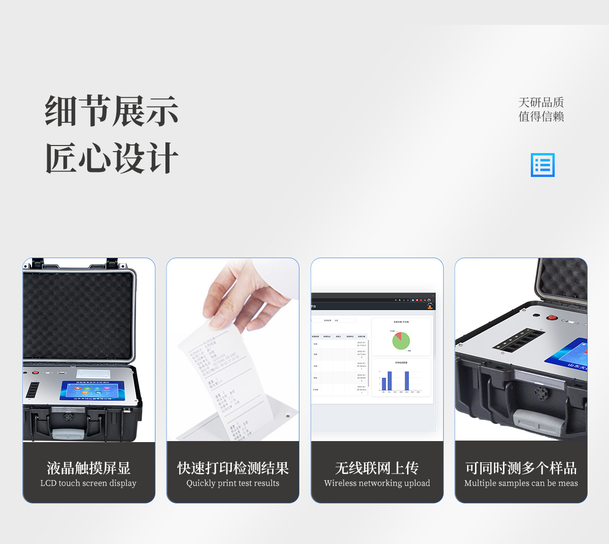 | 儀器采用手提式一體化系統(tǒng)檢測技術(shù),將分光光度模塊、新型農(nóng)殘檢測模塊、數(shù)字化管理模塊、無線通訊模塊高度集成于一體,支持檢測200種食品安全檢測項(xiàng)目,同時(shí)預(yù)留升級檢測方法。 | 儀器檢測模塊標(biāo)準(zhǔn)化、智能化,檢測項(xiàng)目可隨意自由組合。檢測箱體內(nèi)置多個(gè)標(biāo)準(zhǔn)檢測單元,檢測模塊可以調(diào)整配置。 | 顯示屏幕:儀器采用10.1英寸豎向液晶觸摸屏顯,搭配運(yùn)行安卓智能操作系統(tǒng),主控芯片采用ARM Cortex-A7,RK3288/4核處理器,主頻1.88Ghz,操作方便,性能更強(qiáng)。 | 檢測通道:≥12通道;采用精密旋轉(zhuǎn)比色池設(shè)計(jì),使用同芯片同光源校準(zhǔn)精度,解決不同光源之間的誤差值,更加準(zhǔn)確**。(1-12通道間誤差0.1%,**號:ZL202022821055.2) | 儀器光源:高精度進(jìn)口四波長冷光源,每個(gè)通道均配置 410、520、590、630nm 波長光源,標(biāo)配**的光路切換裝置,**光路切換功能可實(shí)現(xiàn)64波長,并且所有檢測項(xiàng)目可實(shí)現(xiàn)所有通道同時(shí)檢測。 | 設(shè)備可一鍵校準(zhǔn),自動保存校準(zhǔn)數(shù)據(jù),自動對比校驗(yàn),得到精準(zhǔn)光源,采用Android SP存儲數(shù)據(jù),光源數(shù)據(jù)永不丟失,方便每一次使用。 | 通訊接口:配備無線通信模塊、4G(APN)通訊模塊、藍(lán)牙傳輸,同時(shí)具有雙USB接口以及RJ45網(wǎng)線接口,可以多方式實(shí)現(xiàn)數(shù)據(jù)保存及數(shù)據(jù)傳輸 | 存儲方式:支持U盤存儲,標(biāo)準(zhǔn)USB接口,免驅(qū)動安裝。檢測結(jié)果存儲容量20萬條以上,可生成Excel表格進(jìn)行拷貝,并具有登錄保護(hù)功能。 | 智能化操作系統(tǒng): | 1)操作系統(tǒng):儀器可在同一檢測界面自動對應(yīng)相關(guān)檢測通道,一次性選擇1-12個(gè)樣品名稱,無需退出界面,節(jié)省操作時(shí)間。并可以對每個(gè)通道屬性和樣品信息單獨(dú)進(jìn)行編輯,例如送檢單位、人員,檢測人員等,打印時(shí)勾選打印顯示。 | 2)數(shù)據(jù)集成系統(tǒng):設(shè)備首頁自動匯總分析檢測數(shù)據(jù),包含:周檢測數(shù)據(jù)、月檢測數(shù)據(jù),全部檢測總數(shù)量,均包含檢測總數(shù),合格數(shù),不合格數(shù),以及相關(guān)柱形分析圖,各項(xiàng)檢測數(shù)據(jù)一目了然,無需電腦查詢,更加快捷直觀。 | 3)數(shù)據(jù)庫系統(tǒng):十幾項(xiàng)數(shù)據(jù)庫分類管理儀器:包含項(xiàng)目類型、項(xiàng)目數(shù)據(jù)、檢測數(shù)據(jù)、歷史記錄、國標(biāo)信息、曲線信息、采樣信息、檢測信息、受檢信息、復(fù)核信息、圖表信息、光源校準(zhǔn)信息、打印樣式信息、樣品庫信息等等,數(shù)據(jù)庫之間互相協(xié)調(diào)聯(lián)動保證數(shù)據(jù)的真實(shí)完整性。同時(shí)產(chǎn)品數(shù)據(jù)庫以及歷史檢測記錄支持一鍵檢索功能。 | 4)限量規(guī)判系統(tǒng):具有限量查詢、添加物質(zhì)合規(guī)判定系統(tǒng)。檢測出結(jié)果后,系統(tǒng)自動調(diào)用系統(tǒng)數(shù)據(jù)庫中相關(guān)國標(biāo)進(jìn)行比對判定,客觀顯示判定結(jié)果是否合格。 | 5)項(xiàng)目預(yù)設(shè)系統(tǒng):儀器具有任務(wù)預(yù)設(shè)模塊,一鍵提前預(yù)設(shè),給出方便快捷的新檢測方案,每一個(gè)任務(wù)分別可以設(shè)置不同的樣品、批次、編號、來源、備注、抽樣信息、檢測信息、受檢信息、復(fù)核信息等更多信息。樣品送檢時(shí)一鍵調(diào)取保存信息,并可多次調(diào)取,大大提高檢測效率。 | 6)數(shù)據(jù)監(jiān)管系統(tǒng):同步對接監(jiān)管平臺,數(shù)據(jù)可局域網(wǎng)和互聯(lián)網(wǎng)數(shù)據(jù)上傳,檢測結(jié)果可選擇直接傳至食品安全監(jiān)管平臺。進(jìn)行區(qū)域食品安全監(jiān)管及大數(shù)據(jù)分析處理與數(shù)據(jù)統(tǒng)計(jì),檢測區(qū)域食品安全長短期動態(tài),達(dá)到食品安全問題預(yù)估、預(yù)警。 | 7)打印系統(tǒng):內(nèi)置全新打印機(jī),新創(chuàng)自定義打印方式,可按需靈活勾選控制:產(chǎn)品合格證(國家農(nóng)業(yè)部標(biāo)準(zhǔn)要求),二維碼,抽樣信息、檢測信息,受檢信息、復(fù)核信息、抽樣日期、檢測日期等信息的打印。 | 供電模式:儀器交直流兩用,直流12V供電,可連接車載電源,可配6ah大容量充電鋰電池,電量可實(shí)時(shí)顯示,方便戶外流動測試。 | 膠體金檢測模塊:采用雙通道CMOS成像處理技術(shù)及膠體金免疫層析技術(shù),可同時(shí)讀取雙膠體金卡數(shù)據(jù),自動采集、處理分析,將檢測結(jié)果顯示,并可根據(jù)參考限值自動判斷檢測結(jié)果,可檢測常見的獸藥殘留、生物毒素、抗生素、違禁添加物等。 | 1)探測技術(shù):CMOS成像探測; | 2)檢測通道:1個(gè)通道; | 3)檢測方式:消線法和比色法; | 4)顯示模式:陰性或陽性; | 5)曲線形式:軌道式掃描方式,顯示金標(biāo)卡圖像,實(shí)時(shí)生成、識別CT曲線圖,無需手動調(diào)整,完成檢測后自動退出檢測卡。兼容市場上其他金標(biāo)卡,使用耗材不受限制。 | 儀器加入遠(yuǎn)程升級功能,可定向分客戶分儀器更新,開機(jī)后自動更新,客戶無需任何操作,即可升級全新項(xiàng)目。做到了無需退換機(jī)器即可實(shí)現(xiàn)實(shí)時(shí)遠(yuǎn)程升級檢測儀器