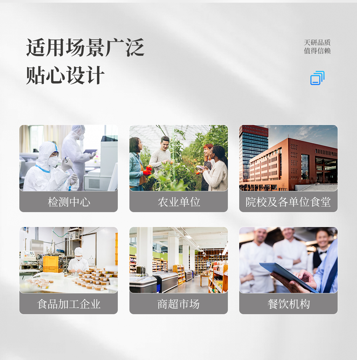 | 安卓智能操作系統(tǒng),采用更加**UI交互界面,儀器具有wifi聯(lián)網(wǎng)上傳、4G聯(lián)網(wǎng)傳輸、GPRS無線遠傳、網(wǎng)線連接功能,快速批量上傳數(shù)據(jù)。 | 智能化程度高,儀器具有自檢功能:具有開機自檢和調(diào)零功能,具有自動檢測重復性功能。 | 新一代高速熱敏打印機,檢測完成可自動打印或批量打印檢測報告和二維碼。 | 儀器帶有監(jiān)管平臺,數(shù)據(jù)可局域網(wǎng)和互聯(lián)網(wǎng)數(shù)據(jù)上傳,檢測結果直接傳至食品安全監(jiān)管平臺。進行區(qū)域食品安全監(jiān)管及大數(shù)據(jù)分析處理與數(shù)據(jù)統(tǒng)計,檢測區(qū)域食品安全長短期動態(tài),達到食品安全問題預估、預警 | 一體化主機,包含光電比色檢測模塊、膠體金免疫層析檢測模塊。 | 一體化便攜式快檢設備,滿足現(xiàn)場及流動檢測使用需求,能夠在同一軟件下實現(xiàn)所有檢測項目的檢測,并可通過同一窗口直觀顯示檢測結果。 | 膠體金模塊檢測方式:軌道式自動傳輸掃描,檢測完成后自動退出檢測卡。 | CT線自動識別,無需手動調(diào)整。 | 儀器具有多品類多種類樣品菜單庫,可靈活選擇檢測樣品,不同的檢測通道可同時檢測不同的樣品項目。也可在儀器上直接編輯錄入樣品名稱、檢測指標、送檢單位等信息并保存進樣品數(shù)據(jù)庫。 | 儀器內(nèi)置操作視頻,是您身邊的化驗指導專家。 | 樣品處理簡單省力,整體操作快速、安全、便捷。 | 儀器具有自身保護功能,可設置用戶名及密碼,防止非工作人員操作等。 | 高靈敏度,高檢測精度,高重復性精度,掃描式高精度光學傳感器。 | 儀器具有重新校準、鎖定、恢復出廠設置功能。 | 結果判定線可修改,對照值標定值可保存,斷電不丟失數(shù)據(jù)。 | 兼容市場上所有的膠體金卡,使用耗材不受限制,極大增強用戶使用體驗。 |