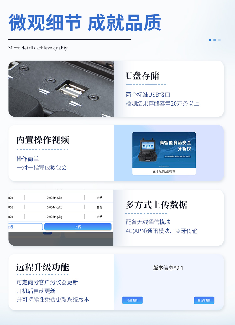 | 功能構(gòu)成:主要包括分光光度模塊、新型農(nóng)殘檢測模塊、膠體金檢測模塊、熒光檢測模塊、數(shù)字化管理模塊等,所有模塊集成一體,可快速檢測200多種食品安全項目,如獸藥殘留、農(nóng)藥殘留、非法添加劑、細菌數(shù)值等指標(biāo)。 | 檢測樣品種類:餐具及廚房用品、瓜果蔬菜及其制品、水產(chǎn)品及其制品、畜禽產(chǎn)品及其制品、嬰幼兒乳品及奶粉制品、蜂蜜、糧油及其制品、調(diào)味品(食醋、醬油、味精、鹽等)、酒類茶葉及其制品、食用菌、飲料、蛋類藥物殘留(雞蛋,鴨蛋等)、米豆面制品、糖果糕點類(小食品)、薯類及膨化食品、瓶(桶)裝飲用水、添加食用色素的食品、使用添加劑的食品、含有有毒有害物質(zhì)的相關(guān)食品。 | 顯示屏幕:儀器采用15.6英寸液晶觸摸屏顯,搭配運行安卓智能操作系統(tǒng),主控芯片采用ARM Cortex-A7,RK3288/4核處理器,主頻1.88Ghz,操作方便,性能更強。 | 供電模式:儀器交直流兩用,直流12V供電,可連接車載電源,配18ah大容量充電鋰電池,電量可實時顯示,無外部電源條件下可持續(xù)工作至少 4 小時。 | 檢測通道:≥24通道;采用精密旋轉(zhuǎn)比色池設(shè)計,使用同芯片同光源校準(zhǔn)精度,解決不同光源之間的誤差值,更加準(zhǔn)確**,采用高精度進口四波長冷光源,每個通道均配置 410、520、590、630nm 波長光源,標(biāo)配**的光路切換裝置,**光路切換功能可實現(xiàn)64波長,并且所有檢測項目可實現(xiàn)所有通道同時檢測. | 通訊接口:配備無線通信模塊、4G(APN)通訊模塊、藍牙傳輸,同時具有雙USB接口以及RJ45網(wǎng)線接口,可以多方式實現(xiàn)數(shù)據(jù)保存及數(shù)據(jù)傳輸。 | 存儲方式:支持U盤存儲,兩個標(biāo)準(zhǔn)USB接口,免驅(qū)動安裝。檢測結(jié)果存儲容量20萬條以上,可生成Excel表格進行拷貝,并具有登錄保護功能。 | 操作系統(tǒng):儀器可在同一檢測界面自動對應(yīng)相關(guān)檢測通道,一次性選擇不少于11個樣品名稱,無需退出界面,節(jié)省操作時間。并可以對每個通道屬性和樣品信息單獨進行編輯,例如送檢單位、人員,檢測人員等,打印時勾選打印顯示。 | 數(shù)據(jù)集成系統(tǒng):設(shè)備首頁自動匯總分析檢測數(shù)據(jù),包含:周檢測數(shù)據(jù)、月檢測數(shù)據(jù),全部檢測總數(shù)量,包含檢測總數(shù),合格數(shù),不合格數(shù),以及相關(guān)柱形分析圖,各項檢測數(shù)據(jù)一目了然,無需電腦查詢,更加快捷直觀。 | 數(shù)據(jù)庫系統(tǒng):十幾項數(shù)據(jù)庫分類管理儀器:包含項目類型、項目數(shù)據(jù)、檢測數(shù)據(jù)、歷史記錄、國標(biāo)信息、曲線信息、采樣信息、檢測信息、受檢信息、復(fù)核信息、圖表信息、光源校準(zhǔn)信息、打印樣式信息、樣品庫信息等等,數(shù)據(jù)庫之間互相協(xié)調(diào)聯(lián)動保證數(shù)據(jù)的真實完整性。同時產(chǎn)品數(shù)據(jù)庫以及歷史檢測記錄支持一鍵檢索功能。 | 限量規(guī)判系統(tǒng):具有限量查詢、添加物質(zhì)合規(guī)判定系統(tǒng)。檢測出結(jié)果后,系統(tǒng)自動調(diào)用系統(tǒng)數(shù)據(jù)庫中相關(guān)國標(biāo)進行比對判定,客觀顯示判定結(jié)果是否合格。 | 項目預(yù)設(shè)系統(tǒng):儀器具有任務(wù)預(yù)設(shè)模塊,一鍵提前預(yù)設(shè),給出方便快捷的新檢測方案,每一個任務(wù)分別可以設(shè)置不同的樣品、批次、編號、來源、備注、抽樣信息、檢測信息、受檢信息、復(fù)核信息等更多信息。樣品送檢時一鍵調(diào)取保存信息,并可多次調(diào)取,適用于大批量檢測業(yè)務(wù),可以大大提高檢測效率。 | 數(shù)據(jù)監(jiān)管系統(tǒng):同步對接監(jiān)管平臺,數(shù)據(jù)可局域網(wǎng)和互聯(lián)網(wǎng)數(shù)據(jù)上傳,檢測結(jié)果可直接傳至食品安全監(jiān)管平臺。進行區(qū)域食品安全監(jiān)管及大數(shù)據(jù)分析處理與數(shù)據(jù)統(tǒng)計,監(jiān)測區(qū)域食品安全長短期動態(tài)及問題預(yù)估、預(yù)警 | 全新打印系統(tǒng):內(nèi)置全新打印機,新創(chuàng)自定義打印方式,可按需靈活勾選控制:產(chǎn)品合格證(國家農(nóng)業(yè)部標(biāo)準(zhǔn)要求),二維碼,抽樣信息、檢測信息,受檢信息、復(fù)核信息、抽樣日期、檢測日期等信息的打印。 | A4紙版本報告打印功能:設(shè)備擁有兩種結(jié)果展示方式,可以自動生成A4打印模板和小票打印模板兩種樣式,可通過WiFi及網(wǎng)線等方式連接外置打印機可進行打印。 | 膠體金檢測模塊:采用單通道CMOS成像處理技術(shù)及膠體金免疫層析技術(shù),可讀取膠體金卡數(shù)據(jù),自動采集、處理分析,將檢測結(jié)果顯示,并可根據(jù)參考限值自動判斷檢測結(jié)果,可檢測常見的獸藥殘留、生物毒素、抗生素、違禁添加物等。 | 可即時檢測單聯(lián)卡及三聯(lián)卡; | 檢測通道:2個通道; | 檢測方式:消線法和比色法; | 顯示模式:陰性或陽性; | 曲線形式:插入式掃描方式,顯示金標(biāo)卡圖像,實時生成、識別CT曲線圖,無需手動調(diào)整。兼容市場上其他金標(biāo)卡,使用耗材不受限制。 | 熒光檢測模塊:快速檢測水質(zhì)中微生物、固體物細菌含量。利用“熒光素酶—熒光素體系”快速檢測三磷酸腺苷(ATP)。以ATP含量表明樣品中微生物與其他生物
