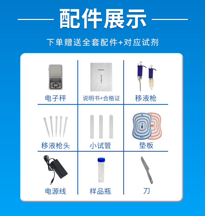 金標度數(shù)儀快速定量檢測獸藥殘留、抗生素類殘留、激素類殘留、毒素類殘留,化學類殘留等幾十種項目并可根據(jù)用戶需要擴充新的檢測項目如農(nóng)藥殘留、食品添加劑、色素、可現(xiàn)場快速檢測農(nóng)藥殘留、鹽酸克倫特羅、沙丁胺醇、萊克多巴胺、四環(huán)素類、硝基呋喃類、磺胺類、沙星類、氯霉素、孔雀石綠磺胺類、豬藍耳病毒、豬瘟病毒、黃曲霉毒素B1、豬偽狂犬病毒、豬偽狂犬病毒gE蛋白、豬口蹄疫3ABC蛋白、豬口蹄疫病毒IgG、豬細小病毒、雞禽流感等定性和定量快速檢測等、并且可以連接食品安全監(jiān)控系統(tǒng)。