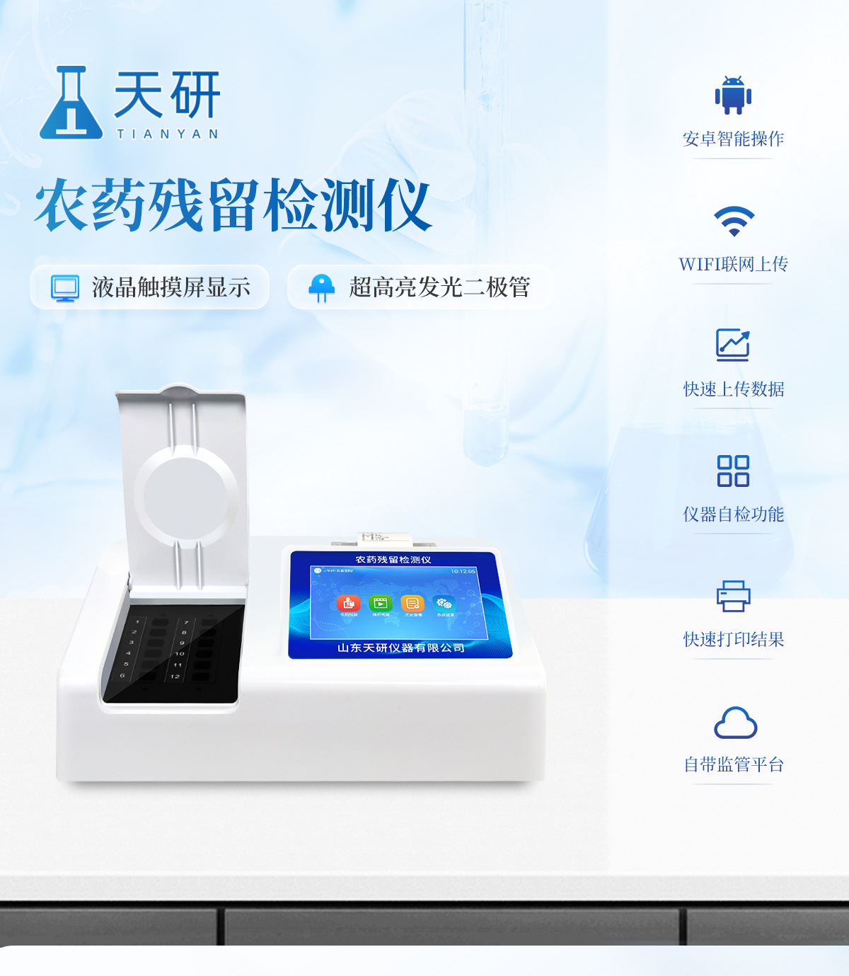 | 乙酰膽堿酯酶和丁酰膽堿酯酶試劑均可以使用,符合國家標(biāo)準(zhǔn)和農(nóng)業(yè)部標(biāo)準(zhǔn)的要求。 | 自動判斷樣品是否合格,檢測結(jié)果更加直觀。 | 儀器具有100多種蔬菜名稱菜單庫,分類管理,并可按需添加或刪除蔬菜名,編輯蔬菜名稱,可直接打印出蔬菜名稱。 | 檢測通道:12個檢測通道,可以同時測試多個樣品,循環(huán)檢測,即放即檢,每個樣品由程序控制分別獨立工作,不會互相干擾。 | 智能操作系統(tǒng),采用更加人性化操作,主控采用多核處理器,主頻1.88Ghz,運(yùn)轉(zhuǎn)速度更快速,穩(wěn)定性更強(qiáng)。 | 顯示方式:7英寸高靈敏真彩觸摸屏顯示,人性化中文操作界面,讀數(shù)直觀、簡單。 | 打印機(jī)采用串口5v打印,可選擇手動打印或者自動打印,三分鐘出打印結(jié)果,打印格式為檢測人姓名、吸光度差值、檢測時間、檢測機(jī)構(gòu)、樣品名稱及結(jié)果判定。 | 光源采用進(jìn)口超高亮發(fā)光二極管,具有低功耗、高精度、穩(wěn)定性強(qiáng)、光源可控可以關(guān)掉不使用的光源,響應(yīng)速度快等優(yōu)點。 | 智能恒流穩(wěn)壓,光強(qiáng)自動校準(zhǔn),長時間連續(xù)工作光源無溫漂現(xiàn)象。 | 儀器具有GPRS遠(yuǎn)傳功能,可插手機(jī)卡實現(xiàn)數(shù)據(jù)遠(yuǎn)傳平臺,wifi聯(lián)網(wǎng)功能,可將數(shù)據(jù)快速上傳電腦,進(jìn)行數(shù)據(jù)管理與統(tǒng)計。 | 采用USB2.0接口設(shè)計,方便數(shù)據(jù)的存貯和移動,并可隨時與計算機(jī)直接相連,并且可用計算機(jī)控制儀器。實現(xiàn)數(shù)據(jù)查詢、瀏覽、分析、統(tǒng)計、打印等。 | 智能化程度高,儀器具有自檢功能:具有開機(jī)自檢和調(diào)零功能,具有自動檢測重復(fù)性功能 | 儀器具有自身保護(hù)功能,可設(shè)置用戶名及密碼,防止非工作人員操作等。 | 采用DC12v直流供電,安全系統(tǒng)更高,并且配備6A鋰電池充電器。 | 儀器具有重新校準(zhǔn)、鎖定、恢復(fù)出廠設(shè)置功能。 |