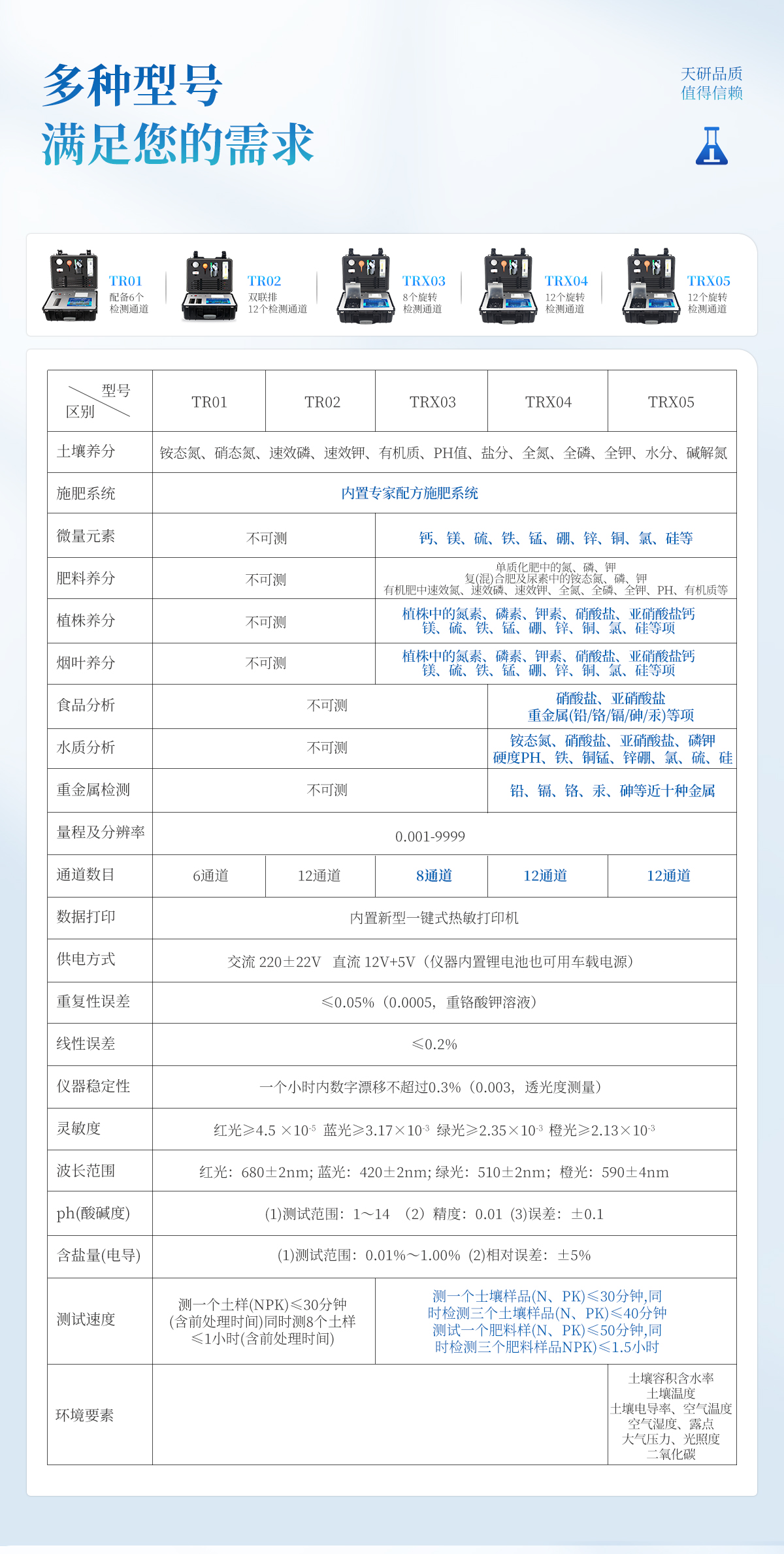 產(chǎn)品簡介:(新開發(fā),農(nóng)資經(jīng)銷商、農(nóng)技體系普及型)(新一代智能型,內(nèi)置測土配方施肥功能,圖譜診斷,二維碼打印,數(shù)據(jù)上傳,及測試用到的所有配件,保證用戶只需提供純凈水即可完成氮磷鉀有機質(zhì)pH含鹽量的準確測定?。┢放疲禾煅? 型號:TY-TR01產(chǎn)品簡介:配套齊全:該儀器集藥、器、儀為一體,攜帶方便,相當于一個