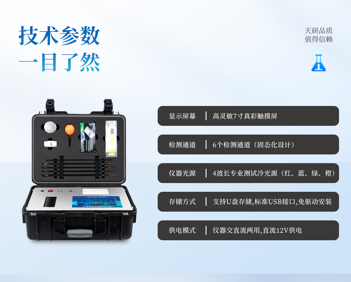 | 1、本儀器集各功能于一身,無需用戶自配附件,可靈活流動檢測。 | 2、安卓智能操作系統(tǒng),主控芯片采用ARM Cortex-A7,RK3288/4核處理器,主頻1.88Ghz,運轉(zhuǎn)速度更快速,穩(wěn)定性更強。 | 3、6個檢測通道(固態(tài)化設(shè)計),一次性可快速檢測6個樣品,極大提升檢測效率,降低檢測成本。 | 4、檢測過程中內(nèi)置校準功能,智能恒流穩(wěn)壓,光強自動校準,確保檢測準確度。 | 5、內(nèi)置作物專家施肥系統(tǒng),可對百余種全國農(nóng)業(yè)經(jīng)濟作物、果樹等的目標產(chǎn)量計算推薦施肥量,依據(jù)施肥配方科學(xué)指導(dǎo)農(nóng)業(yè)生產(chǎn)。測土配方施肥結(jié)果可打印,打印內(nèi)容包含:作物種類、肥料種類、目標產(chǎn)量、需求總量、建議施肥方案。 | 6、儀器標配wifi無線上傳、4G聯(lián)網(wǎng)傳輸、GPRS無線遠傳功能,快速上傳數(shù)據(jù)。 | 7、儀器內(nèi)置大容量內(nèi)存,支持查看全部歷史檢測記錄,以及傳輸所有檢測數(shù)據(jù)。 | 8、配有智慧云農(nóng)業(yè)平臺,儀器連入無線網(wǎng)絡(luò)后,可將檢測數(shù)據(jù)可選擇性或批量無線上傳,方便用戶進行長期數(shù)據(jù)管理和可視化分析 | 9、儀器同時具有USB接口、以太網(wǎng)接口,并可隨時用U盤拷貝出數(shù)據(jù)。 | 10、可用手機隨時登錄云平臺在線移動查看歷史數(shù)據(jù) | 11、內(nèi)置植物營養(yǎng)診斷標準圖譜,根據(jù)各農(nóng)作物營養(yǎng)缺失的圖片,進行葉面對比,診斷豐缺。 | 12、4波長專業(yè)測試冷光源(紅、藍、綠、橙),光源波長穩(wěn)定,長時間連續(xù)工作光源無溫漂現(xiàn)象,壽命長達10萬小時級別,重現(xiàn)性好,準確度高。 | 13、比色池部分采用標準1cm比色皿,無機械位移及磨損,光路測試定位**,有效屏蔽外光干擾,保證檢測結(jié)果優(yōu)于國標要求。 | 14、儀器系統(tǒng)內(nèi)帶有樣品前處理操作視頻,各種樣品檢測方法點擊視頻模塊即可觀看,檢測人員無需自學(xué)說明書,指導(dǎo)教學(xué)方便快速,方便新手快速操作。 | 15、內(nèi)置新一代高速熱敏打印機(無需色帶),打印內(nèi)容包含:檢測單位、檢測人員、檢測項目、通道號、吸光度、養(yǎng)分含量(mg/kg)、檢測時間、以及二維碼等信息 | 16、高靈敏7寸真彩觸摸屏,采用更加**和人性化操作,高清晰高交互顯示,大程度降低傳統(tǒng)儀器的繁瑣操作和失誤。 | 17、內(nèi)置時鐘功能,方便操作時間記錄,長期歷史追溯。 | 18、可設(shè)置多賬戶賬號密碼登錄,**UI交互界面,不同的用戶可自由添加編輯檢測信息,保存后可長期使用。 | 19、GPS功能:可在野外作業(yè)時記錄經(jīng)緯度地點,滿足特殊用戶需求。 | 20、內(nèi)置低電壓提示功能,可在檢測時明確電量,避免測試數(shù)據(jù)偏移,同時具有斷電保護功能,斷電自動保存數(shù)據(jù),防止數(shù)據(jù)丟失。 | 21、交直流兩用供電方式,內(nèi)置大容量充電鋰電池,滿電狀態(tài)下可連續(xù)工作10余小時,同時可外接車載電源蓄電。 | 22、儀器具有中英文切換功能,可滿足出口要求。 | 23、高強度PVC工程塑料手提箱設(shè)計,堅固耐用,便于攜帶。 |