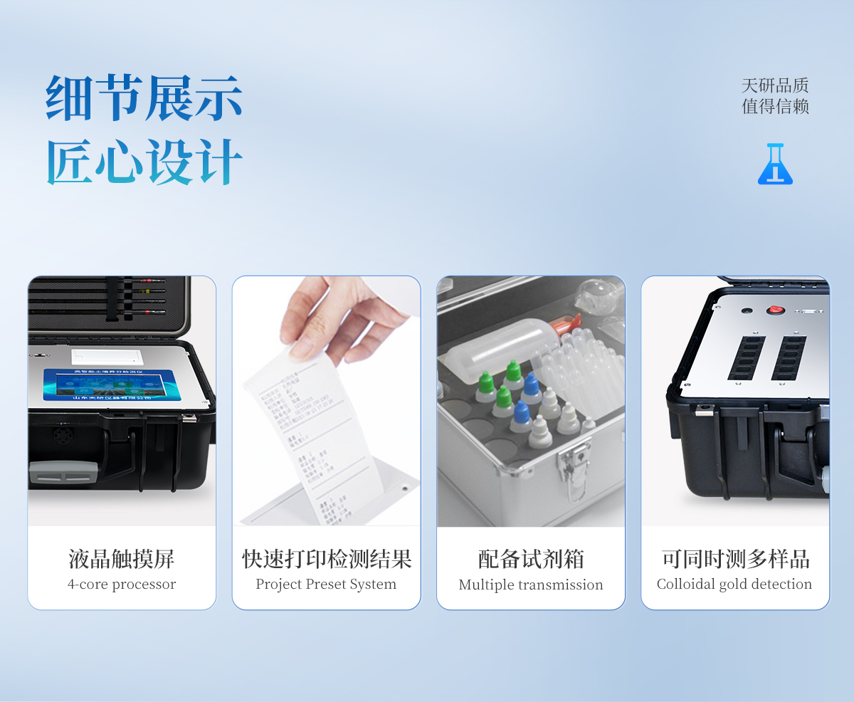 | 配套齊全:該儀器集藥、器、儀為一體,攜帶方便,相當于一個小型移動實驗室,無需用戶自配附件,亦可靈活野外流動測試。適于農(nóng)業(yè)服務部門或農(nóng)資經(jīng)銷商、合作社、肥料廠商、大種植戶測土施肥。 | 檢測功能全:測試項目國內(nèi)外全面,除標配試劑外,其他各類藥劑均可加配選購。 | 操作簡便、速度快捷,配套整套附件及成品藥劑開瓶即用,無須配置。 |