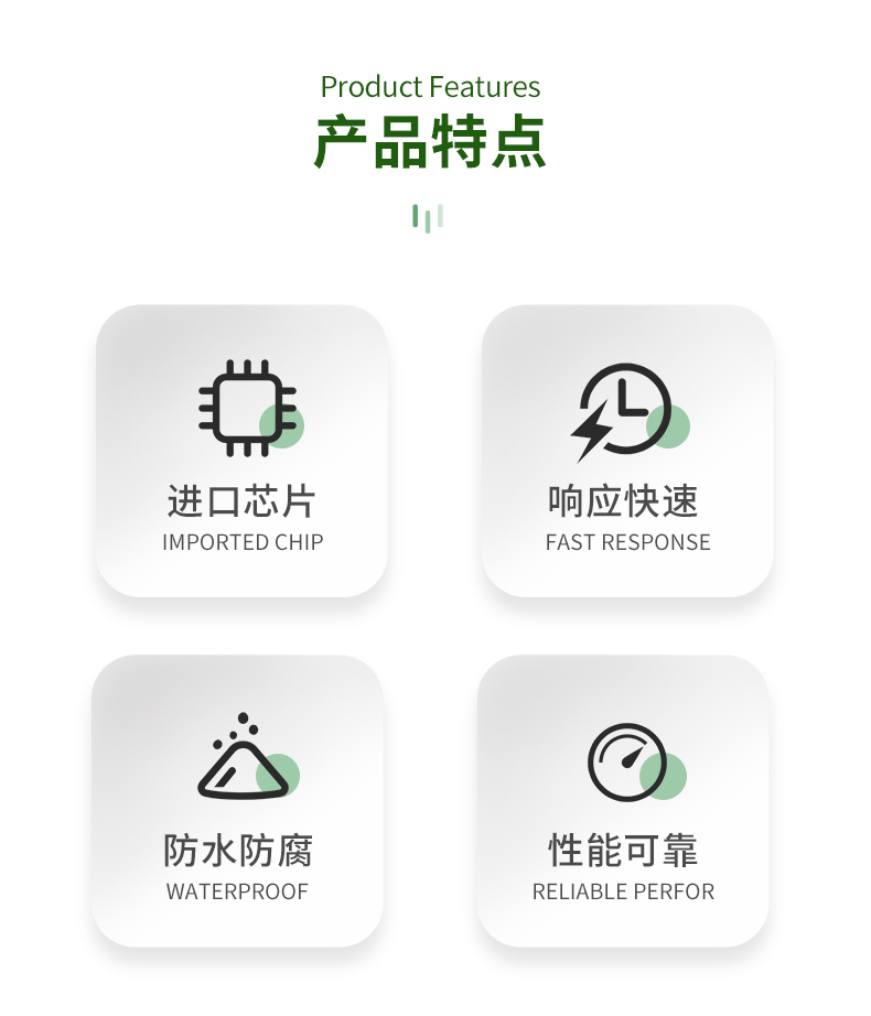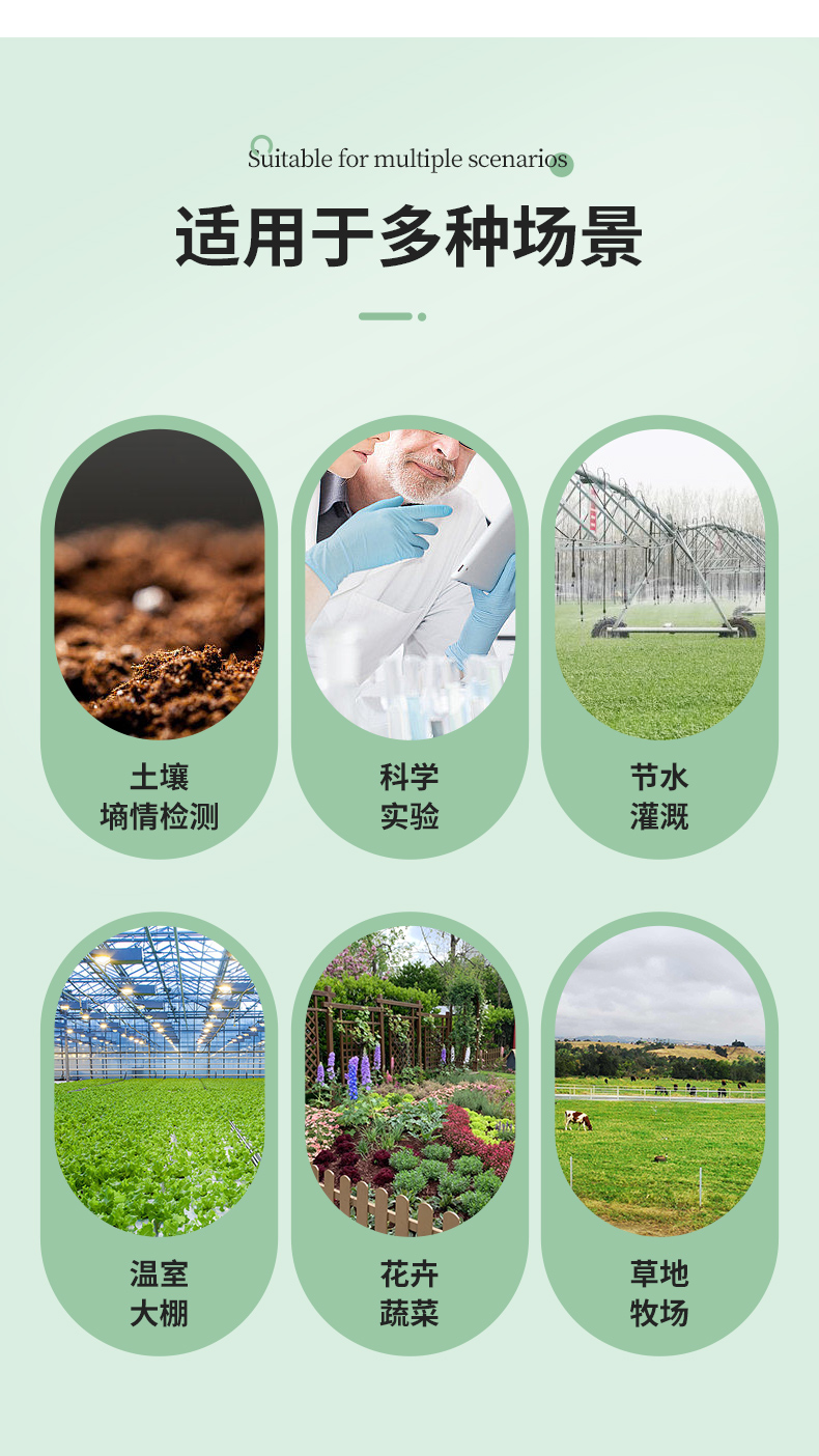 | (1)土壤含水率、電導(dǎo)率以及溫度三參數(shù)合一。 | (2)也可用于水肥一體溶液、以及其他營養(yǎng)液與基質(zhì)的電導(dǎo)率。 | (3)電極采用特殊處理的合金材料,可承受較強(qiáng)的外力沖擊,不易損壞。 | (4)完全密封,耐酸堿腐蝕,可埋入土壤或直接投入水中進(jìn)行長期動態(tài)檢測。 | (5)精度高,響應(yīng)快,互換性好,探針插入式設(shè)計保證測量**,性能可靠。 | (6)完善的保護(hù)電路與多種信號輸出接口可選。 |
