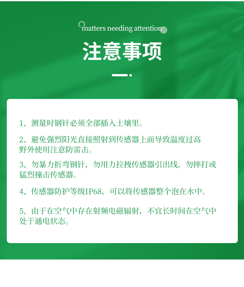 | 信號輸出類型:電壓輸出0-2V(輸出阻抗約0歐)電流輸出4-20mA(負(fù)載電阻<500ohm)RS485接口Modbus協(xié)議 | 供電電壓:3.6-30V/DC直流12-30V/DC直流3.6-30V/DC直流 | 靜態(tài)功耗:6mA@24V DC直流50mA@24V DC直流(兩電流輸出通道均為20mA)6mA@24V DC直流 | 土壤水分量程:可選量程:0-50%,0-100%分辨率:0-50%內(nèi)0.03%,50-100%內(nèi)1%精度:0-50%內(nèi)2%,50-100%內(nèi)3% | 電導(dǎo)率量程:可選量程:0-5000us/cm,10000us/cm,20000us/cm分辨率:0-10000us/cm內(nèi)10us/cm, 100000-20000us/cm內(nèi)50us/cm精度0-10000us/cm范圍內(nèi)為±3%; 10000-20000us/cm范圍內(nèi)為±5% | 電導(dǎo)率溫度補(bǔ)償:內(nèi)置溫度補(bǔ)償傳感器,補(bǔ)償范圍0-50℃ | 溫度測量量程:量程:-40~80℃,分辨率:0.1℃,精度:±0.5℃ | 測量原理與測量方式:土壤水分FDR方法,土壤電導(dǎo)率交流電橋法土壤原位插入或浸沒入培養(yǎng)液、水肥一體營養(yǎng)液中直接測試 | 防護(hù)等級:IP68浸沒水中可長期使用 | 運(yùn)行環(huán)境:-40~85℃ | 探針材料:防腐特制電極 | 密封材料:黑色阻燃環(huán)氧樹脂 | 安裝方式:全部埋入或探針全部插入被測介質(zhì) | 默認(rèn)線纜長度:2米,線纜長度可按要求定制 | 連接方式:預(yù)裝冷壓端子 | 外形尺寸:45*15*145mm | 電極長度:70mm |