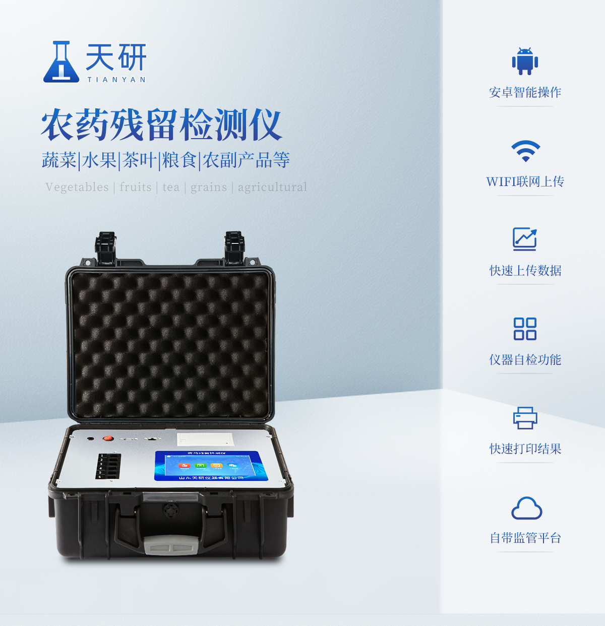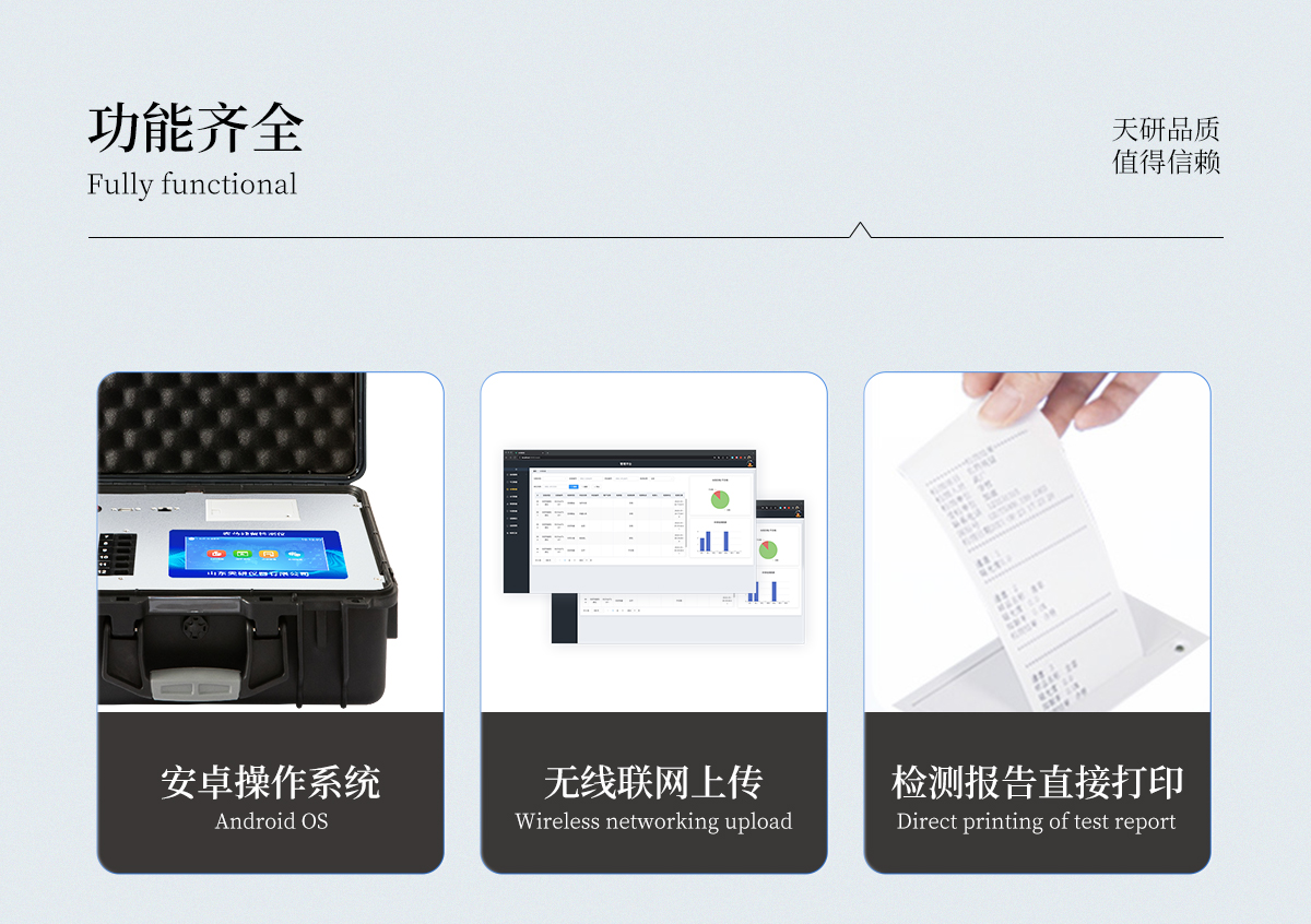 | 機(jī)箱采用工業(yè)級(jí)ABS工程塑料箱,方便攜帶,穩(wěn)固耐用,便于流動(dòng)測(cè)試。 | 智能操作系統(tǒng),采用更加人性化操作,主控采用多核處理器,主頻1.88Ghz,運(yùn)轉(zhuǎn)速度更快速,穩(wěn)定性更強(qiáng)。 | 自動(dòng)判斷樣品是否合格,檢測(cè)結(jié)果更加直觀。 | 儀器具有100多種蔬菜名稱菜單庫,分類管理,并可按需添加或刪除蔬菜名,編輯蔬菜名稱,可直接打印出蔬菜名稱。 | 檢測(cè)通道:12個(gè)檢測(cè)通道,可以同時(shí)測(cè)試多個(gè)樣品,循環(huán)檢測(cè),即放即檢,每個(gè)樣品由程序控制分別獨(dú)立工作,不會(huì)互相干擾。 | 儀器具有wifi聯(lián)網(wǎng)功能,可將數(shù)據(jù)快速上傳電腦,進(jìn)行數(shù)據(jù)管理與統(tǒng)計(jì),4G信號(hào)GPRS遠(yuǎn)傳功能,可插手機(jī)卡實(shí)現(xiàn)數(shù)據(jù)遠(yuǎn)傳平臺(tái),。 | 顯示方式:7英寸高靈敏真彩觸摸屏顯示,人性化中文操作界面,讀數(shù)直觀、簡單。 | 打印機(jī)采用串口5v打印,可選擇手動(dòng)打印或者自動(dòng)打印,三分鐘出打印結(jié)果,打印格式為檢測(cè)人姓名、吸光度差值、檢測(cè)時(shí)間、檢測(cè)機(jī)構(gòu)、樣品名稱及結(jié)果判定。 | 光源采用進(jìn)口超高亮發(fā)光二極管,具有低功耗、高精度、穩(wěn)定性強(qiáng)、光源可控可以關(guān)掉不使用的光源,響應(yīng)速度快等優(yōu)點(diǎn)。 | 智能恒流穩(wěn)壓,光強(qiáng)自動(dòng)校準(zhǔn),長時(shí)間連續(xù)工作光源無溫漂現(xiàn)象。 | 采用USB2.0接口設(shè)計(jì),方便數(shù)據(jù)的存貯和移動(dòng),并可隨時(shí)與計(jì)算機(jī)直接相連,并且可用計(jì)算機(jī)控制儀器。實(shí)現(xiàn)數(shù)據(jù)查詢、瀏覽、分析、統(tǒng)計(jì)、打印等。 | 智能化程度高,儀器具有自檢功能:具有開機(jī)自檢和調(diào)零功能,具有自動(dòng)檢測(cè)重復(fù)性功能 | 儀器具有自身保護(hù)功能,可設(shè)置用戶名及密碼,防止非工作人員操作等。 | 采用DC12v直流供電,安全系統(tǒng)更高,并且配備6A鋰電池充電器。 | 儀器具有重新校準(zhǔn)、鎖定、恢復(fù)出廠設(shè)置功能。 |