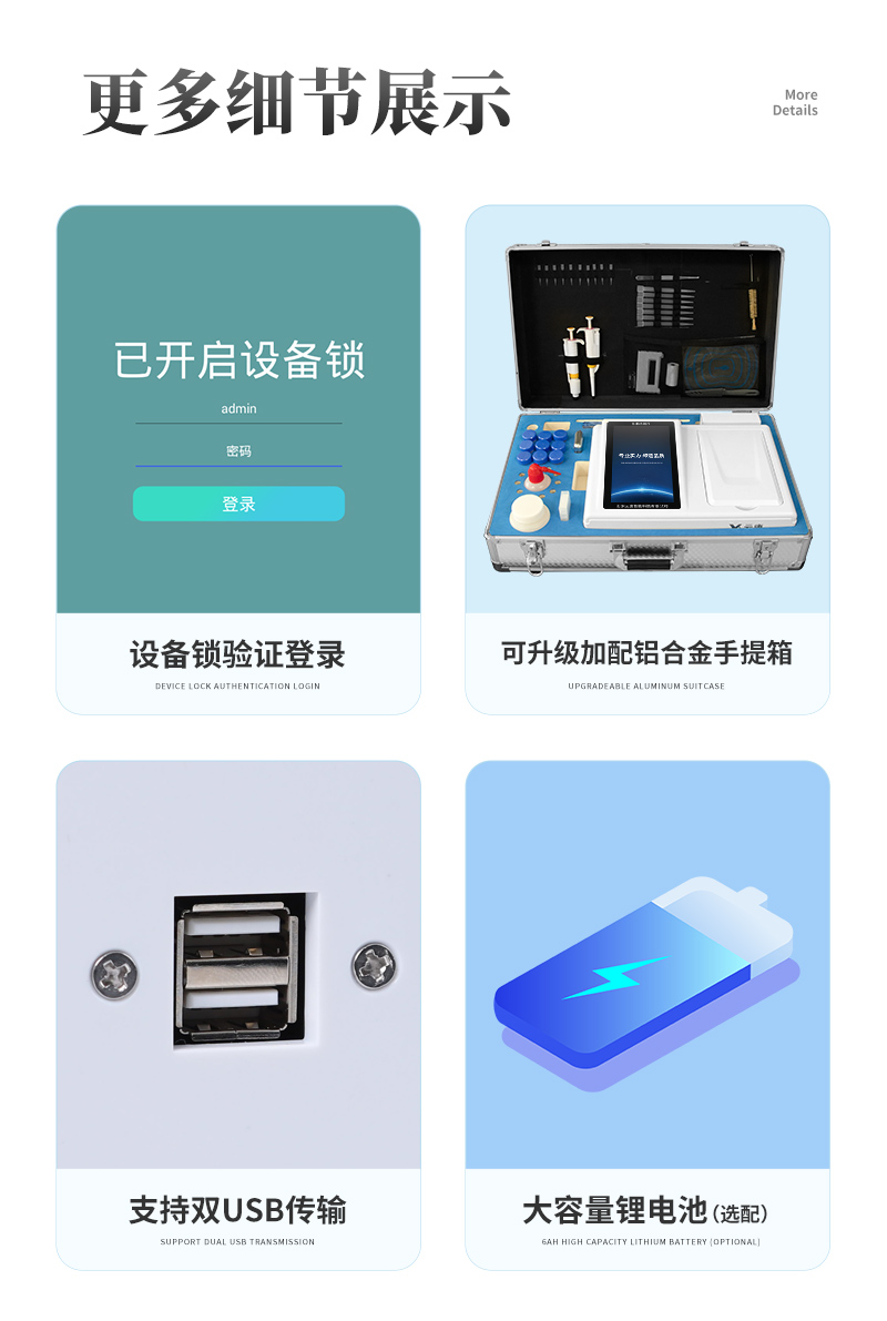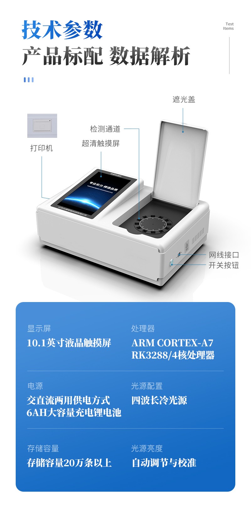 | 儀器采用臺式一體化系統(tǒng)檢測技術(shù),將分光光度模塊、新型農(nóng)殘檢測模塊、數(shù)字化管理模塊、無線通訊模塊高度集成于一體,支持檢測200種食品安全檢測項目,同時預(yù)留升級檢測方法。 | 儀器檢測模塊標準化、智能化,可隨意自由組合。檢測箱體內(nèi)置多個標準檢測單元,檢測模塊可以調(diào)整配置。 | 儀器采用全新安卓智能系統(tǒng),主控芯片采用 ARM Cortex-A7,RK3288/4核處理器,10.1寸高清液晶觸摸豎屏,更加**的UI交互界面,運轉(zhuǎn)快捷;儀器配備無線通信模塊: 4G(APN)通訊模塊、Wifi模塊,藍牙傳輸,同時具有雙USB接口以及RJ45接口能以多種方式實現(xiàn)數(shù)據(jù)保存和數(shù)據(jù)傳輸功能。 | 創(chuàng)新檢測模式: | ★檢測通道:≥12通道;采用精密旋轉(zhuǎn)比色池設(shè)計,使用同芯片同光源校準精度,解決不同光源之間的誤差值。1-12通道間誤差0.1%。(**號:ZL202022821055.2) | ★儀器具有自動識別比色皿檢測功能,即:將樣品比色皿放入儀器后,點擊樣品檢測,儀器自動識別比色皿進行通道檢測。 | 進口高精光源: | 高精度進口四波長冷光源,通道配置 410、520、590、630nm 波長光源,一個光源芯片驅(qū)動一個光源,誤差極小,每臺設(shè)備單獨**校準光源,**比對,同時參照四種不同波段光源全方位覆蓋市面上99%的農(nóng)殘食品項目檢測。 | 智能化操作系統(tǒng): | 便捷操作系統(tǒng):設(shè)備檢測時可在同一檢測界面自動對應(yīng)相關(guān)檢測通道一次性選擇1-12個樣品名稱,無須退出界面,節(jié)省操作時間。 | 數(shù)據(jù)集成系統(tǒng):設(shè)備首頁自動統(tǒng)計檢測數(shù)據(jù)包含:周檢測數(shù)據(jù)、月檢測數(shù)據(jù),全部檢測總數(shù)量,均包含檢測總數(shù),合格數(shù),不合格數(shù),以及相關(guān)柱形分析圖,對各項檢測數(shù)據(jù)清晰掌握,無需電腦查詢,更加快捷直觀。 | 項目預(yù)設(shè)系統(tǒng):支持添加單個及多個相同或不相同的任務(wù)預(yù)設(shè),一鍵快速調(diào)取,每一個任務(wù)分別可以設(shè)置不同的樣品、批次、編號、來源、備注、抽樣信息、檢測信息、受檢信息、復(fù)核信息等更多信息。無縫鏈接平臺和APP實時查看下發(fā)任務(wù)。 | 數(shù)據(jù)監(jiān)管系統(tǒng):同步對接監(jiān)管平臺,數(shù)據(jù)可局域網(wǎng)和互聯(lián)網(wǎng)數(shù)據(jù)上傳,檢測結(jié)果可選擇直接傳至食品安全監(jiān)管平臺。集成OSS輸出存儲服務(wù)、區(qū)分設(shè)備定向管理應(yīng)用,進行區(qū)域食品安全監(jiān)管及大數(shù)據(jù)分析處理與數(shù)據(jù)統(tǒng)計,檢測區(qū)域食品安全長短期動態(tài),達到食品安全問題預(yù)估、預(yù)警。 | 自定義打印系統(tǒng):內(nèi)置全新打印系統(tǒng),新創(chuàng)自定義打印方式,可按需靈活設(shè)置開啟或關(guān)閉:產(chǎn)品合格證(國家農(nóng)業(yè)部標準要求),二維碼,抽樣信息、檢測信息,受檢信息、復(fù)核信息、抽樣日期、檢測日期等信息的打印。 | 系統(tǒng)遠程更新功能:可定向分客戶分儀器更新系統(tǒng),按照不同客戶后期實際需求添加項目,無需機器返廠,即可遠程實時升級全新系統(tǒng),節(jié)省時間成本及避免運輸造成設(shè)備損壞。 | 儀器主機采用一體化防水、抗壓、防撞擊、防腐蝕箱體設(shè)計,同時配備交直流供電,可連接車載電源,可選配大容量充電鋰電池,滿足現(xiàn)場野外檢測需求。 | 安全證書,放心保障:儀器具有中國計量科學研究院校準證書,**認證。 |