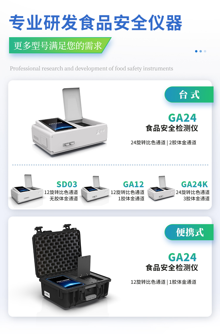 | 食品添加劑:二氧化硫、雙氧水、亞硝酸鹽、硝酸鹽、苯甲酸鈉、山梨酸鉀、糖精鈉、甜蜜素、木耳硫酸鎂等 | 有毒有害物質(zhì):甲醛、吊白塊、硼砂、過(guò)氧化苯甲酰、溴酸鉀、羅丹明B、三聚氰胺、蘇丹紅、工業(yè)堿、尿素、明礬等 | 果蔬:農(nóng)藥殘留(酶抑制率法) | 病害肉:組胺、揮發(fā)性鹽基氮 | 重金屬含量:鉛、鎘、鉻、汞、砷、錫、鎳、鋁等 | 水產(chǎn)品安全類(lèi):孔雀石綠、氯霉素、呋喃妥因、呋喃西林、呋喃它酮、呋喃唑酮等 | 瘦肉精激素類(lèi)(獸藥):鹽酸克倫特羅、沙丁胺醇、萊克多巴胺、己烯雌酚等 | 抗生素殘留:四環(huán)素類(lèi)、硝基呋喃類(lèi)、磺胺類(lèi)、β-興奮劑類(lèi)、沙星類(lèi)、磺胺類(lèi)、喹諾酮類(lèi),甲砜霉素,氟苯尼考,金剛烷胺、替米考星、慶大霉素、林可霉素、鏈霉素、恩諾沙星、環(huán)丙沙星、頭孢啦啶、青霉素、阿莫西林等 | 真菌毒素類(lèi):食用油、糧食及飼料中黃曲霉毒素B1、黃曲霉毒素總量,奶中黃曲霉毒素M1、嘔吐毒素、玉米赤霉烯酮、赭曲霉毒素A、T2毒素、伏馬毒素等 | 水酒飲品分析:乳品及牛奶中蛋白質(zhì);酒中甲醇、乙醇、雜醇油;蜂蜜中果糖和葡萄糖、蔗糖、淀粉酶、酸度;水中氰化物、余氯,飲料中維C等 | 調(diào)味品成分: 食醋的總酸、醬油的總酸、芝麻油純度、谷氨酸鈉、醬油氨基酸態(tài)氮、食鹽中亞鐵氰化鉀、食鹽中碘等 | 食用色素類(lèi):紅色色素(胭脂紅、莧菜紅、莧菜紅)、黃色色素(檸檬黃、日落黃)、藍(lán)色色素(亮藍(lán))等 | 動(dòng)物疫病類(lèi):禽流感、新城疫、牛羊口蹄疫、牛羊結(jié)核病、牛羊包蟲(chóng)、牛羊布病、小反芻獸、豬藍(lán)耳病毒、豬瘟病毒、豬偽狂犬病毒、豬細(xì)小、豬圓環(huán)、犬細(xì)小病毒、犬瘟熱病毒、犬狂犬病毒等 | 蜂蜜成分:果糖和葡萄糖、蔗糖、淀粉酶、酸度等 | 水產(chǎn)品安全類(lèi):孔雀石綠、氯霉素、呋喃妥因、呋喃西林、呋喃它酮、呋喃唑酮等 | 食用油脂:過(guò)氧化值、酸價(jià)等 | 蛋類(lèi)藥物殘留:氯霉素,四環(huán)素,磺胺類(lèi),喹諾酮類(lèi),呋喃西林,呋喃它酮,呋喃妥因,呋喃唑酮,氟苯尼考,阿莫西林、頭孢氨芐、紅霉素、鏈霉素等 |