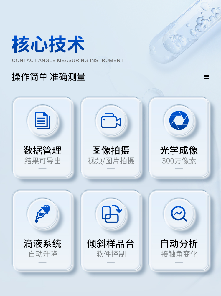 本機除了利用停滴法測試靜態(tài)接觸角外,更側(cè)重于利用傾斜板法測試和分析動態(tài)接觸角(包括前進接觸角、后退接觸角和滾動角);同時也可以測試液體表面張力、估算固體表面能和分析潤濕性。廣泛應用于生物化工、納米技術、涂層工藝、耐水材料、科教軍工等尖端領域的測試與研究。