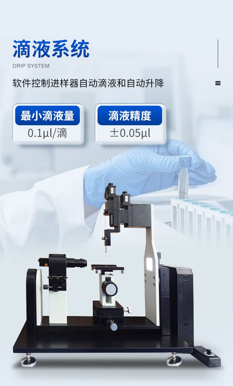 | 滴液方式:直進式精密微量注射器 | 控制方式:手動控制 | 滴液精度:0.1 μ l | 注射器:高精密氣密性注射器 | 容量:1000 μ l | 針頭:0.51mm 全不銹鋼超疏水針頭(標配) |