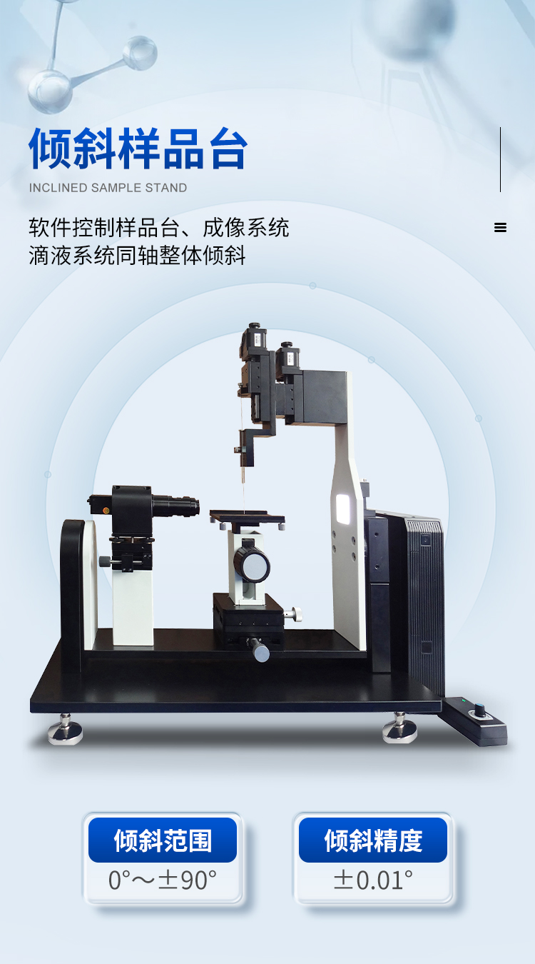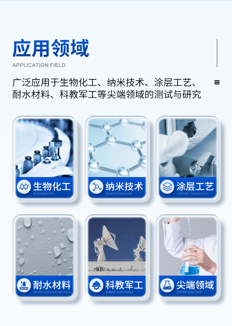 本機除了利用停滴法測試靜態(tài)接觸角外,更側(cè)重于利用傾斜板法測試和分析動態(tài)接觸角(包括前進接觸角、后退接觸角和滾動角);同時也可以測試液體表面張力、估算固體表面能和分析潤濕性。廣泛應(yīng)用于生物化工、納米技術(shù)、涂層工藝、耐水材料、科教軍工等尖端領(lǐng)域的測試與研究。