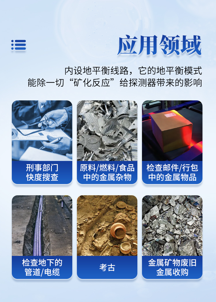 | 操作方式:地平衡/識(shí)別 | 發(fā)射頻率:6.99KHz | 音頻頻率:437Hz | 功 率:約2.5W | 電 源:11.1V4Ah鋰離子電池 | 標(biāo) 配:充電器、耳機(jī)、探測盤 | 探測盤尺寸:探測盤(直徑390mm) |