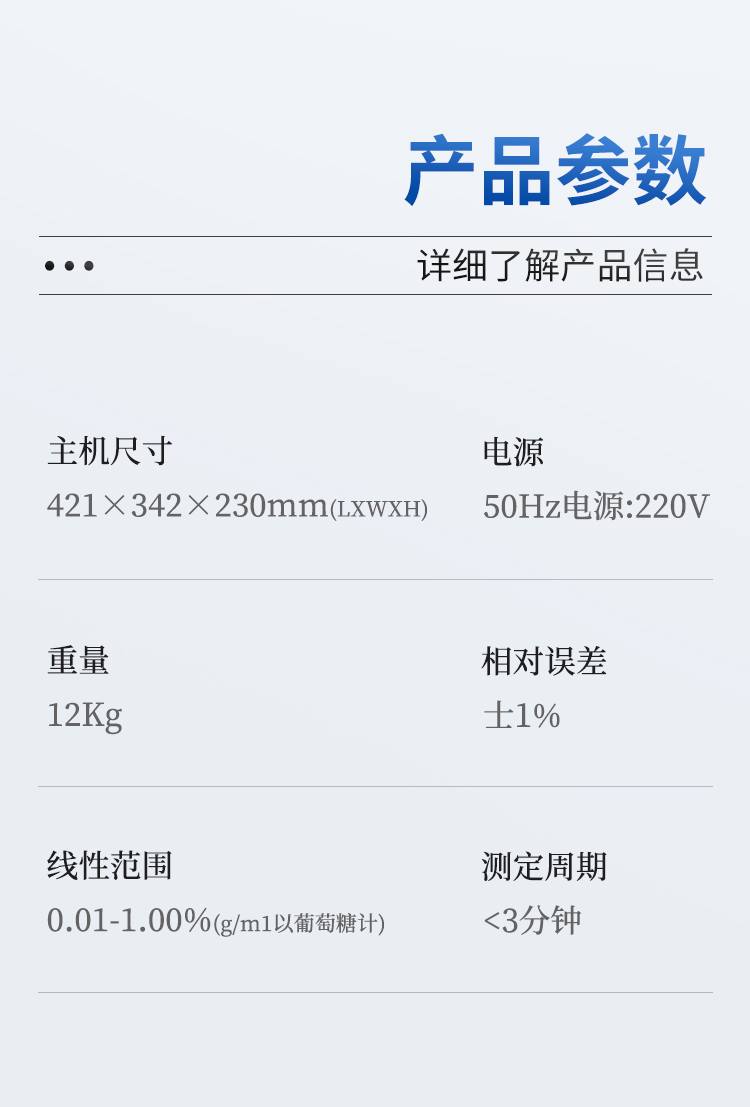 | 電源:50Hz電源:220V | 主機(jī)尺寸:421X342X230mm(LXWXH) | 重量:12Kg | 相對(duì)誤差:士1% | 線性范圍:0.01-1.00%(g/m1以葡萄糖計(jì))測(cè)定周期:<3分鐘 |