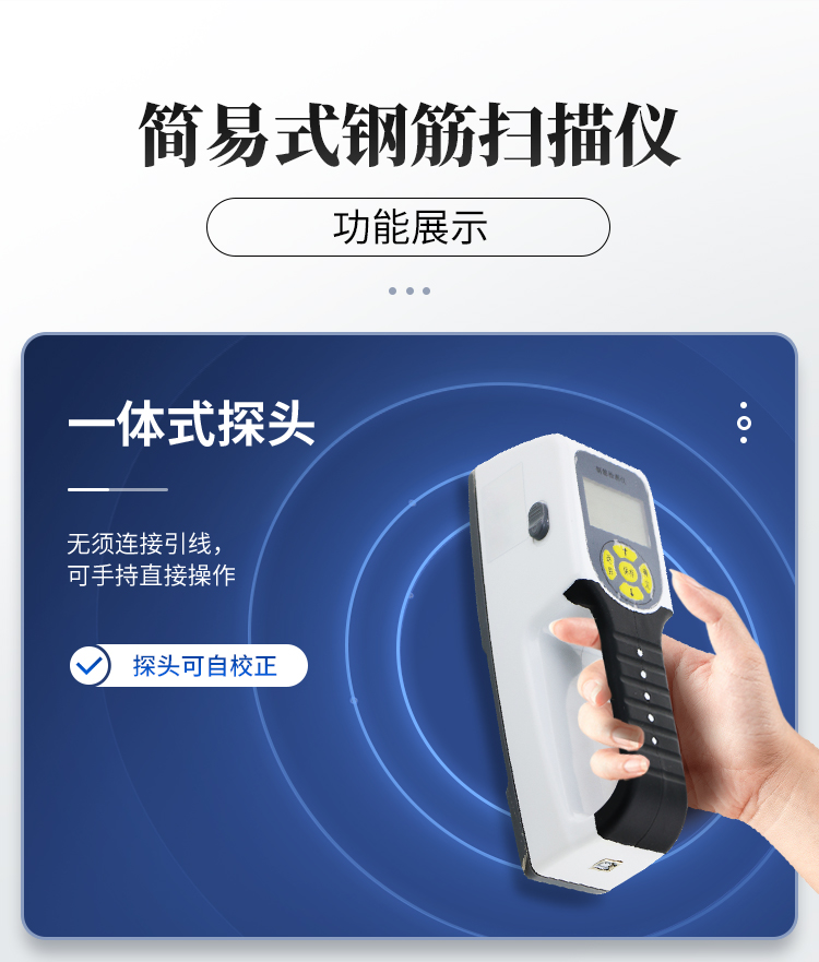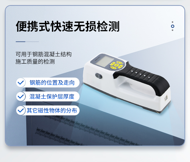 產(chǎn)品簡(jiǎn)介:該機(jī)為內(nèi)置一體式探頭,無(wú)須連接引線,可手持直接操作是一種便攜式無(wú)損鋼筋保護(hù)層厚度檢測(cè)儀器。可用于鋼筋混凝土結(jié)構(gòu)施工質(zhì)量的檢測(cè)。能夠在混凝土表面確定鋼筋的位置、布筋情況,測(cè)量混凝土保護(hù)層厚度,此外也可對(duì)混凝土結(jié)構(gòu)中的磁性體及導(dǎo)電體的位置進(jìn)行檢測(cè),如墻體內(nèi)的電纜、水暖管道等,施工前的探測(cè)可以有效