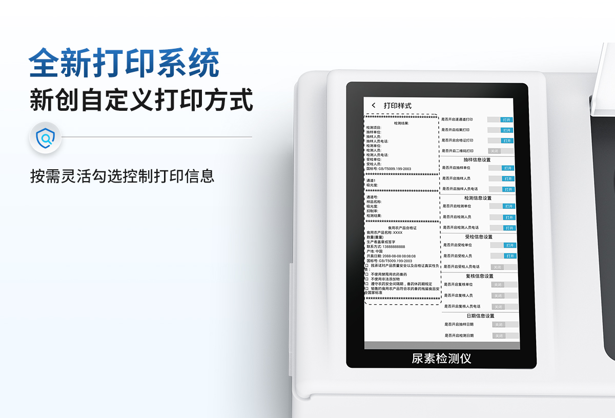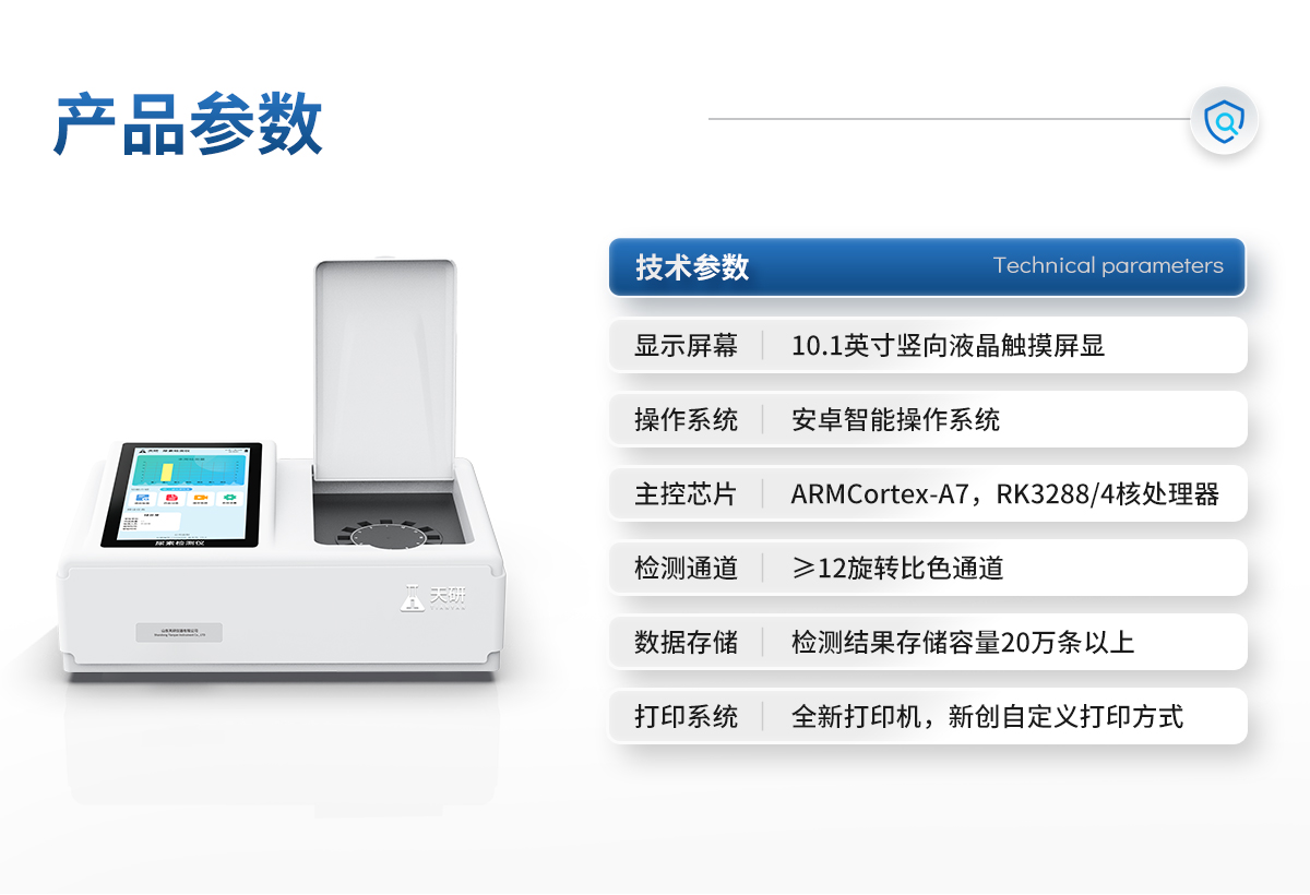 | 儀器采用臺式一體化系統(tǒng)檢測技術(shù),將分光光度模塊、數(shù)字化管理模塊、無線通訊模塊高度集成于一體,可支持檢測60種食品安全檢測項目,同時預(yù)留升級檢測方法。 | 儀器檢測模塊標(biāo)準(zhǔn)化、智能化,檢測項目可隨意自由組合。檢測箱體內(nèi)置多個標(biāo)準(zhǔn)檢測單元,檢測模塊可以調(diào)整配置。 | 顯示屏幕:儀器采用10.1英寸豎向液晶觸摸屏顯,搭配運行安卓智能操作系統(tǒng),主控芯片采用ARM Cortex-A7,RK3288/4核處理器,主頻1.88Ghz,操作方便,性能更強。 | 檢測通道:≥12通道;采用精密旋轉(zhuǎn)比色池設(shè)計,使用同芯片同光源校準(zhǔn)精度,解決不同光源之間的誤差值,更加準(zhǔn)確**。(1-12通道間誤差0.1%,**號:ZL202022821055.2) | 儀器光源:高精度進(jìn)口四波長冷光源,每個通道均配置 410、520、590、630nm 波長光源,標(biāo)配**的光路切換裝置,**光路切換功能可實現(xiàn)64波長,并且所有檢測項目可實現(xiàn)所有通道同時檢測。 | 設(shè)備可一鍵校準(zhǔn),自動保存校準(zhǔn)數(shù)據(jù),自動對比校驗,得到精準(zhǔn)光源,采用Android SP存儲數(shù)據(jù),光源數(shù)據(jù)永不丟失,方便每一次使用。 | 通訊接口:配備無線通信模塊、4G(APN)通訊模塊、藍(lán)牙傳輸,同時具有雙USB接口以及RJ45網(wǎng)線接口,可以多方式實現(xiàn)數(shù)據(jù)保存及數(shù)據(jù)傳輸。 | 存儲方式:支持U盤存儲,標(biāo)準(zhǔn)USB接口,免驅(qū)動安裝。檢測結(jié)果存儲容量20萬條以上,可生成Excel表格進(jìn)行拷貝,并具有登錄保護(hù)功能。 | 智能化操作系統(tǒng): | 便捷操作系統(tǒng):設(shè)備檢測時可在同一檢測界面自動對應(yīng)相關(guān)檢測通道一次性選擇1-12個樣品名稱,無須退出界面,節(jié)省操作時間。 | 數(shù)據(jù)集成系統(tǒng):設(shè)備首頁自動統(tǒng)計檢測數(shù)據(jù)包含:周檢測數(shù)據(jù)、月檢測數(shù)據(jù),全部檢測總數(shù)量,均包含檢測總數(shù),合格數(shù),不合格數(shù),以及相關(guān)柱形分析圖,對各項檢測數(shù)據(jù)清晰掌握,無需電腦查詢,更加快捷直觀。 | 數(shù)據(jù)庫系統(tǒng):十幾項數(shù)據(jù)庫分類管理儀器:包含項目類型、項目數(shù)據(jù)、檢測數(shù)據(jù)、歷史記錄、國標(biāo)信息、曲線信息、采樣信息、檢測信息、受檢信息、復(fù)核信息、圖表信息、光源校準(zhǔn)信息、打印樣式信息、樣品庫信息等等,數(shù)據(jù)庫之間互相協(xié)調(diào)聯(lián)動保證數(shù)據(jù)的真實完整性。同時產(chǎn)品數(shù)據(jù)庫以及歷史檢測記錄支持一鍵檢索功能。 | 限量規(guī)判系統(tǒng):具有限量查詢、添加物質(zhì)合規(guī)判定系統(tǒng)。檢測出結(jié)果后,系統(tǒng)自動調(diào)用系統(tǒng)數(shù)據(jù)庫中相關(guān)國標(biāo)進(jìn)行比對判定,客觀顯示判定結(jié)果是否合格。 | 項目預(yù)設(shè)系統(tǒng):儀器具有任務(wù)預(yù)設(shè)模塊,一鍵提前預(yù)設(shè),給出方便快捷的新檢測方案,每一個任務(wù)分別可以設(shè)置不同的樣品、批次、編號、來源、備注、抽樣信息、檢測信息、受檢信息、復(fù)核信息等更多信息。樣品送檢時一鍵調(diào)取保存信息,并可多次調(diào)取,大大提高檢測效率。 | 數(shù)據(jù)監(jiān)管系統(tǒng):同步對接監(jiān)管平臺,數(shù)據(jù)可局域網(wǎng)和互聯(lián)網(wǎng)數(shù)據(jù)上傳,檢測結(jié)果可選擇直接傳至食品安全監(jiān)管平臺。進(jìn)行區(qū)域食品安全監(jiān)管及大數(shù)據(jù)分析處理與數(shù)據(jù)統(tǒng)計,檢測區(qū)域食品安全長短期動態(tài),達(dá)到食品安全問題預(yù)估、預(yù)警。 | 全新打印系統(tǒng):內(nèi)置全新打印機(jī),新創(chuàng)自定義打印方式,可按需靈活勾選控制:二維碼,抽樣信息、檢測信息,受檢信息、復(fù)核信息、抽樣日期、檢測日期等信息的打印。 | A4紙版本報告打印功能(可選配):設(shè)備擁有兩種結(jié)果展示方式,可以自動生成A4打印模板和小票打印模板兩種樣式,可通過WiFi及網(wǎng)線等方式鏈接外置打印機(jī)可進(jìn)行打印。 | 供電模式:儀器交直流兩用,直流12V供電,可連接車載電源,可配6ah大容量充電鋰電池,電量可實時顯示,方便戶外流動測試。 | 儀器具備遠(yuǎn)程升級功能,可定向分客戶分儀器更新,開機(jī)后自動更新,并可持續(xù)性免費更新系統(tǒng)版本,無需像傳統(tǒng)產(chǎn)品返廠更新,節(jié)省時間及人力成本并避免了物流運輸返廠升級導(dǎo)致設(shè)備損壞的潛在風(fēng)險。 |