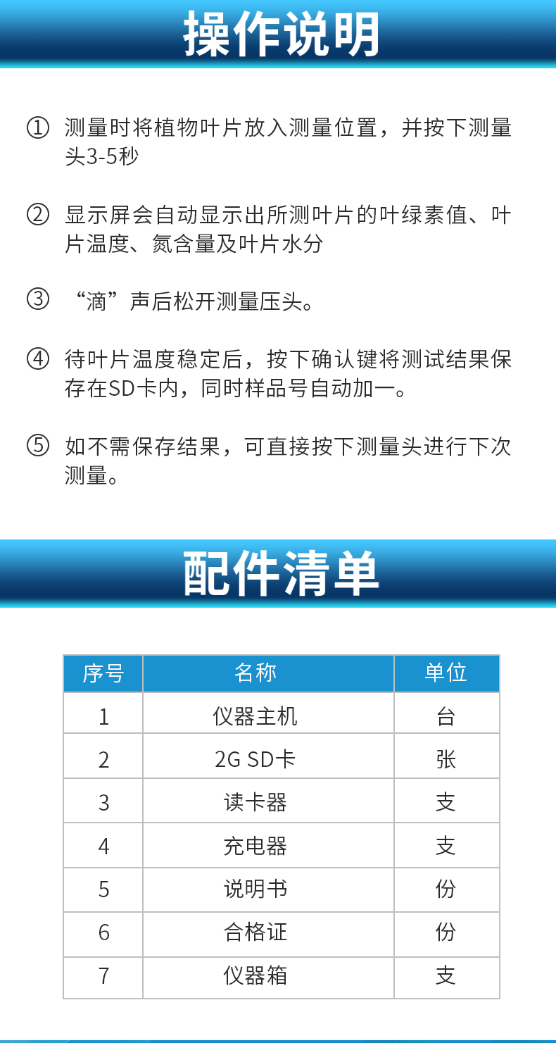 | 測(cè)量對(duì)象:陸地植物葉片 | 測(cè)量原理: 650nm和940nm兩種波長(zhǎng)下光密度差 | 測(cè)量范圍 0.0-99.9 SPAD | 測(cè)量面積 2mm*3mm | 測(cè)量精度 ±1.0 SPAD單位以內(nèi) (室溫下,SPAD值介乎0-50) | 重復(fù)性 ±0.3 SPAD單位以內(nèi) (SPAD值介乎0-50,保持測(cè)量位置不變) | 測(cè)量時(shí)間間隔 小于2秒 | 測(cè)量面積:2mm*2mm | 測(cè)量時(shí)間間隔:小于3秒 | 內(nèi)存 內(nèi)存16GB,可計(jì)算/顯示平均值,以及刪除異常值 | 樣品厚度** 1 mm | 樣品插入深度 10 mm | 電源 4.2V可充電鋰電池 | 電池容量 2000mah | 重量 250g | 外形尺寸 140×85×45mm(長(zhǎng)×寬×高) | 操作溫度/濕度范圍:0 - 50°C,相對(duì)濕度85% | 儲(chǔ)存溫度/濕度范圍:20 - 55°C,相對(duì)濕度85% | 標(biāo)準(zhǔn)配置:主機(jī), 充電器,USB數(shù)據(jù)線,便攜鋁箱,說(shuō)明書(shū)等 |