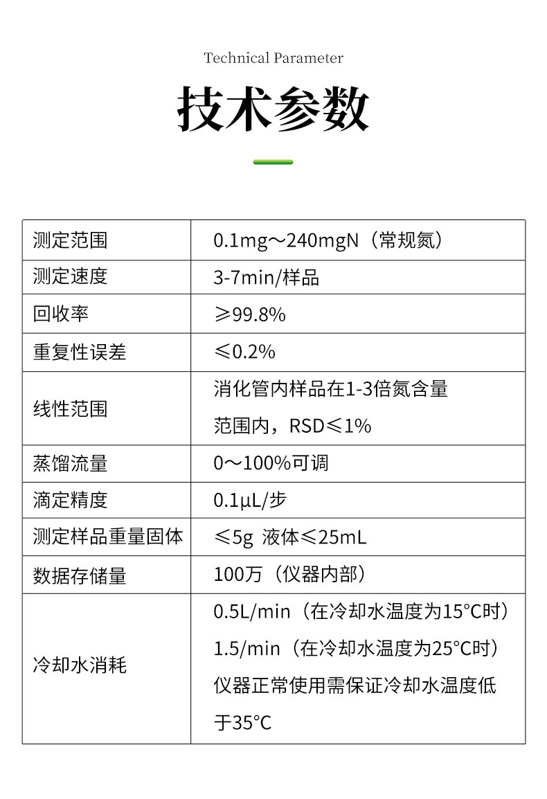 | 1.測(cè)定范圍:0.1mg~240mgN(常規(guī)氮) | 2.測(cè)定速度:3-7min/樣品 | 3.☆回收率:≥99.8% | 4.☆重復(fù)性誤差:≤0.2% | 5.線性范圍:消化管內(nèi)樣品在1-3倍氮含量范圍內(nèi),RSD≤1% | 6.蒸餾流量:0~100%可調(diào) | 7.☆滴定精度:0.1μL/步 | 8.測(cè)定樣品重量固體:≤6g 液體≤25mL | 9.☆數(shù)據(jù)存儲(chǔ)量:100萬(儀器內(nèi)部) | 10.☆500組用戶自定義方案 | 11.冷卻水消耗:0.5L/min(在冷卻水溫度為15℃時(shí)),1.5/min(在冷卻水溫度為25℃時(shí));儀器正常使用需保證冷卻水溫度低于35℃。 |