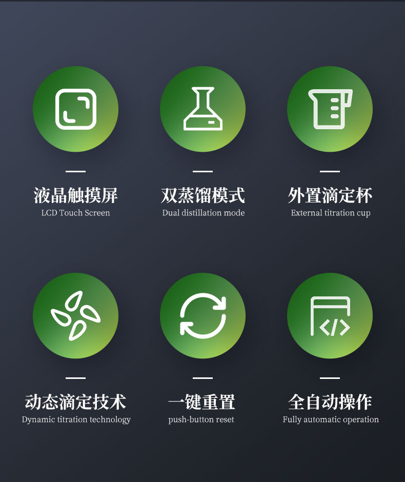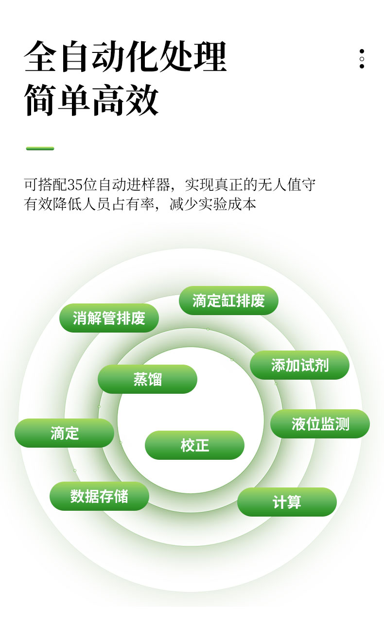 | 1.采用國家標(biāo)準(zhǔn)的凱氏定氮方法:濃硫酸環(huán)境消解樣品、堿性環(huán)境蒸汽蒸餾、硼酸吸收、指示劑滴定終點(diǎn)顏色判斷法。參與國家標(biāo)準(zhǔn)GB/T22923-2008、官方JJF109-2012《定氮儀校準(zhǔn)規(guī)范》的起草; | 2.☆全自動(dòng)添加試劑、蒸餾、滴定、消解管排廢、滴定缸排廢、校正、液位監(jiān)測(cè)、計(jì)算、數(shù)據(jù)存儲(chǔ)、生成測(cè)試報(bào)告并上傳,整個(gè)實(shí)驗(yàn)過程全自動(dòng)化處理簡單**; | 3.全自動(dòng)安全監(jiān)測(cè):安全門、消化管到位監(jiān)測(cè);蒸餾發(fā)生器具有壓力傳感器、蒸汽過壓保護(hù)、溫度傳感器、溫度保護(hù)開關(guān)、水位浮球與電位雙重檢測(cè)等多重保護(hù);蒸餾餾出液溫度和體積監(jiān)測(cè),避免溫度過高或蒸餾體積波動(dòng)影響測(cè)試結(jié)果;冷卻水流量實(shí)時(shí)監(jiān)測(cè),低水壓報(bào)警,停水自動(dòng)終止運(yùn)行;冷凝流出液溫度監(jiān)測(cè),保障樣品完全冷凝,確保實(shí)驗(yàn)結(jié)果準(zhǔn)確可靠; | 4.☆可搭配35位自動(dòng)進(jìn)樣器,實(shí)現(xiàn)真正的無人值守,有效降低人員占有率,減少實(shí)驗(yàn)成本; | 5.全新的多核ARM操作系統(tǒng),中英文操作界面可選,10英寸LED高清彩色液晶觸摸屏實(shí)時(shí)監(jiān)測(cè)和顯示實(shí)驗(yàn)過程; | 6.☆四級(jí)權(quán)限分級(jí)功能,從程序管理員-主管理員-輔助管理員-操作員使用不同權(quán)限,內(nèi)置時(shí)間鎖數(shù)據(jù)鎖符合“GLP和GMP”規(guī)定; | 7.☆上位機(jī)采用windows操作軟件,具有測(cè)試數(shù)據(jù)、回收率計(jì)算及統(tǒng)計(jì)、測(cè)試報(bào)告自動(dòng)生成等功能,可方便用戶通過PC機(jī)對(duì)數(shù)據(jù)進(jìn)行分析、處理;數(shù)據(jù)處理軟件包具有數(shù)據(jù)跟蹤、審核、輸出功能,具有操作、審核、批準(zhǔn)、管理、維護(hù)五級(jí)管理功能,測(cè)試信息可靠、可溯源; | 8.☆可通過USB2.0接口使用U盤輸出數(shù)據(jù);儀器內(nèi)置WIFI模塊,網(wǎng)絡(luò)自動(dòng)識(shí)別,可通過無線通訊,將詳細(xì)的測(cè)試信息同步上傳至PC端處理; | 9.雙蒸餾模式,蒸汽流量0~100%任意可調(diào); | 10.外置滴定杯,實(shí)驗(yàn)過程實(shí)時(shí)可見,滴定系統(tǒng)照明配置與成熟的顏色終點(diǎn)判定軟件配合,使外界光源的影響降至**; | 11.高精度滴定系統(tǒng),專業(yè)一體式精工柱塞,確保測(cè)試精度和使用的可靠性; | 12.☆滴定系統(tǒng)采用動(dòng)態(tài)滴定技術(shù),可實(shí)現(xiàn)邊蒸餾邊滴定和滴定系統(tǒng)自動(dòng)判斷和切換滴定速度,真正達(dá)到蒸餾、滴定、計(jì)算過程同步完成,減少實(shí)驗(yàn)時(shí)間40%; | 13.滴定顏色可自動(dòng)與手動(dòng)校準(zhǔn)。滴定終點(diǎn)判定采用高精度的十六位三基色數(shù)字信號(hào)顏色傳感器采集顏色信號(hào); | 14.☆儀器內(nèi)部可儲(chǔ)存100萬組數(shù)據(jù),云端可無限量儲(chǔ)存數(shù)據(jù)。測(cè)試結(jié)果可選擇包含Word、Excel等12種表示方式; | 15.耐強(qiáng)酸耐強(qiáng)堿液腐蝕隔膜試劑泵,超強(qiáng)的耐顆粒堵塞結(jié)構(gòu),加液穩(wěn)定,負(fù)壓抽吸無危險(xiǎn); | 16.☆防濺瓶采用高分子材質(zhì),耐高溫、強(qiáng)堿,同時(shí)保證氨氣不泄露,回收率不偏低; | 17.試劑桶液位監(jiān)測(cè),保證實(shí)驗(yàn)過程不出現(xiàn)缺液問題。 | 18.儀器具備自檢功能、具備一鍵重置。 | 19.標(biāo)配2種工作模式根據(jù)需求可增配硝態(tài)氮、高氮自動(dòng)測(cè)試模塊。 | 20.☆304不銹鋼蒸餾反應(yīng)室,特氟龍?zhí)幚砜梢暟踩T。 | 21.貼合氨逸出規(guī)律特殊設(shè)計(jì)的蒸餾系統(tǒng),確保高可靠的測(cè)試回收率 | 22.儀器內(nèi)置操作助手儀器更智能化。 |
