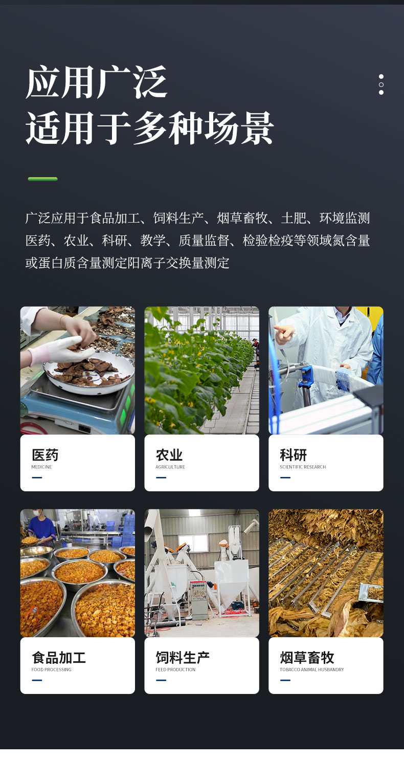 1.廣泛應(yīng)用于食品加工、飼料生產(chǎn)、煙草畜牧、土肥、環(huán)境監(jiān)測(cè)、醫(yī)藥、農(nóng)業(yè)、科研、教學(xué)、質(zhì)量監(jiān)督、檢驗(yàn)檢疫等領(lǐng)域氮含量或蛋白質(zhì)含量測(cè)定陽離子交換量測(cè)定。