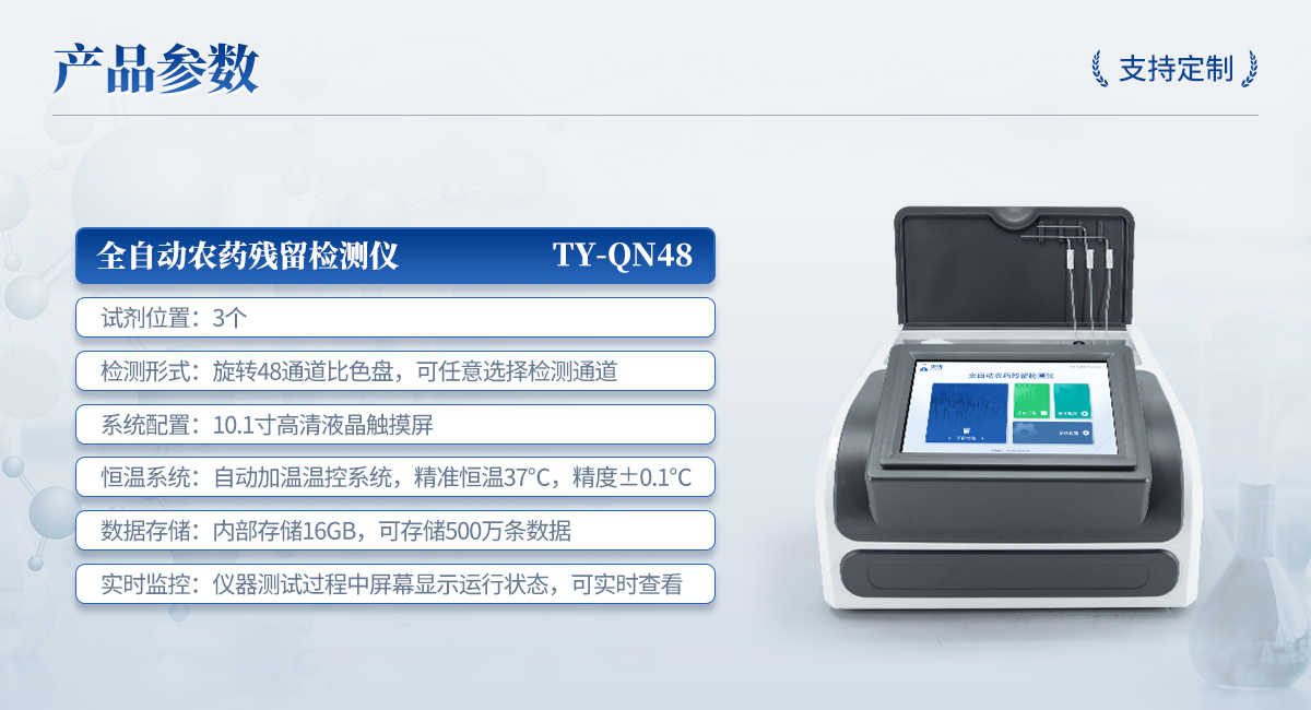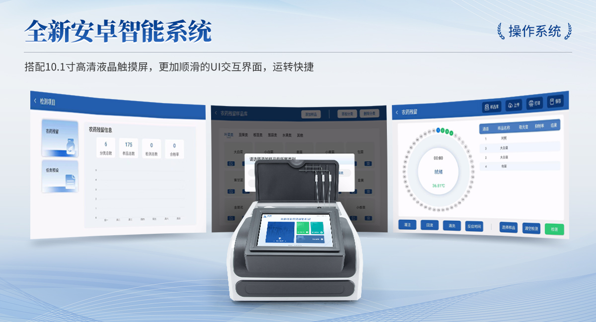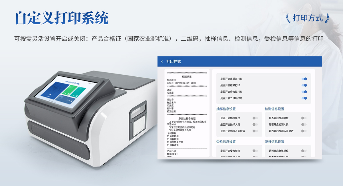 | 1. 試劑位置:3個 | 2. 檢測形式:旋轉(zhuǎn)48通道比色盤,可任意選擇檢測通道,自動對應(yīng)選擇通道。 | 3. 系統(tǒng)配置:10.1寸高清液晶觸摸屏,采用ARM Cortex-A7,RK3288/4核處理器,運行內(nèi)存1GB。Android7.1.1 系統(tǒng)分辨率1280×800。 | 4.恒溫系統(tǒng):具有自動加溫溫控系統(tǒng),精準(zhǔn)恒溫37℃,精度±0.1℃。 | 5.添加系統(tǒng):儀器按照試劑要求自動、按時、按量加入試劑,并且自動對未正常放置的樣本或異常的樣本進(jìn)行檢查并提示。 | 6.清洗功能:儀器具備回流及自動清洗管路功能,避免試劑污染。 | 7.混勻功能:設(shè)備具備自動混勻功能。 | 8.光源校準(zhǔn):設(shè)備可自動校準(zhǔn),確保檢測準(zhǔn)確度。 | 9.實時監(jiān)控:儀器測試過程中屏幕顯示運行狀態(tài),可實時查看。 | 10.數(shù)據(jù)存儲:內(nèi)部存儲16GB,可存儲500萬條數(shù)據(jù)。 | 11.樣品多選功能:設(shè)備具備樣品一鍵多選功能,選擇樣品自動匹配檢測通道。 | 12.項目預(yù)設(shè):可提前設(shè)置單個及多個相同或不相同的檢測任務(wù),可單次或者多次調(diào)取,減少檢測時間。 | 13.自定義打印系統(tǒng):內(nèi)置自定義打印系統(tǒng),可按需靈活設(shè)置開啟或關(guān)閉:產(chǎn)品合格證(國家農(nóng)業(yè)部標(biāo)準(zhǔn)),二維碼,抽樣信息、檢測信息,受檢信息等信息的打印。 | 14.A4版本報告打印功能:設(shè)備可自動生成A4版報告,A4報告帶二維碼,可掃描二維碼生成電子版,并可識別真?zhèn)巍?/td> | 15.傳輸方式:儀器配備無線通信模塊: 4G(APN)通訊模塊、Wifi模塊,藍(lán)牙傳輸模塊,同時具有USB接口以及RJ45接口能以多種方式實現(xiàn)數(shù)據(jù)保存和數(shù)據(jù)傳輸功能,設(shè)備數(shù)據(jù)可以同步上傳至平臺。 | 16.數(shù)據(jù)監(jiān)管系統(tǒng):設(shè)備自帶監(jiān)管平臺,并可同步對接監(jiān)管平臺,數(shù)據(jù)可局域網(wǎng)和互聯(lián)網(wǎng)數(shù)據(jù)上傳,檢測結(jié)果可直接傳至食品安全監(jiān)管平臺。達(dá)到食品安全問題預(yù)估、預(yù)警。 | 17.系統(tǒng)遠(yuǎn)程更新功能:無需設(shè)備返廠,即可遠(yuǎn)程實時升級全新系統(tǒng),節(jié)省時間成本及避免運輸造成設(shè)備損。 |