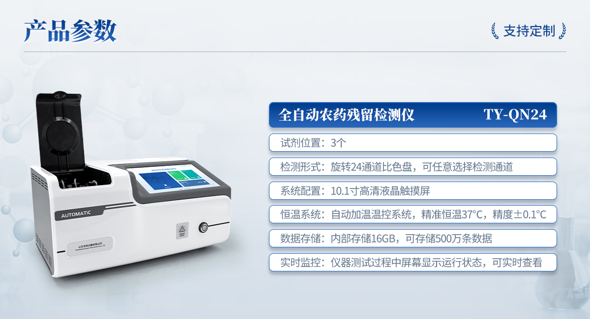 | 1. 試劑位置:3個 | 2. 檢測形式:旋轉24通道比色盤,可任意選擇檢測通道,自動對應選擇通道。 | 3. 系統(tǒng)配置:10.1寸高清液晶觸摸屏,采用ARM Cortex?-A7,RK3288/4核處理器,運行內存1GB。Android7.1.1 系統(tǒng)分辨率1280×800。 | 4.恒溫系統(tǒng):具有自動加溫溫控系統(tǒng),精準恒溫37℃,精度±0.1℃。 | 5.添加系統(tǒng):儀器按照試劑要求自動、按時、按量加入試劑,并且自動對未正常放置的樣本或異常的樣本進行檢查并提示。 | 6.清洗功能:儀器具備回流及自動清洗管路功能,避免試劑污染。 | 7.混勻功能:設備具備自動混勻功能。 | 8.光源校準:設備可自動校準,確保檢測準確度。 | 9.實時監(jiān)控:儀器測試過程中屏幕顯示運行狀態(tài),可實時查看。 | 10.數(shù)據(jù)存儲:內部存儲16GB,可存儲500萬條數(shù)據(jù)。 | 11.樣品多選功能:設備具備樣品一鍵多選功能,選擇樣品自動匹配檢測通道。 | 12.項目預設:可提前設置單個及多個相同或不相同的檢測任務,可單次或者多次調取,減少檢測時間。 | 13.自定義打印系統(tǒng):內置自定義打印系統(tǒng),可按需靈活設置開啟或關閉:產(chǎn)品合格證(國家農(nóng)業(yè)部標準),二維碼,抽樣信息、檢測信息,受檢信息等信息的打印。 | 14.A4版本報告打印功能:設備可自動生成A4版報告,A4報告帶二維碼,可掃描二維碼生成電子版,并可識別真?zhèn)巍?/td> | 15.傳輸方式:儀器配備無線通信模塊: 4G(APN)通訊模塊、Wifi模塊,藍牙傳輸模塊,同時具有USB接口以及RJ45接口能以多種方式實現(xiàn)數(shù)據(jù)保存和數(shù)據(jù)傳輸功能,設備數(shù)據(jù)可以同步上傳至平臺。 | 16.數(shù)據(jù)監(jiān)管系統(tǒng):設備自帶監(jiān)管平臺,并可同步對接監(jiān)管平臺,數(shù)據(jù)可局域網(wǎng)和互聯(lián)網(wǎng)數(shù)據(jù)上傳,檢測結果可直接傳至食品安全監(jiān)管平臺。達到食品安全問題預估、預警。 | 17.系統(tǒng)遠程更新功能:無需設備返廠,即可遠程實時升級全新系統(tǒng),節(jié)省時間成本及避免運輸造成設備損。 |