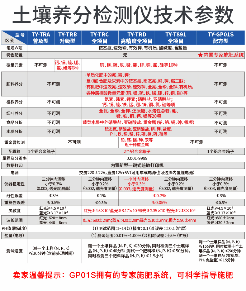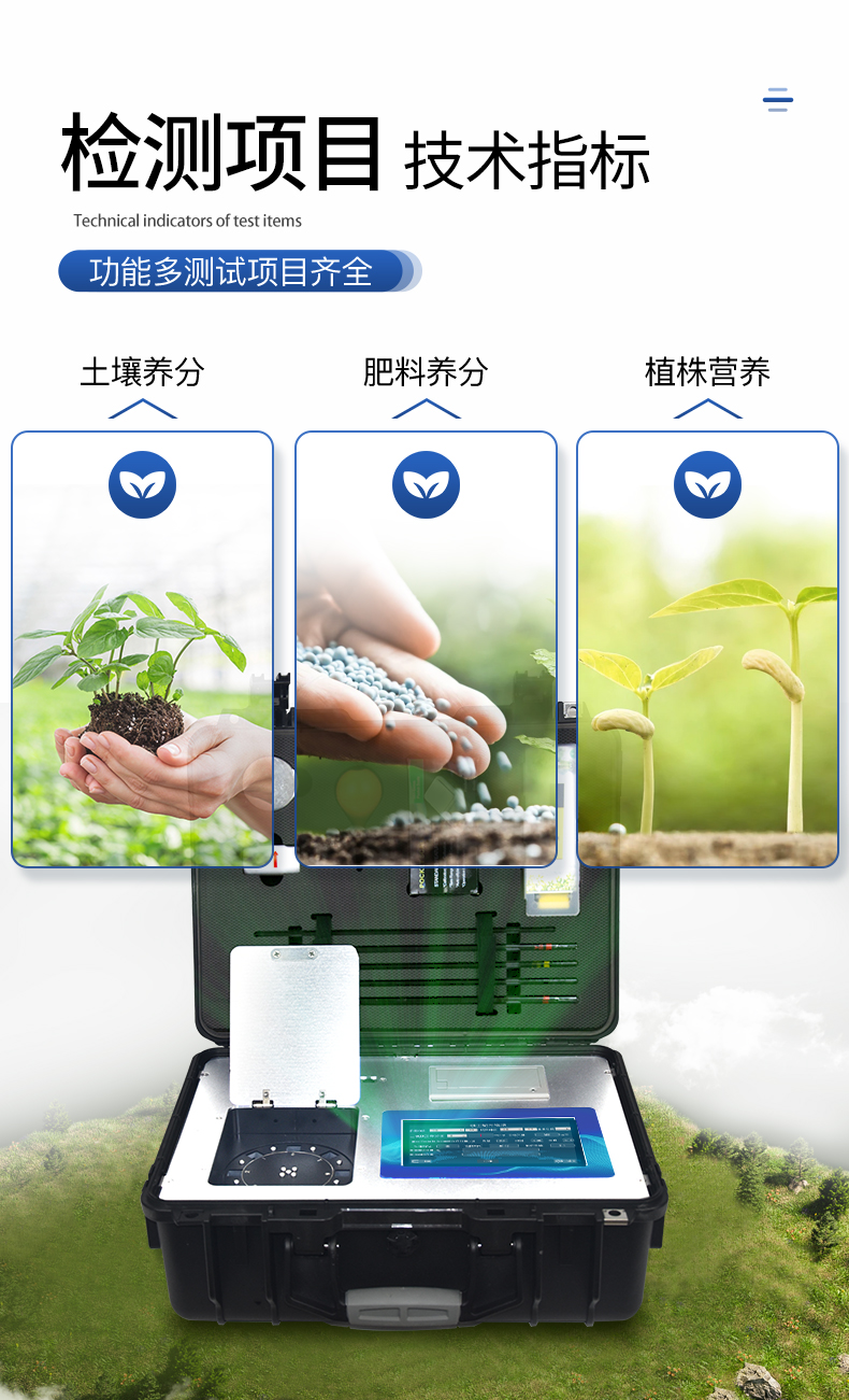 產(chǎn)品簡介: 配套齊全:該儀器集藥、器、儀為一體,攜帶方便,相當(dāng)于一個小型移動實驗室,無需用戶自配附件,亦可靈活野外流動測試。適于農(nóng)業(yè)服務(wù)部門或農(nóng)資經(jīng)銷商、高教院校、科研院所、合作社、肥料廠商、大種植戶測土施肥和鑒別肥料真假及環(huán)保檢測應(yīng)用。 檢測功能全:測試項目國內(nèi)外全面,除標(biāo)