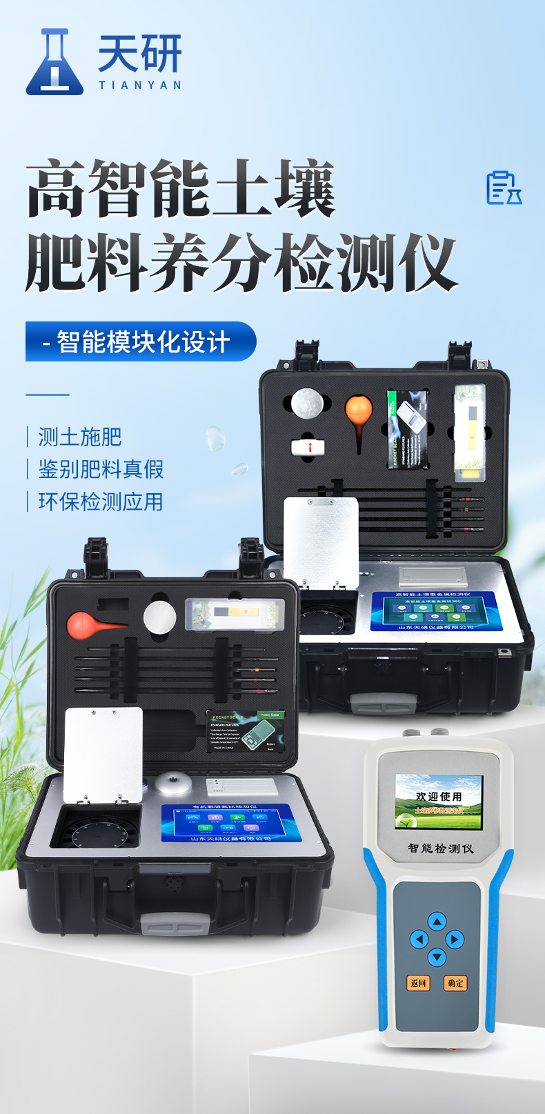 | 配套齊全:該儀器集藥、器、儀為一體,攜帶方便,相當(dāng)于一個小型移動實驗室,無需用戶自配附件,亦可靈活野外流動測試。適于農(nóng)業(yè)服務(wù)部門或農(nóng)資經(jīng)銷商、高教院校、科研院所、合作社、肥料廠商、大種植戶測土施肥和鑒別肥料真假及環(huán)保檢測應(yīng)用。 | 檢測功能全:測試項目國內(nèi)外全面,除標(biāo)配試劑外,其他各類藥劑均可加配選購。 | 速度快捷:無需空白對照和標(biāo)準(zhǔn)校準(zhǔn),操作簡便、直接測試,配套成品藥劑開瓶即用,無須配置。 |