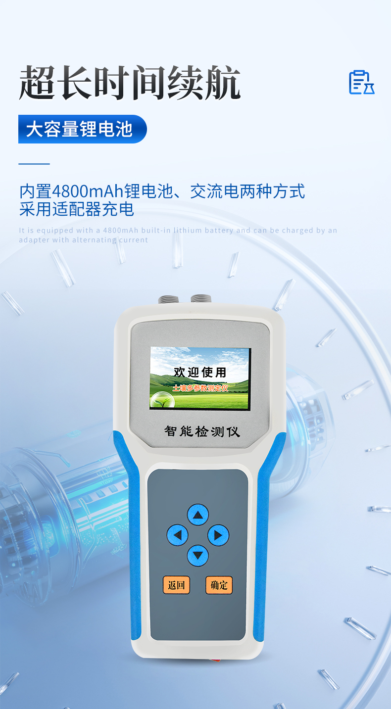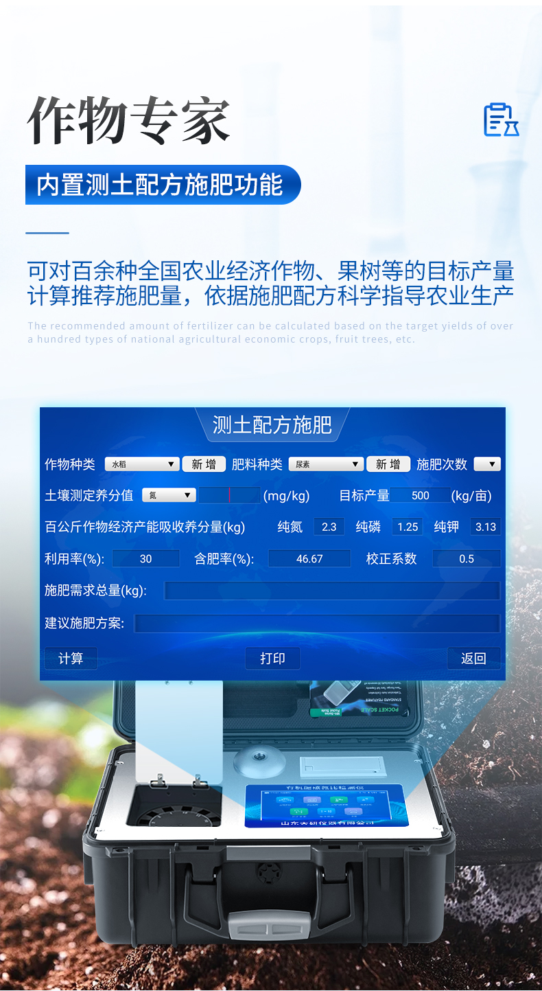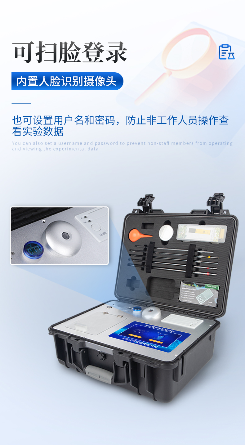 | ★1、安卓智能操作系統(tǒng)Android 7.1版本,主控芯片采用ARM Cortex-A7,RK3288/4核處理器,主頻1.88Ghz,運轉(zhuǎn)速度更快速,穩(wěn)定性更強。 | ★2、可檢測各種土壤、肥料、作物、食品、水質(zhì)、環(huán)境等共200多個測試項目,一機多用,功能齊全。 | ★3、測試速度更快!無需空白對照和標(biāo)準(zhǔn)校準(zhǔn),省卻以往繁瑣的操作步驟,一鍵式操作,直接讀取數(shù)據(jù),**率,低消耗。 | ★4、采用精密旋轉(zhuǎn)比色池設(shè)計(**號:ZL 2018 2 1777724.7),光源一致性更加**,保證檢測精度。 | ★5、12個旋轉(zhuǎn)檢測通道,一次性可快速檢測12個樣品,極大提升檢測效率,降低檢測成本。 | ★6、采用高精度濾光片技術(shù)自主**分析方法(**號:ZL 2020 2 1763837.9),**認證。 | ★7、具有自身保護功能,內(nèi)置人臉識別攝像頭可掃臉登錄,也可設(shè)置用戶名和密碼,防止非工作人員操作查看實驗數(shù)據(jù)。 | ★8、檢測過程中內(nèi)置校準(zhǔn)功能,智能恒流穩(wěn)壓,光強自動校準(zhǔn),確保檢測準(zhǔn)確度,取得中國計量科學(xué)研究院的《校準(zhǔn)證書》。 | ★9、儀器標(biāo)配wifi無線上傳、4G聯(lián)網(wǎng)傳輸、GPRS無線遠傳,快速上傳數(shù)據(jù)。 | ★10、配有智慧云農(nóng)業(yè)平臺,儀器連入無線網(wǎng)絡(luò)后,可將檢測數(shù)據(jù)可選擇性或批量無線上傳,方便用戶進行數(shù)據(jù)管理和長期分析。 | 11、儀器配同時具有USB接口、以太網(wǎng)接口,內(nèi)置大容量內(nèi)存,并可隨時用U盤拷貝數(shù)據(jù)。 | ★12、可用手機隨時登錄云平臺在線移動查看歷史數(shù)據(jù) | ★13、內(nèi)置作物專家施肥系統(tǒng),可對百余種全國農(nóng)業(yè)經(jīng)濟作物、果樹等的目標(biāo)產(chǎn)量計算推薦施肥量,依據(jù)施肥配方科學(xué)指導(dǎo)農(nóng)業(yè)生產(chǎn)。測土配方施肥結(jié)果可打印,打印內(nèi)容包含:作物種類、肥料種類、目標(biāo)產(chǎn)量、需求總量、建議施肥方案。 | ★14、內(nèi)置植物營養(yǎng)診斷標(biāo)準(zhǔn)圖譜,根據(jù)各農(nóng)作物營養(yǎng)缺失的圖片,進行葉面對比,診斷豐缺。 | ★15、4波長專業(yè)測試冷光源(紅、藍、綠、橙),光源波長穩(wěn)定,長時間連續(xù)工作光源無溫漂現(xiàn)象,壽命長達10萬小時級別,重現(xiàn)性好,準(zhǔn)確度高。 | 16、比色池部分采用標(biāo)準(zhǔn)1cm比色皿,無機械位移及磨損,光路測試定位**,有效屏蔽外光干擾,保證檢測結(jié)果優(yōu)于國標(biāo)要求。 | ★17、儀器系統(tǒng)內(nèi)帶有樣品前處理操作視頻,各種樣品檢測方法點擊視頻模塊即可觀看,檢測人員無需自學(xué)說明書,指導(dǎo)教學(xué)方便快速,方便新手快速操作。 | 18、內(nèi)置新一代高速熱敏打印機(無需色帶),打印內(nèi)容包含:檢測單位、檢測人員、檢測項目、通道號、吸光度、養(yǎng)分含量(mg/kg)、檢測時間、以及二維碼等信息 | ★19、高靈敏7寸真彩觸摸屏,采用更加**和人性化操作,高清晰高交互顯示,大程度降低傳統(tǒng)儀器的繁瑣操作和失誤,并取得多項《軟件著作權(quán)》。 | 20、內(nèi)置時鐘功能,方便操作時間記錄,長期歷史追溯。 | 21、可設(shè)置多賬戶賬號密碼登錄,**UI交互界面,不同的用戶可自由添加編輯檢測信息,保存后可長期使用。 | 22、GPS功能:可在野外作業(yè)時記錄經(jīng)緯度地點,滿足特殊用戶需求。 | 23、內(nèi)置低電壓提示功能,可在檢測時明確電量,避免測試數(shù)據(jù)偏移,同時具有斷電保護功能,斷電自動保存數(shù)據(jù),防止數(shù)據(jù)丟失。 | ★24、交直流兩用供電方式,內(nèi)置大容量充電鋰電池,滿電狀態(tài)下可連續(xù)工作10余小時,同時可外接車載電源蓄電。 | ★25、儀器具有中英文切換功能,可滿足出口要求。 | 26、高強度PVC工程塑料手提箱設(shè)計,堅固耐用,便于攜帶。 |