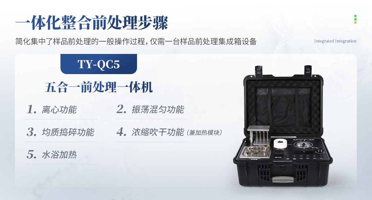 產(chǎn)品介紹: 應(yīng)國內(nèi)用戶的實際需求,自行研制開發(fā)的新型儀器——QC05型樣品前處理一體機。樣品前處理集成箱將樣本前處理過程中樣品濃縮、水浴恒溫、離心分層、均質(zhì)、振蕩混勻等步驟所需設(shè)備進行集成,僅需一臺樣品前處理集成箱設(shè)備即可完成所有樣本前處理過程,并且方便攜帶,不僅適用于現(xiàn)場檢測使用,還可用