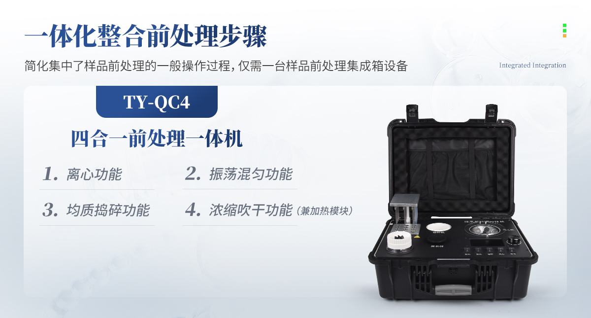 QC4型四合一樣品檢測(cè)前處理一體機(jī)(箱)是集吹干、離心、均質(zhì)、混勻功能的一體化整合,極大的簡化和集中樣品前處理的一般操作過程,結(jié)合移動(dòng)便攜的工程塑料箱體,特別適合農(nóng)獸藥殘留畜禽水產(chǎn)品質(zhì)量安全現(xiàn)場快速檢測(cè)。