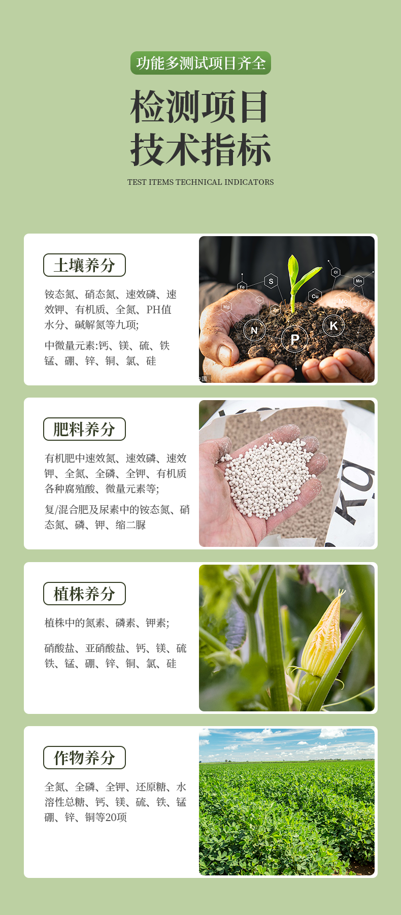 | 土壤養(yǎng)分:● 銨態(tài)氮、速效磷、速效鉀、水份、有機(jī)質(zhì)、酸堿度(pH試紙法)等項(xiàng); | 肥料養(yǎng)分:● 單質(zhì)化肥中的氮、磷、鉀; ● 復(fù)(混)合肥及尿素中的銨態(tài)氮、磷、鉀; ● 有機(jī)肥中速效氮、速效磷、速效鉀、全氮、全磷、全鉀、pH、有機(jī)質(zhì)等。 |