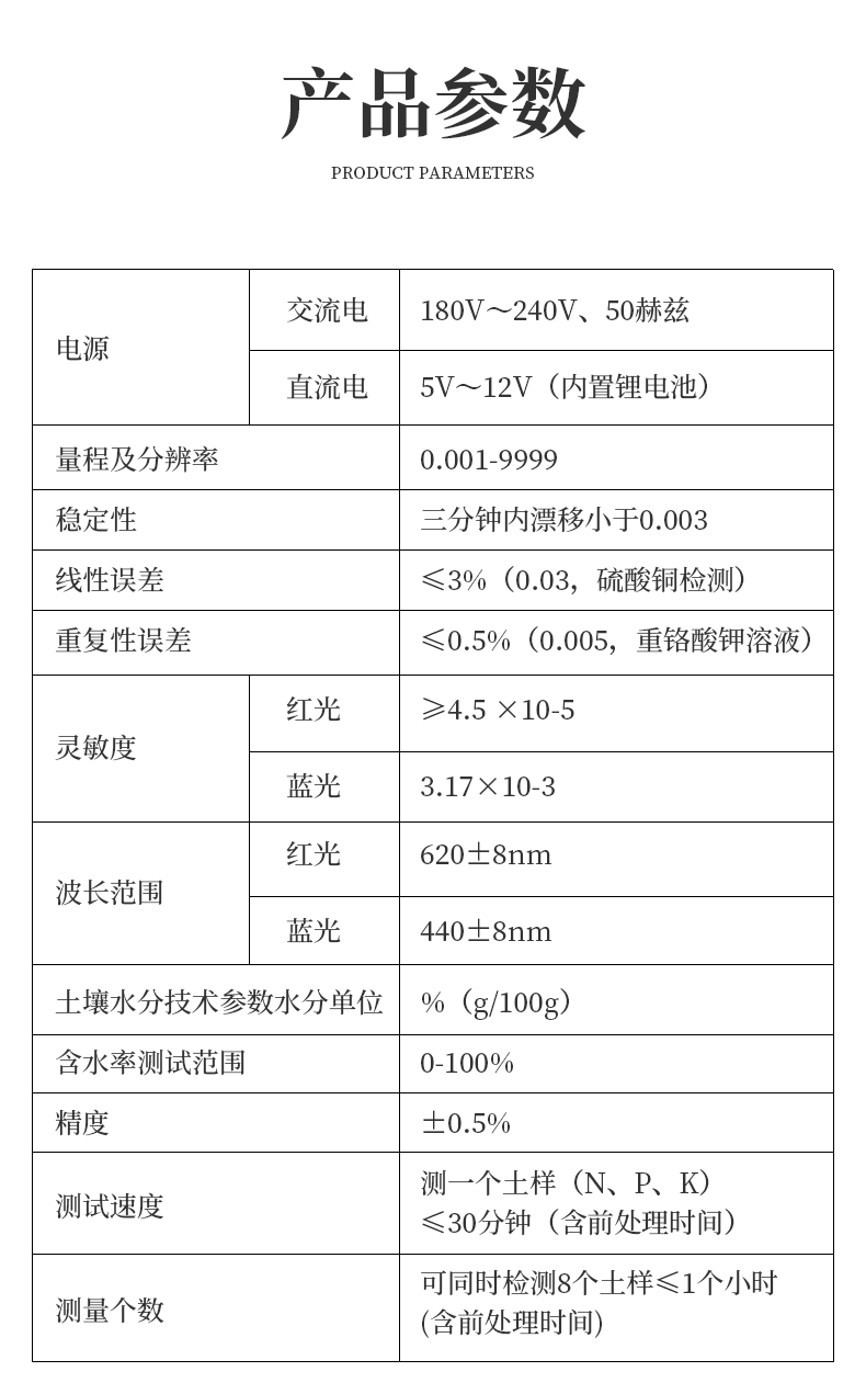 | 1.電源:交直流兩用,交流電:180V~240V、50赫茲;直流電:5V~12V(內(nèi)置鋰電池) | 2.量程及分辨率:0.001-9999 | 3.穩(wěn)定性:三分鐘內(nèi)漂移小于0.003 | 4.線性誤差:≤3%(0.03,硫酸銅檢測(cè)) | 5.重復(fù)性誤差:≤0.5%(0.005,重鉻酸鉀溶液) | 6.靈敏度:紅光≥4.5 ×10-5 藍(lán)光≥3.17×10-3 | 7.波長范圍:紅光620±8nm 藍(lán)光440±8nm | 8.土壤水分技術(shù)參數(shù)水分單位:%(g/100g)含水率測(cè)試范圍:0-100% 精度:±0.5% | 9.土壤中速效N、P、K三種養(yǎng)分一次性同時(shí)浸提測(cè)定、科學(xué)指導(dǎo)施肥 | 10.肥料中氮(N)、磷(P)、鉀(K)等養(yǎng)分同時(shí)、快速、準(zhǔn)確檢測(cè) | 11.測(cè)試速度:測(cè)一個(gè)土樣(N、P、K)≤30分鐘(含前處理時(shí)間) | 12.可同時(shí)檢測(cè)8個(gè)土樣≤1個(gè)小時(shí)(含前處理時(shí)間) | 13.數(shù)據(jù)打?。簝?nèi)置一鍵式熱敏打印機(jī)(國內(nèi)率先**設(shè)計(jì)) | 14.儀器尺寸:492*305*165mm |