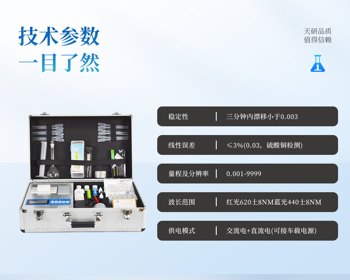 | 功能全:測(cè)試項(xiàng)目國(guó)內(nèi)外全面(各類藥劑均可選購)。 | 配套齊全,該儀器集藥、器、儀為一體,攜帶方便,相當(dāng)于一個(gè)小型實(shí)驗(yàn)室,用戶只需提供蒸餾水即可在要求時(shí)間內(nèi)完成全部操作。適于農(nóng)業(yè)服務(wù)部門或農(nóng)資經(jīng)銷商鑒別肥料真假、肥料廠商肥料生產(chǎn)中控、農(nóng)資質(zhì)檢部門進(jìn)行農(nóng)資打假,規(guī)范農(nóng)資市場(chǎng)。 | 性能可靠:工作穩(wěn)定性優(yōu)于國(guó)家標(biāo)準(zhǔn)JJG179-90指標(biāo)的10倍以上,重復(fù)性達(dá)到光柵型分光光度計(jì)指標(biāo)水平。 |