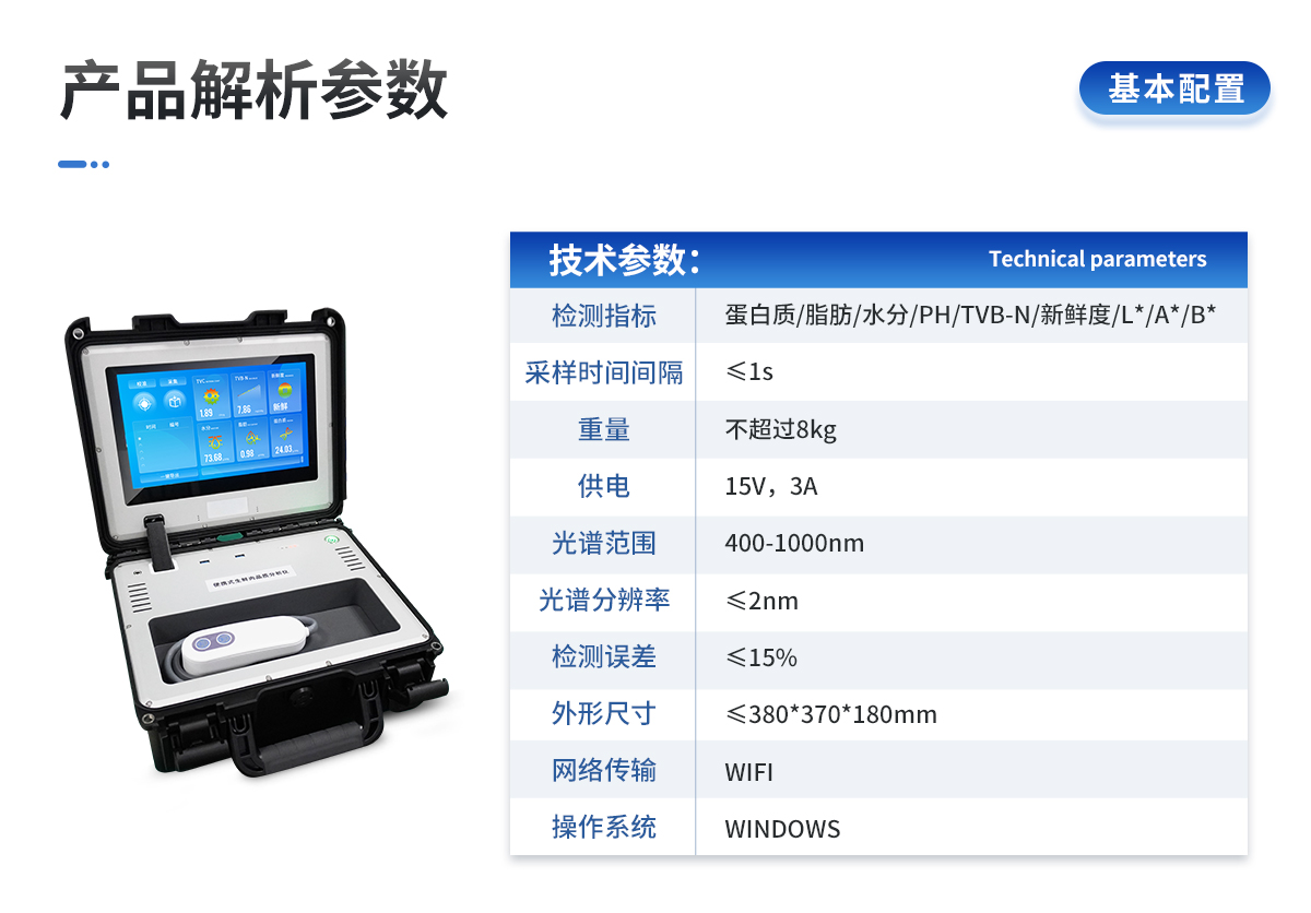 | 1. ※檢測指標(biāo):蛋白質(zhì)、脂肪、水分、PH、TVB-N、新鮮度、L*、A*、B* | 2. 采樣時間間隔:≤1s | 3. 重量:不超過8kg | 4. 供電:15V,3A | 5. 觸摸液晶顯示屏操作,屏幕尺寸不小于11寸 | 6. ※光譜范圍:400-1000nm | 7. ※光譜分辨率:≤2nm | 8. 檢測誤差:≤15% | 9. ※提供模型自動優(yōu)化平臺,用戶可通過設(shè)備建立和優(yōu)化算法模型 | 10. 外形尺寸:≤380*370*180mm | 11. 網(wǎng)絡(luò)傳輸:WIFI | 12. 操作系統(tǒng):WINDOWS | 13. 采用便攜式手提箱設(shè)計,外殼為ABS防沖擊材料,適合在現(xiàn)場快速檢測 |